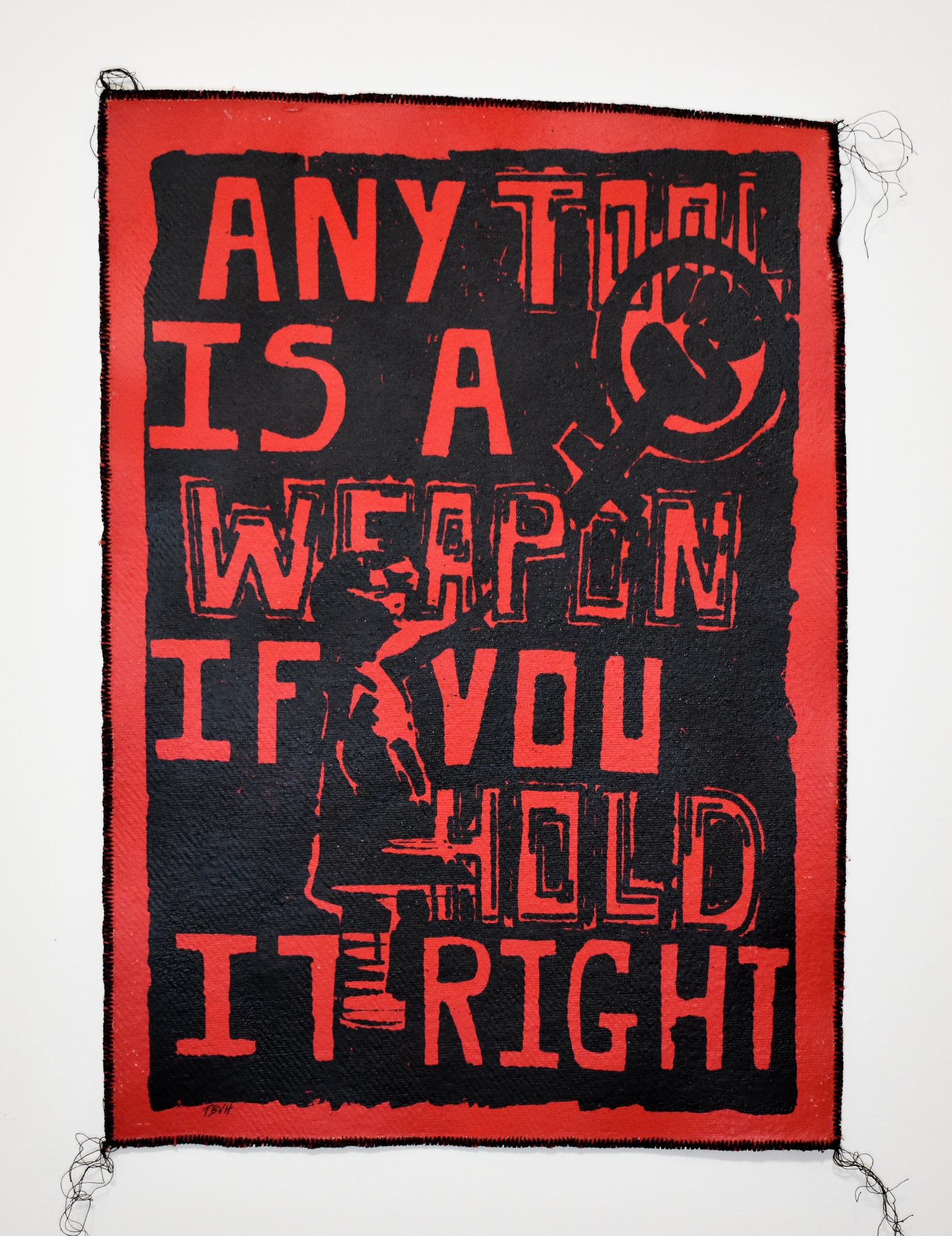 Screen Print in Black Ink on Red Spray Painted Cotton Rag Card with Black Machine Stitch Border (5/13 & 6/13). 2 Prints available, due to the nature of the technique they differ slightly.