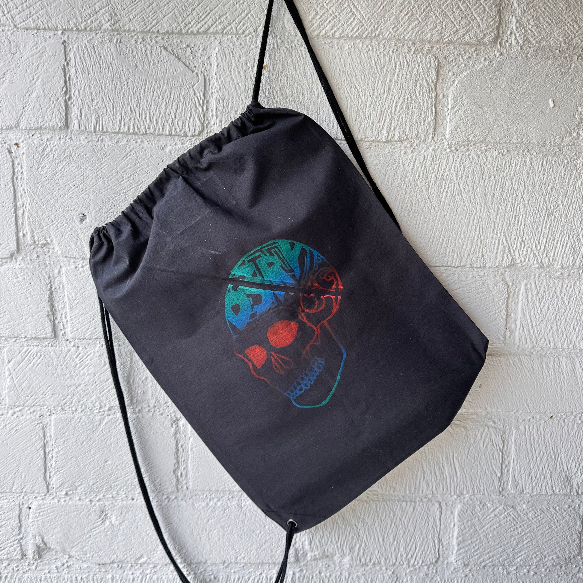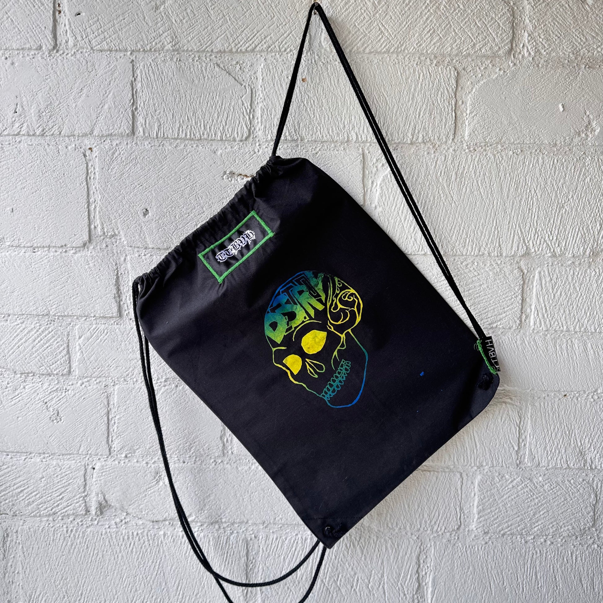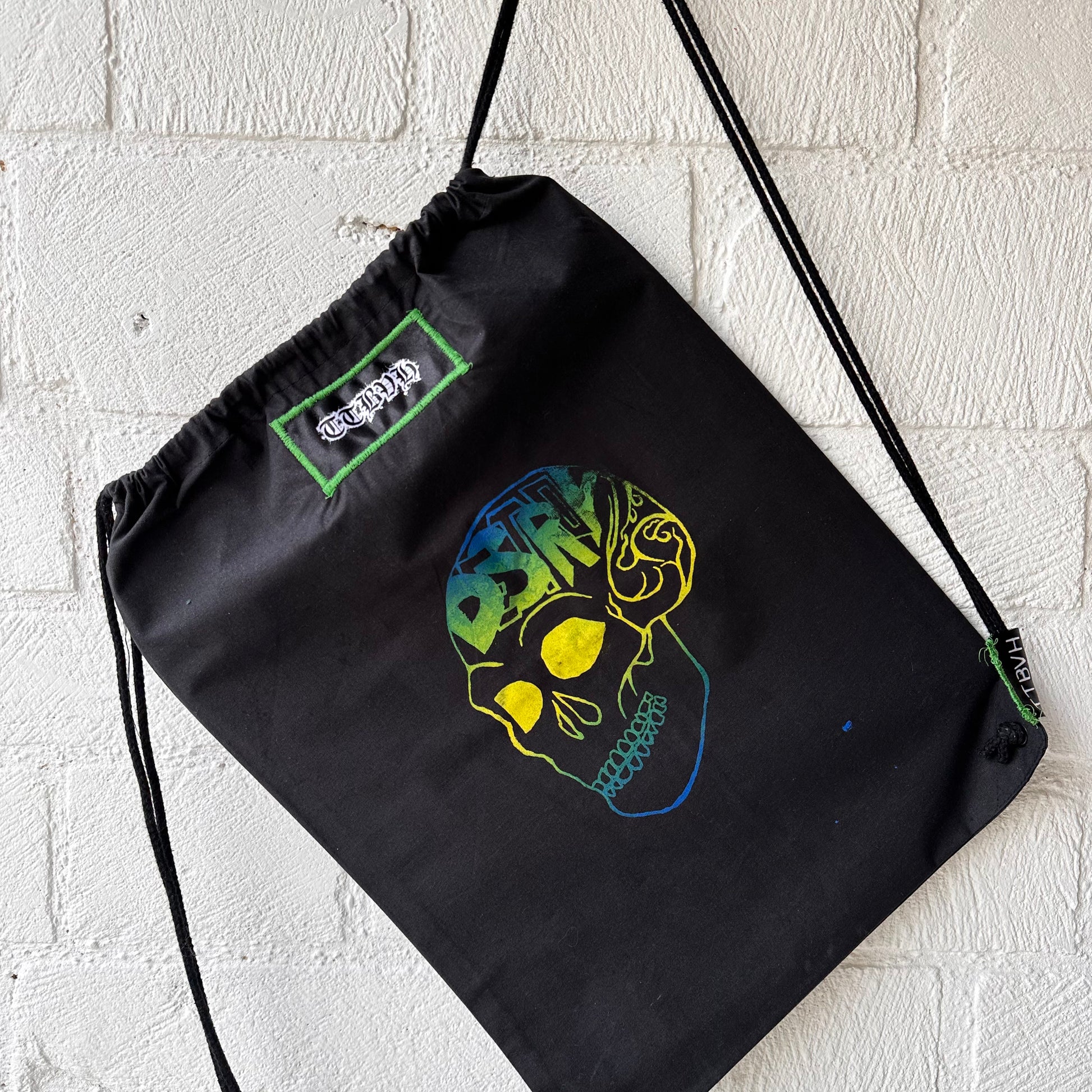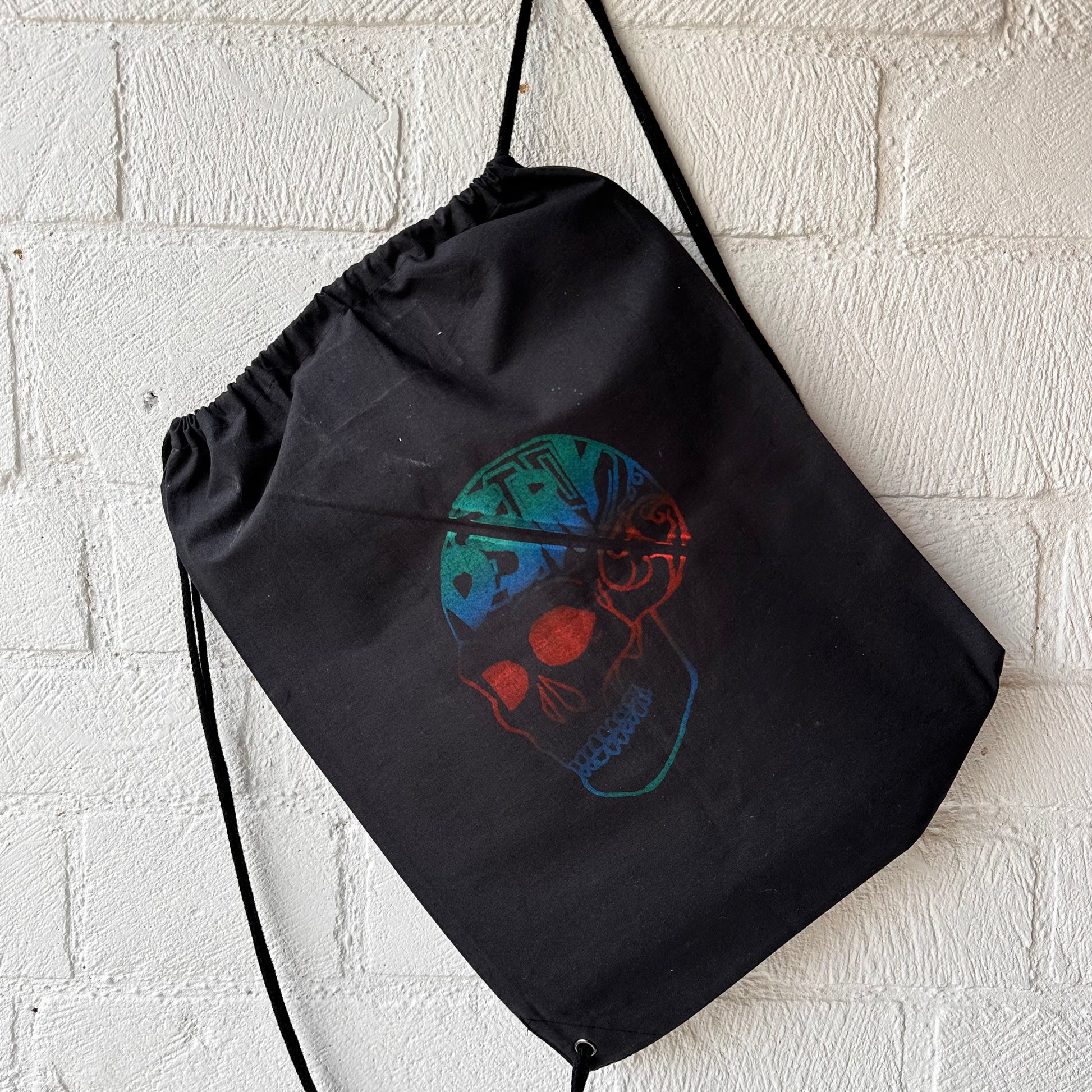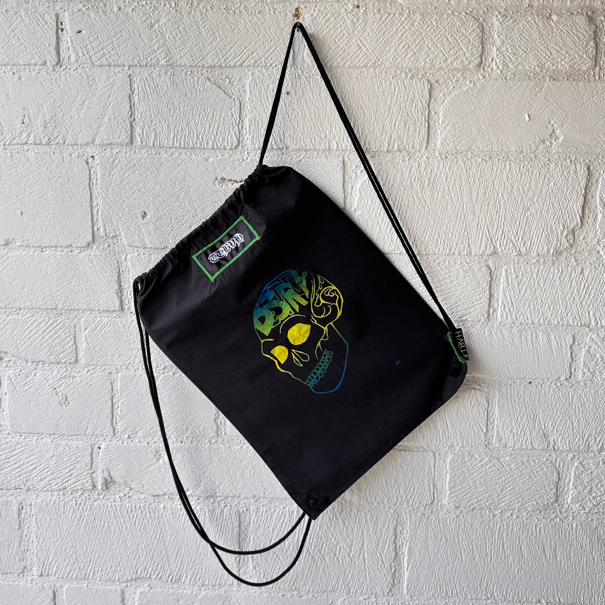 Black Draw String Bag with Destroy Series Screen Print in Blue, Yellow, Green and Red Ink