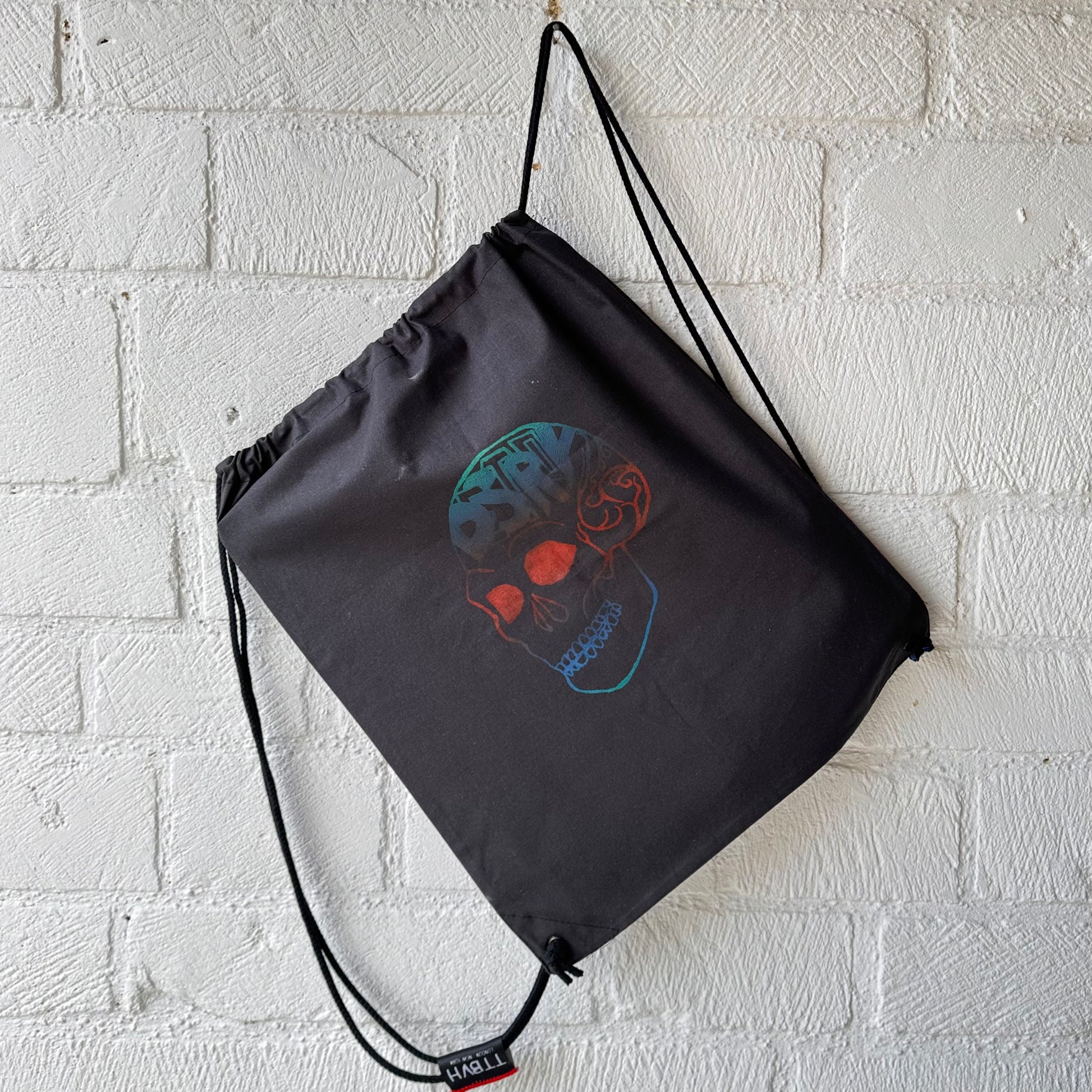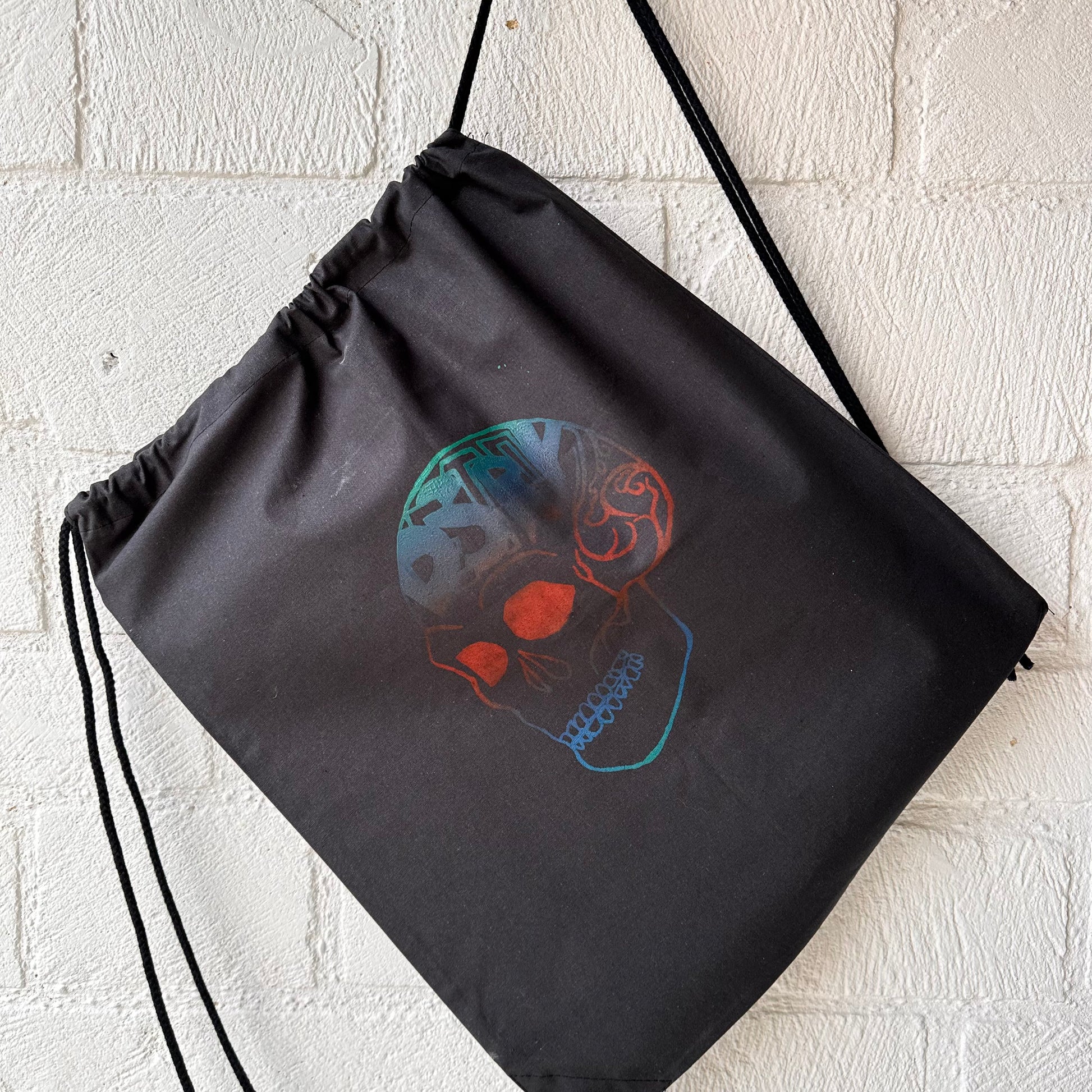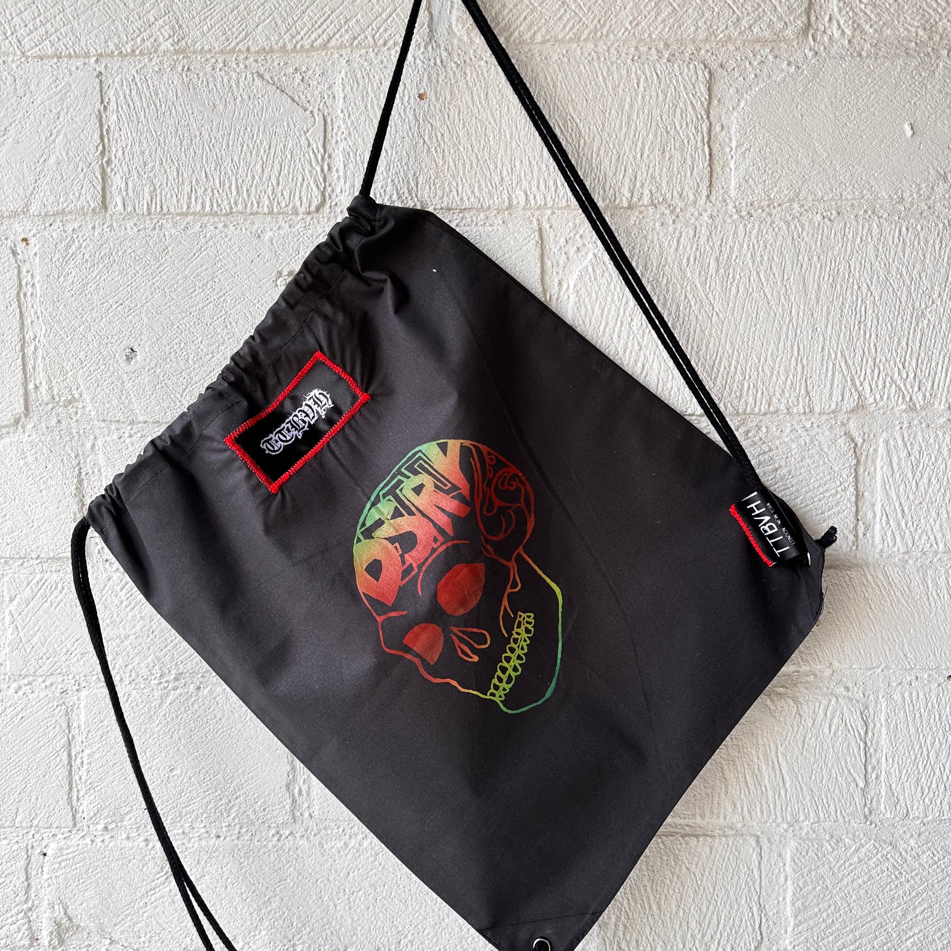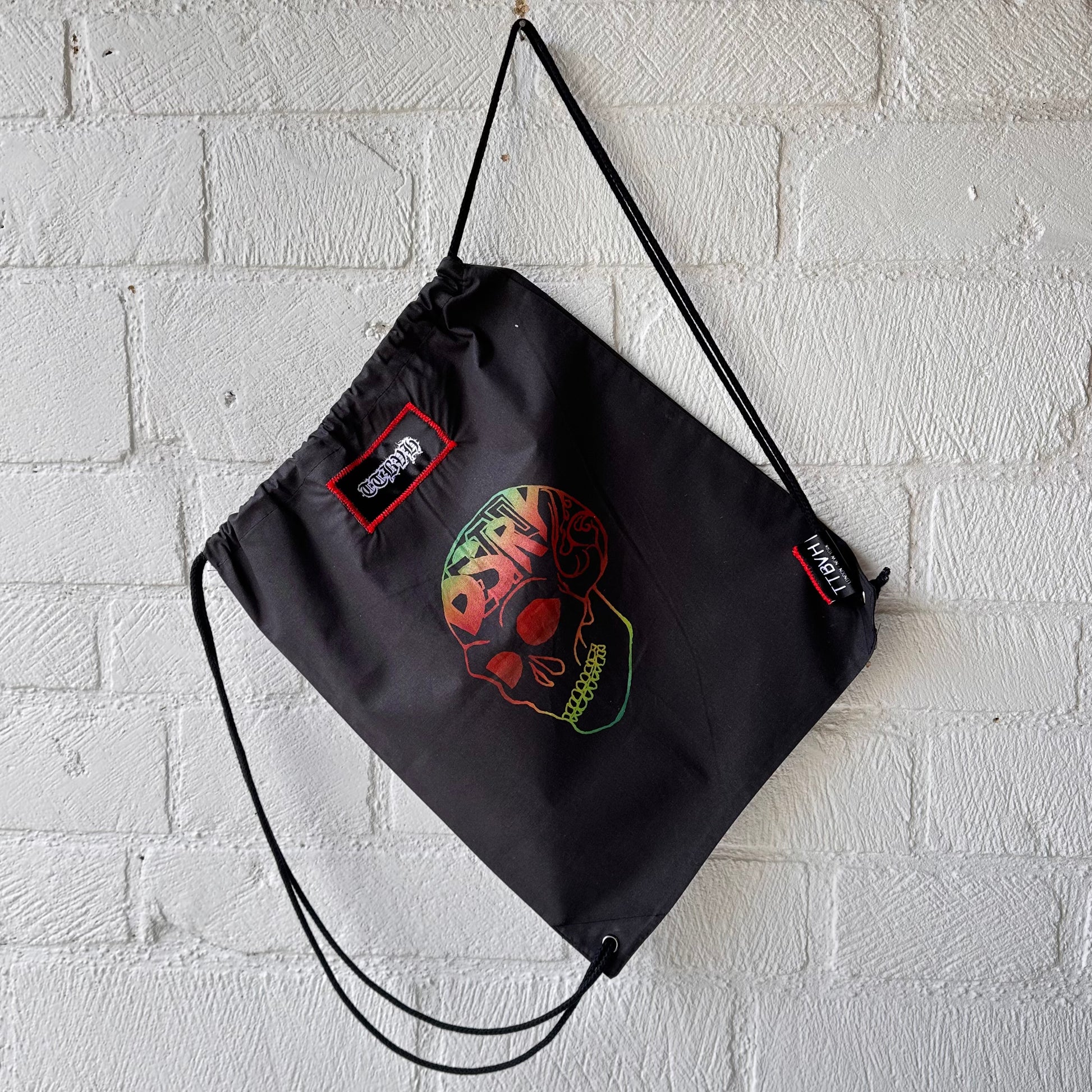 Black Draw String Bag with Destroy Series Screen Print in Green, Red and Blue Ink.