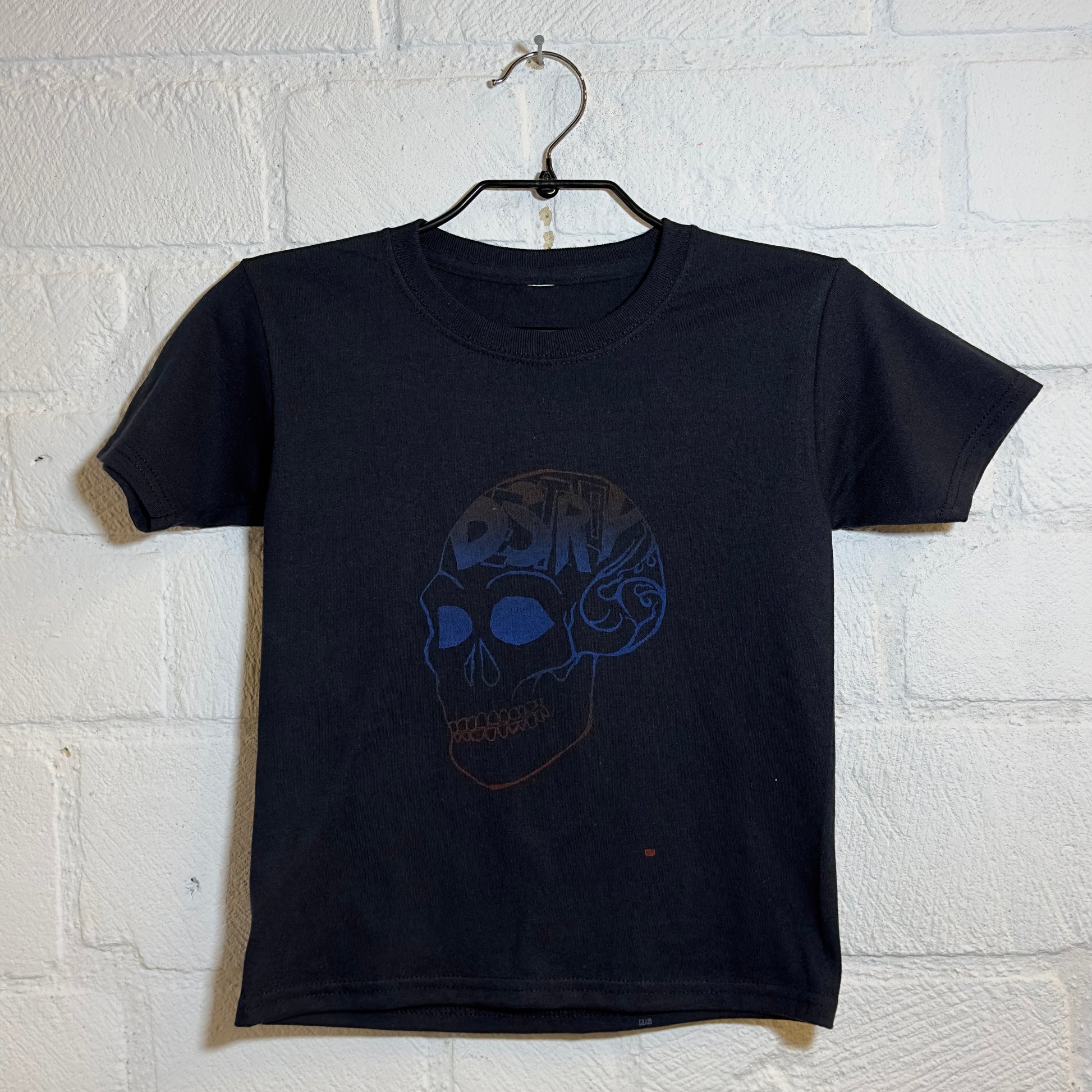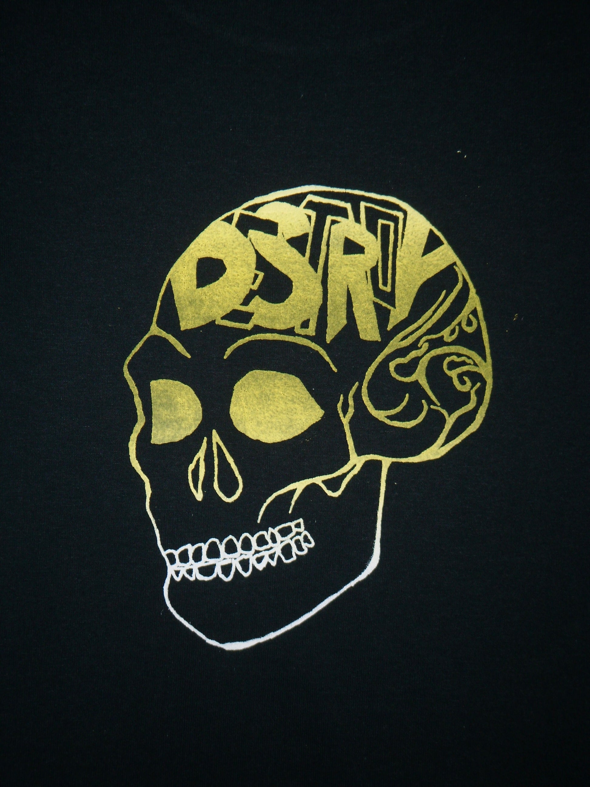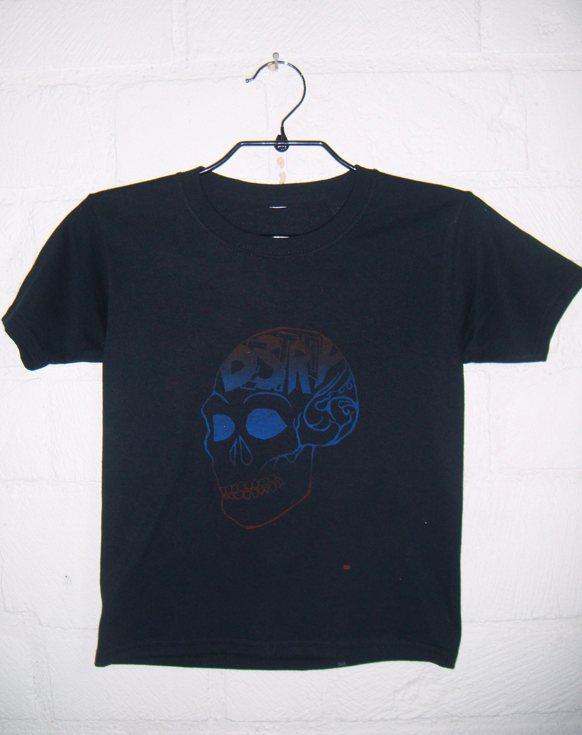Black Baby Tee with Destroy Series Skull Screen Print in Blue, Red, Yellow and White Ink. (4/18)