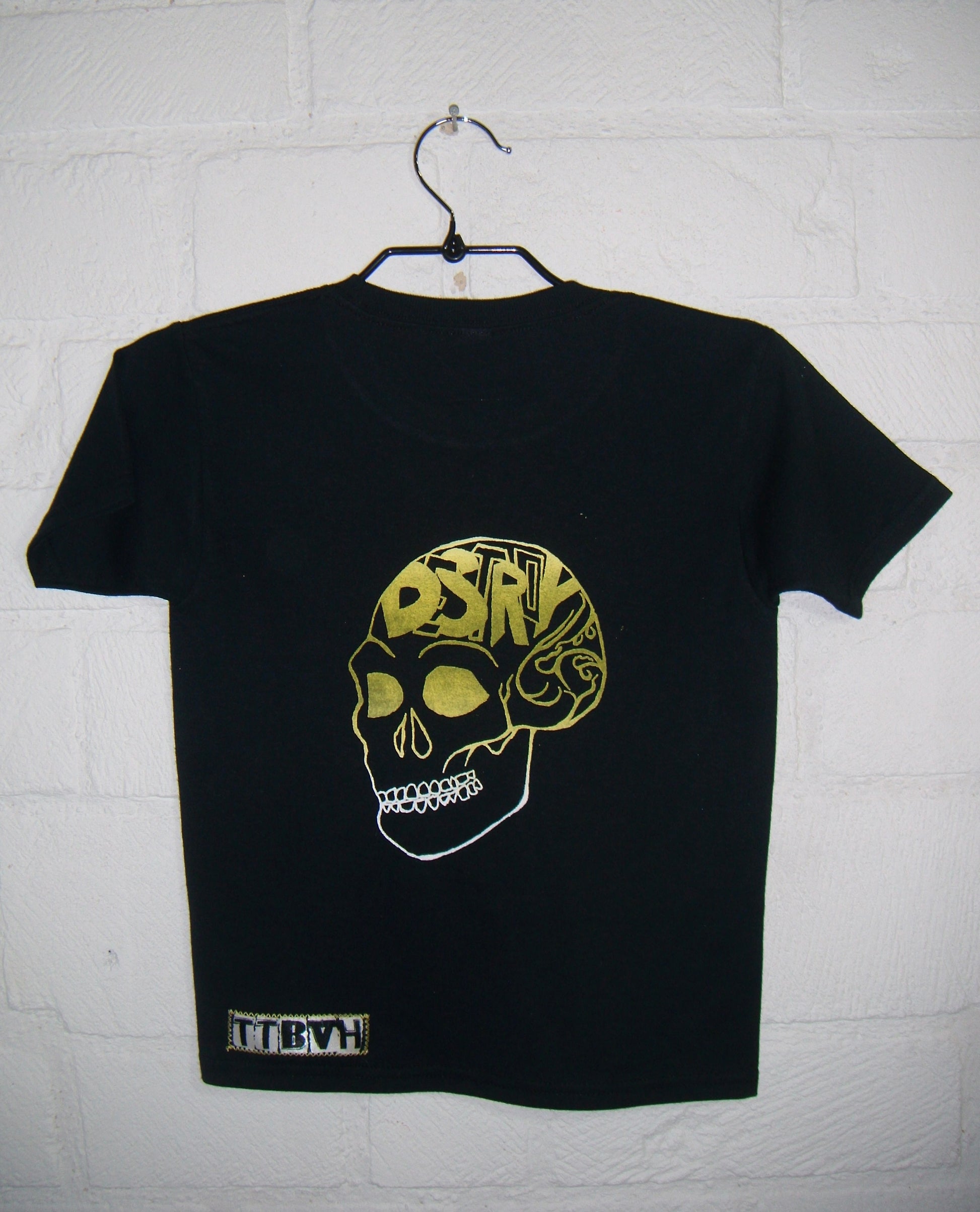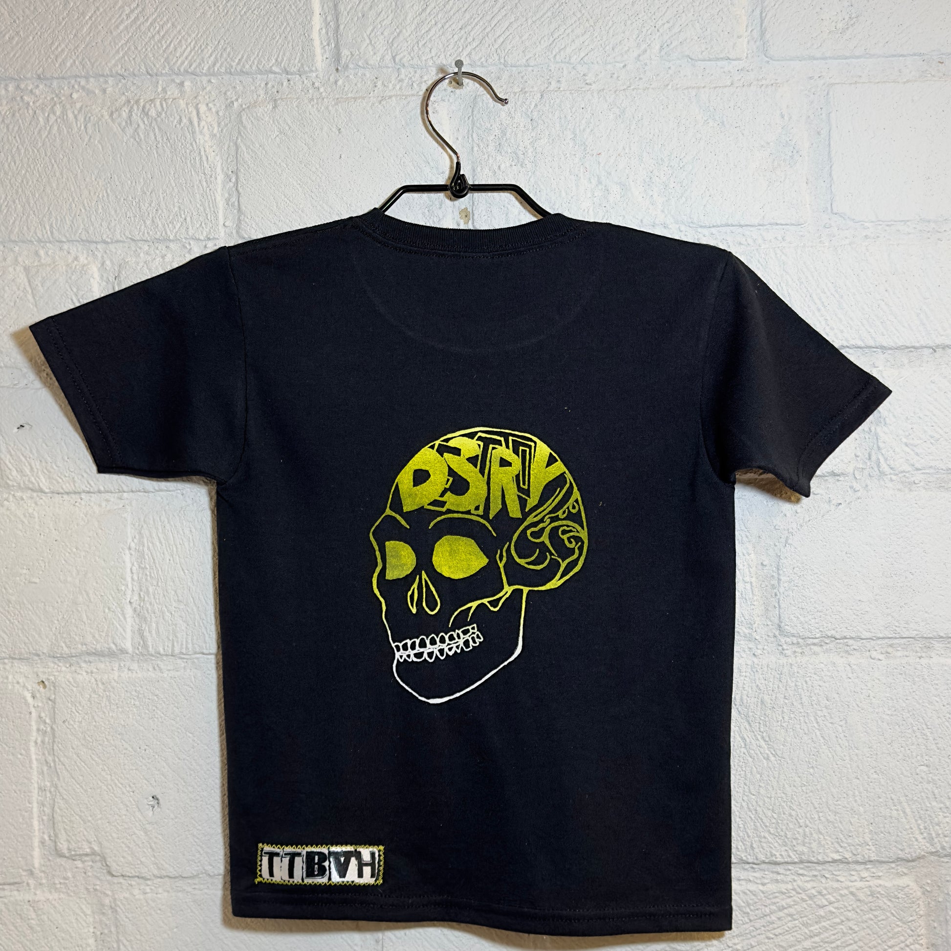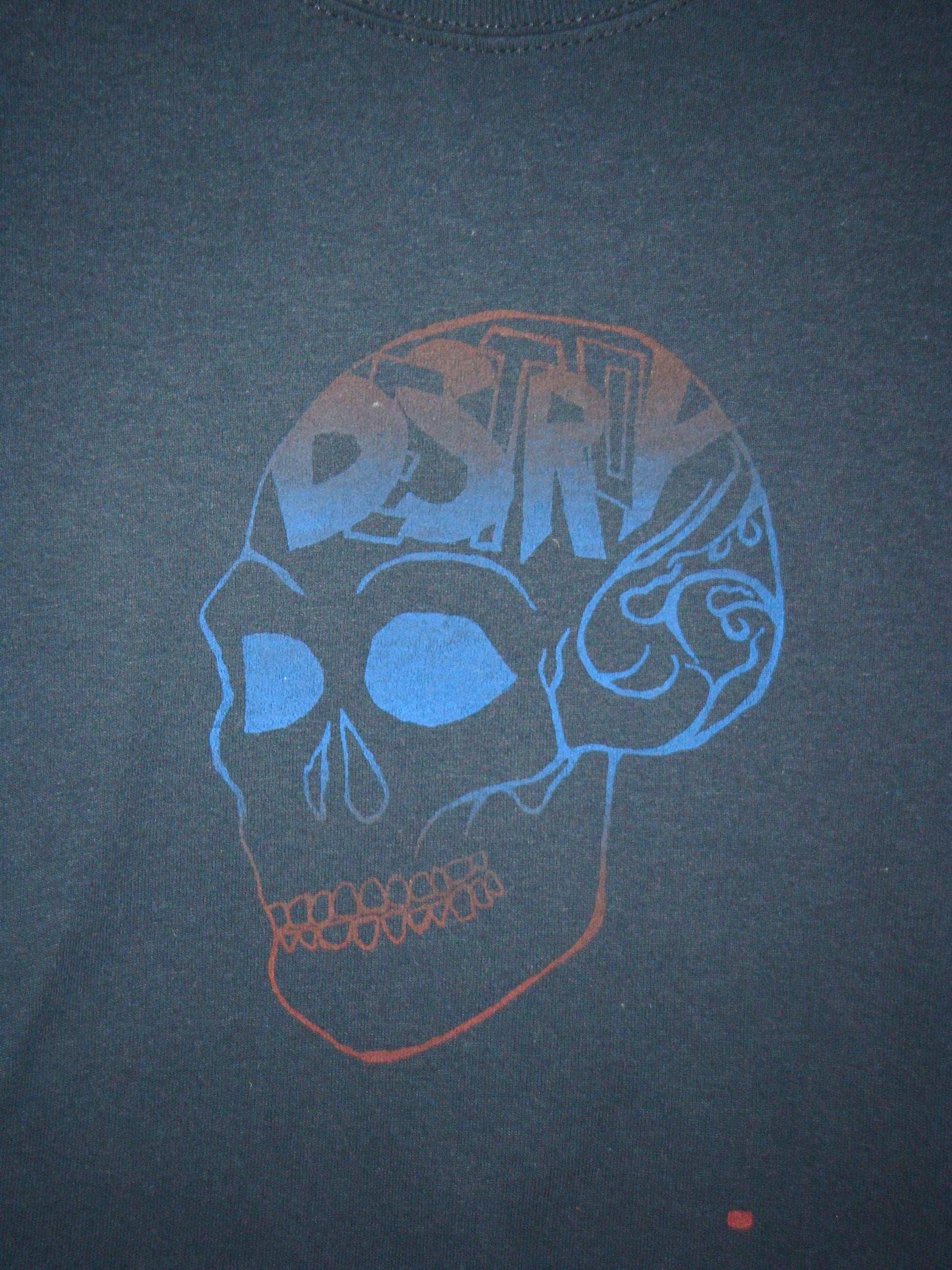 Black Baby Tee with Destroy Series Skull Screen Print in Blue, Red, Yellow and White Ink. (4/18)