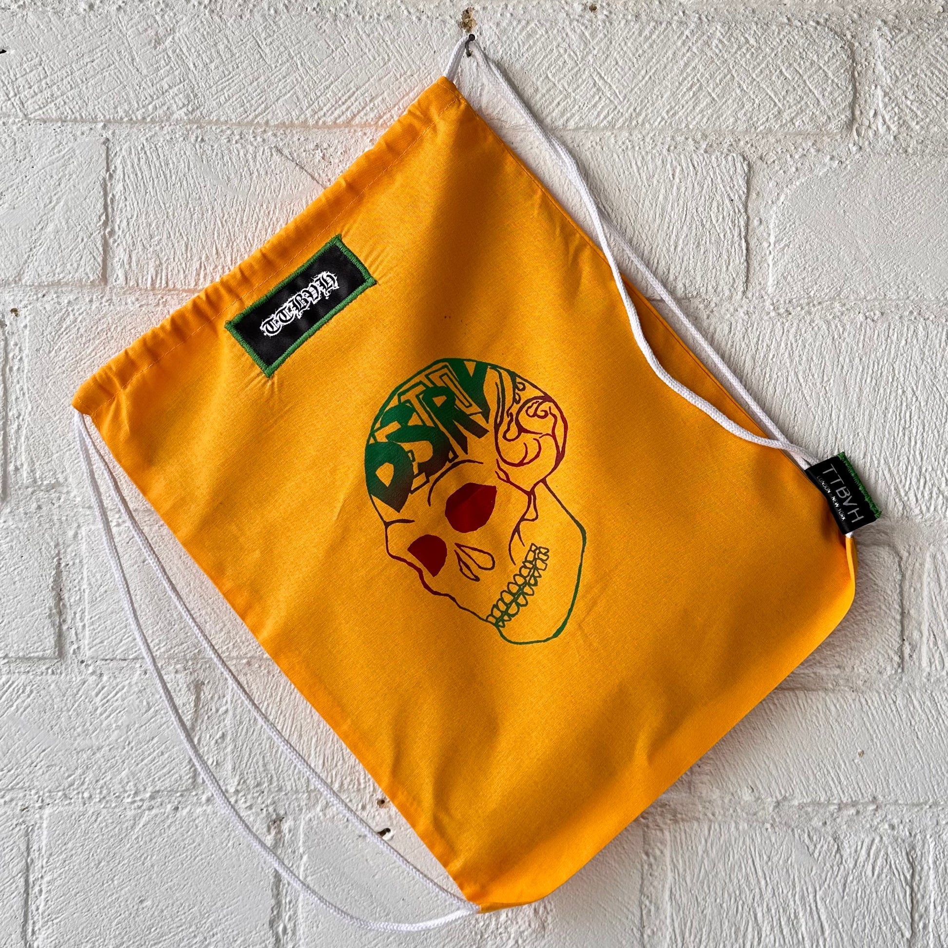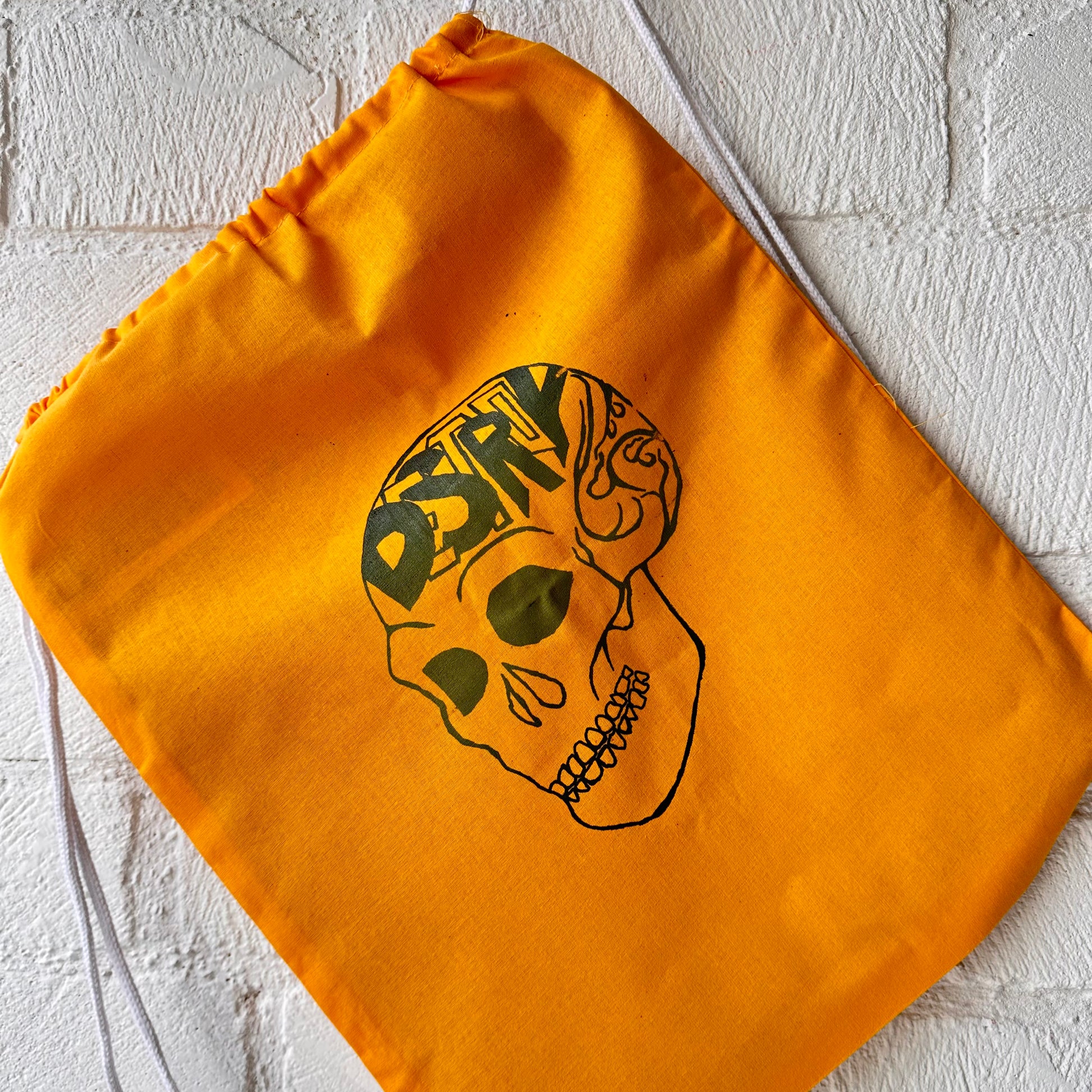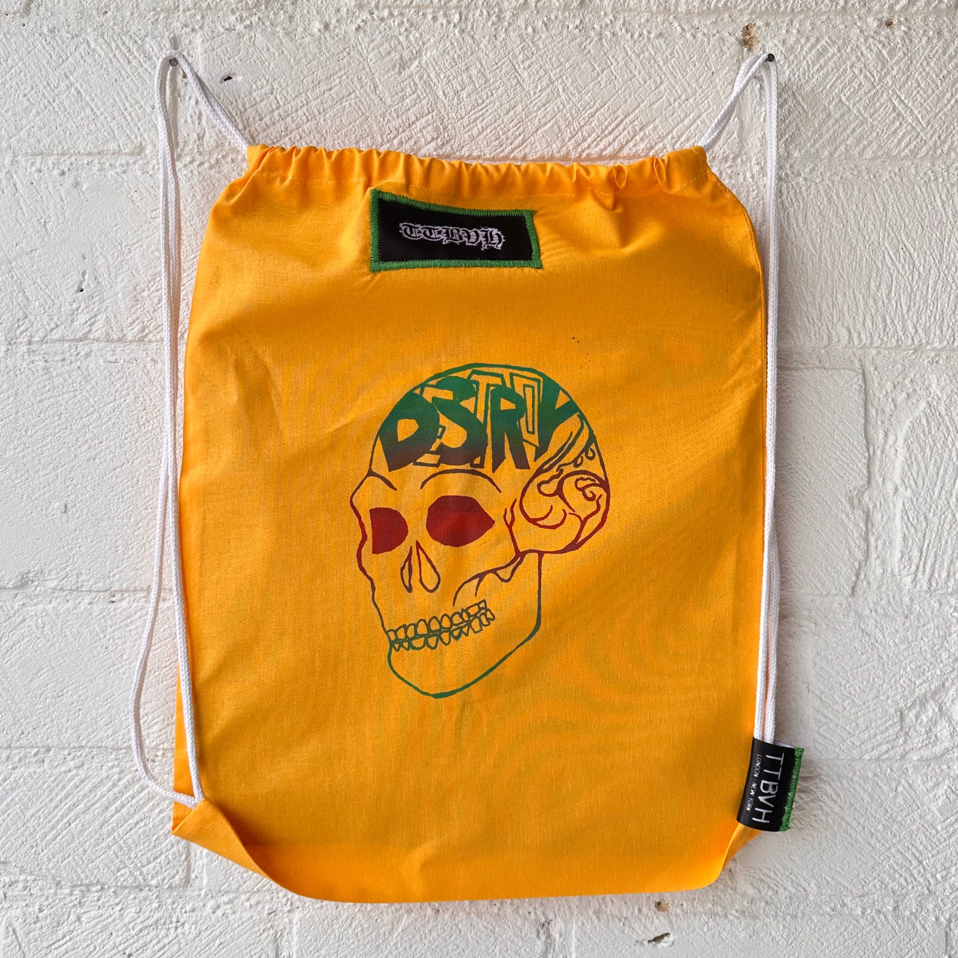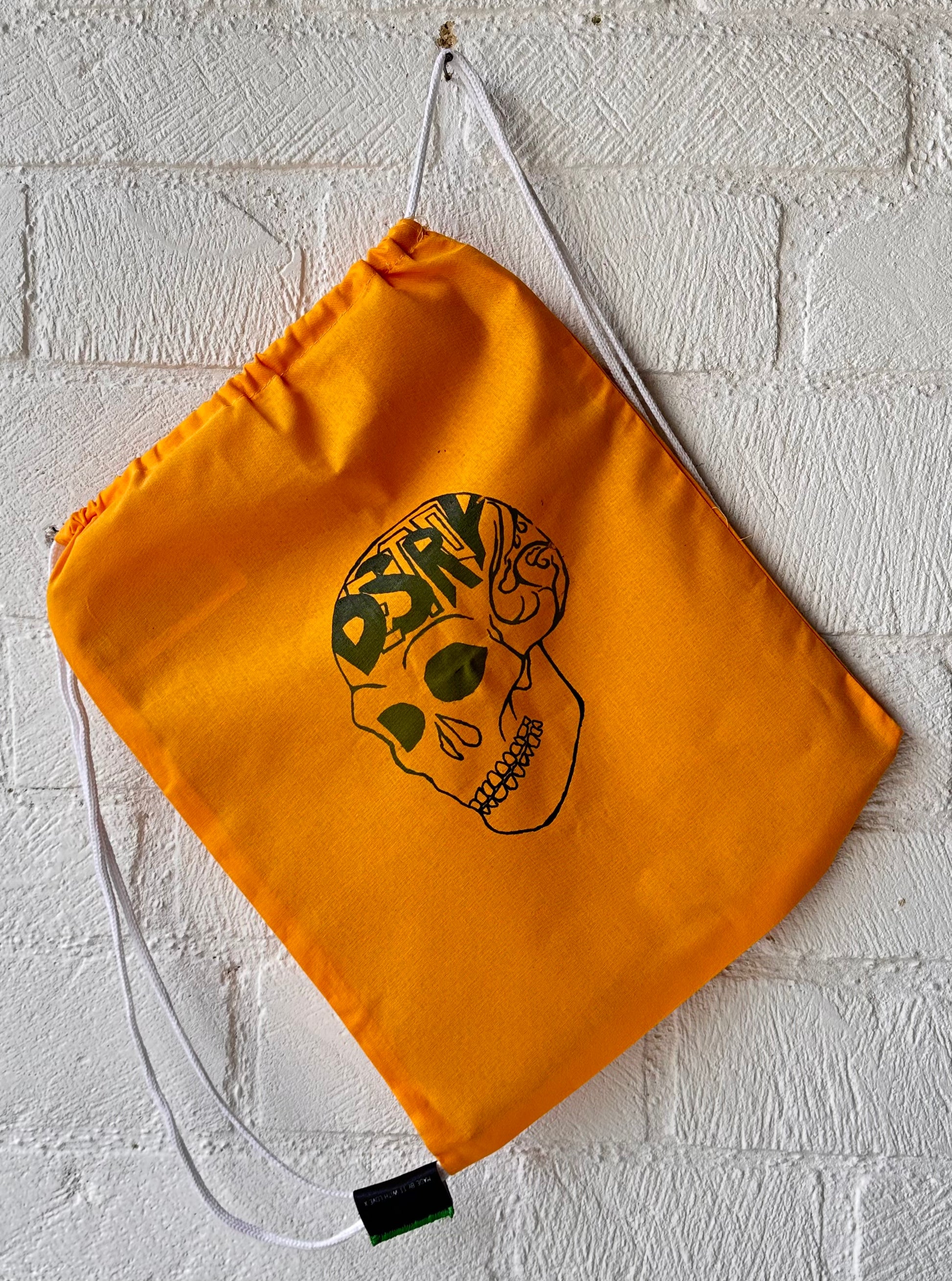 Orange Draw String Bag with Destroy Series Screen Print in Red and Green Ink.
