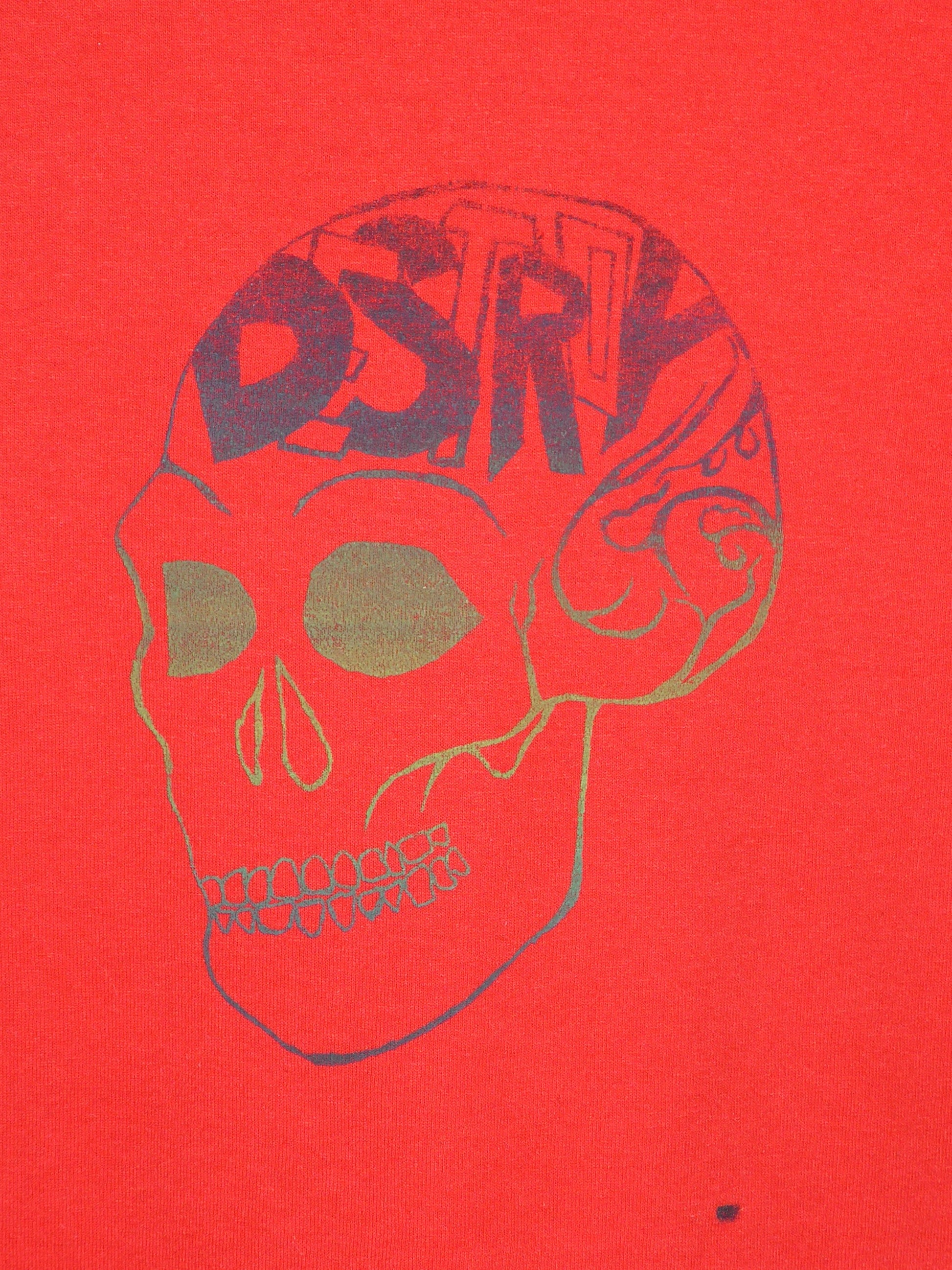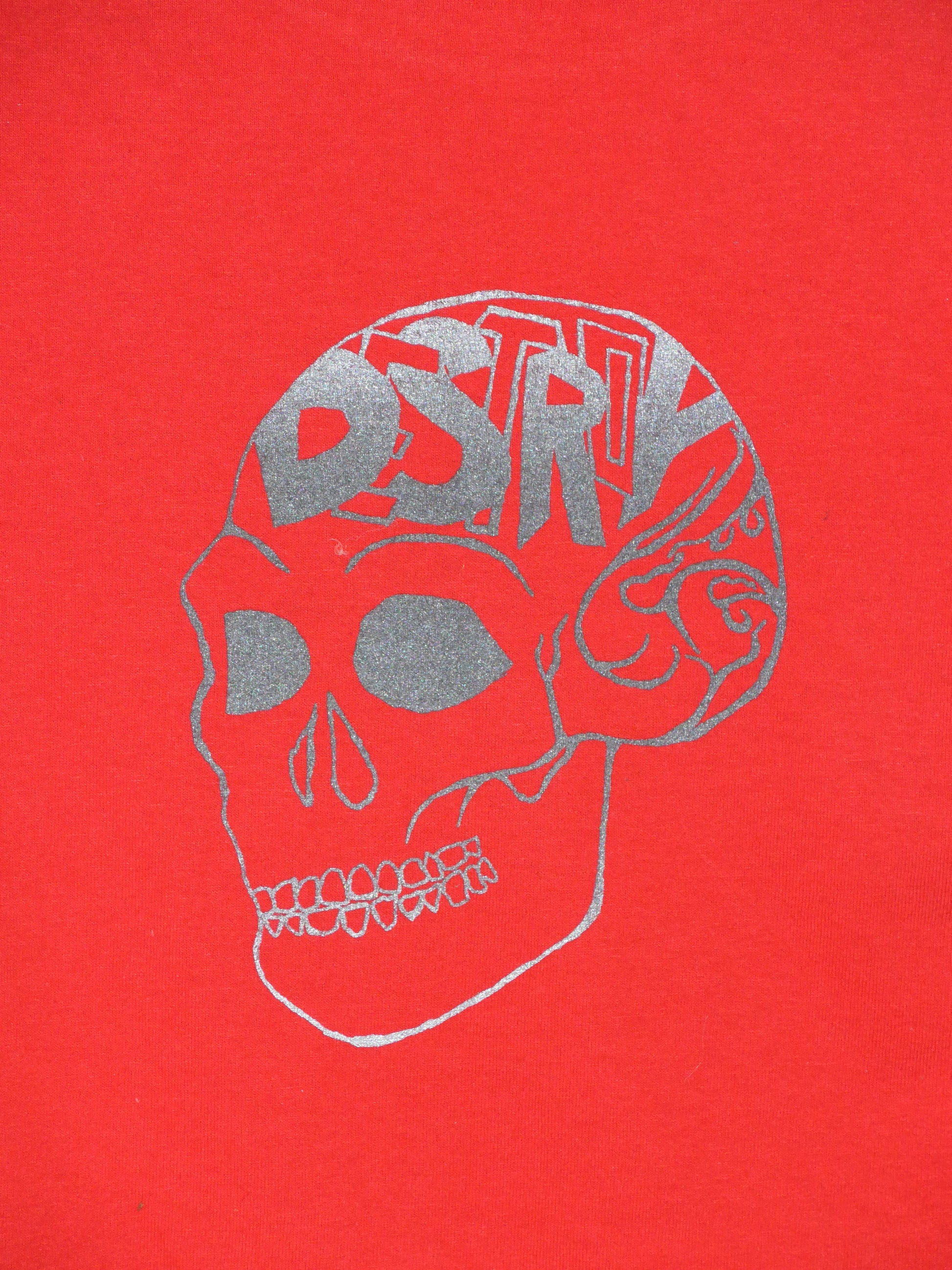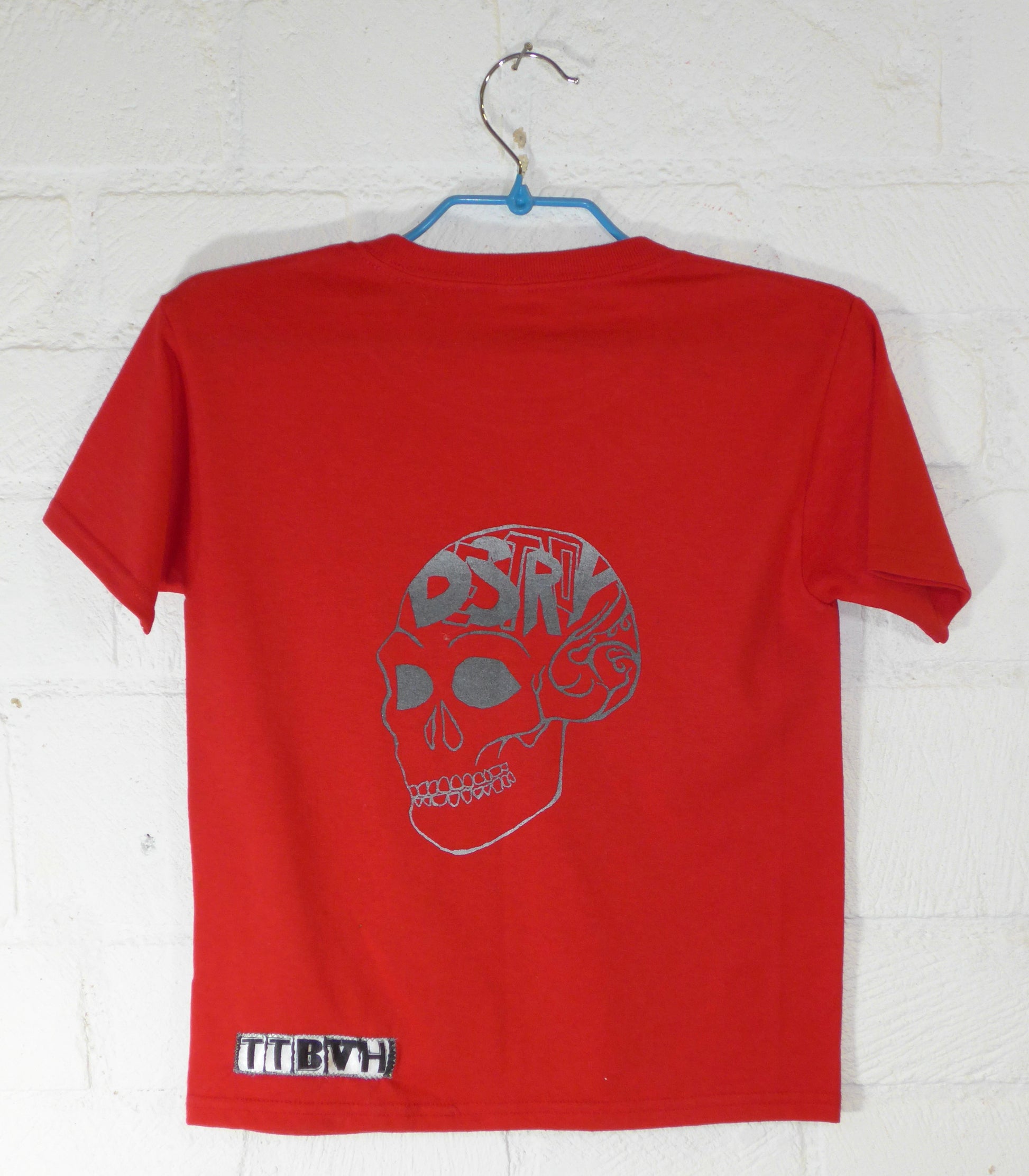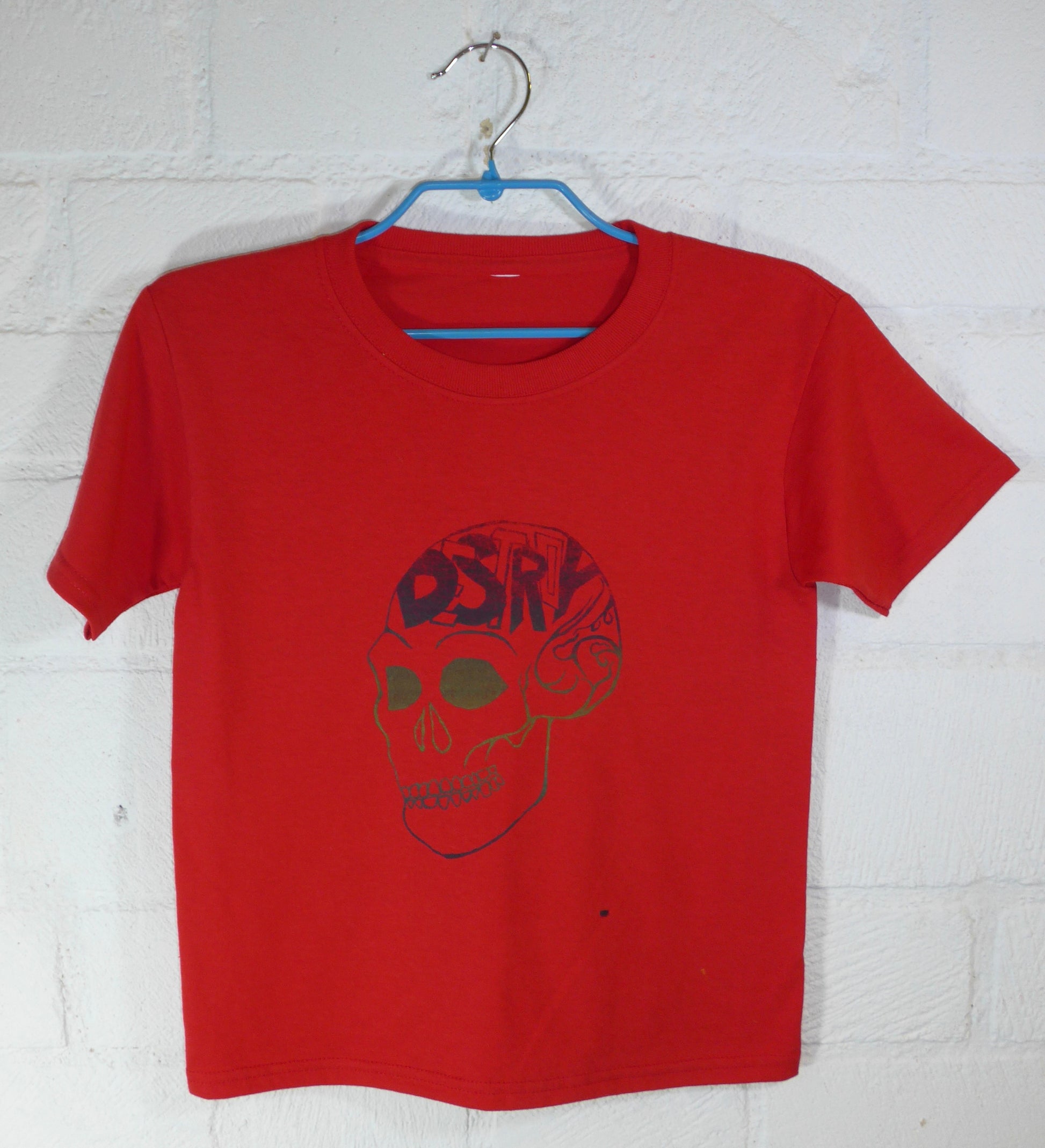Red Baby Tee with Destroy Series Skull Screen Print in Black, Green and Silver Ink. (8/18)
