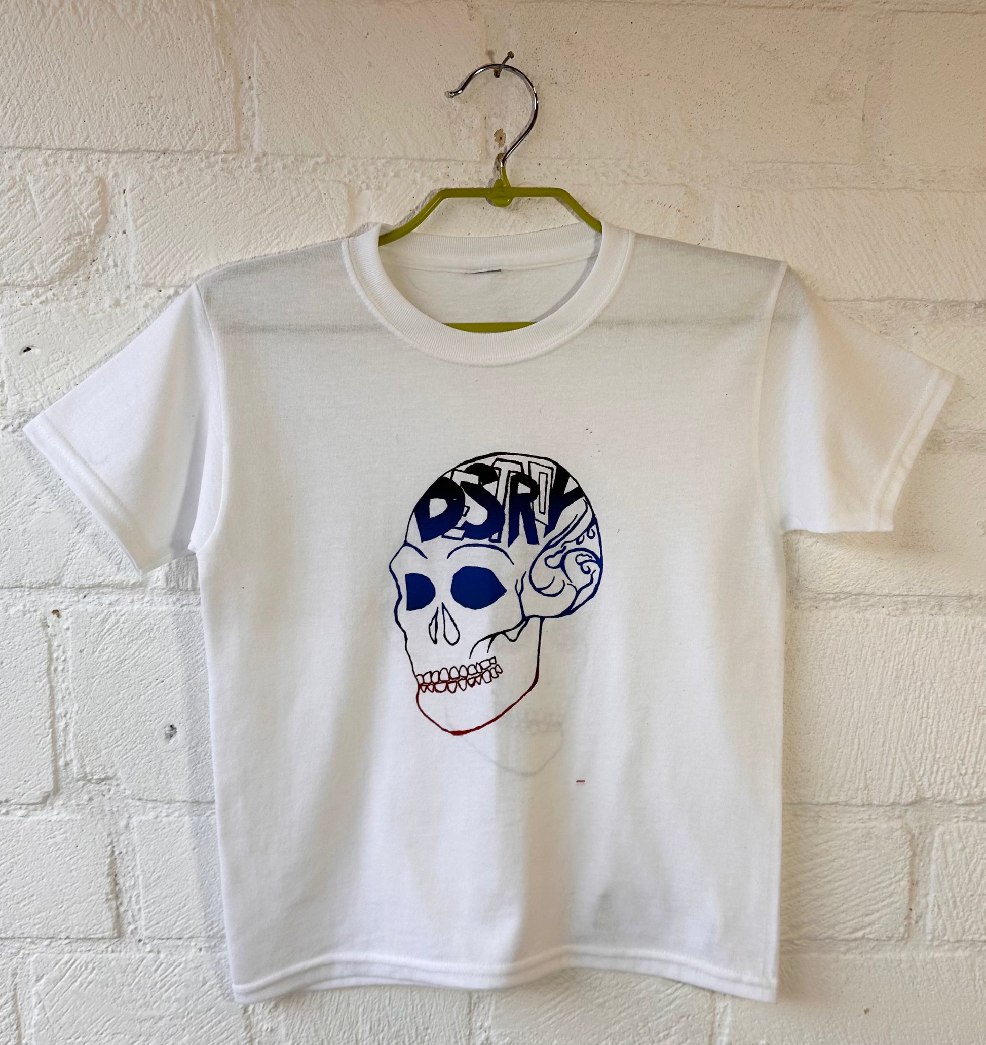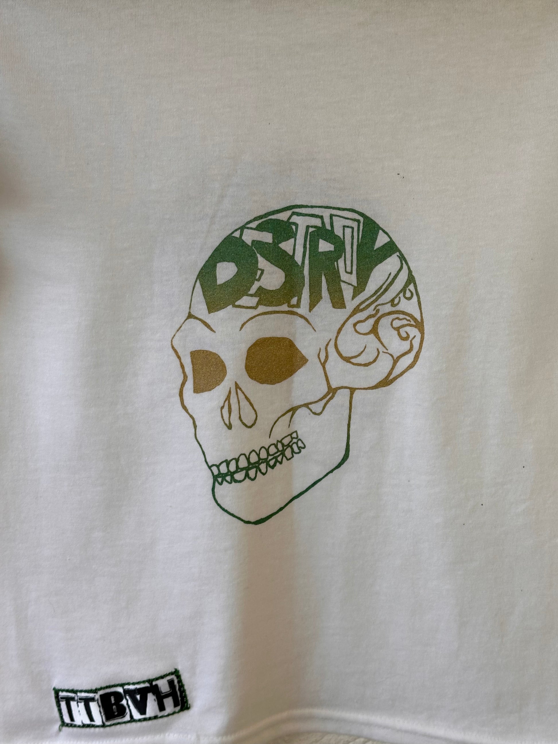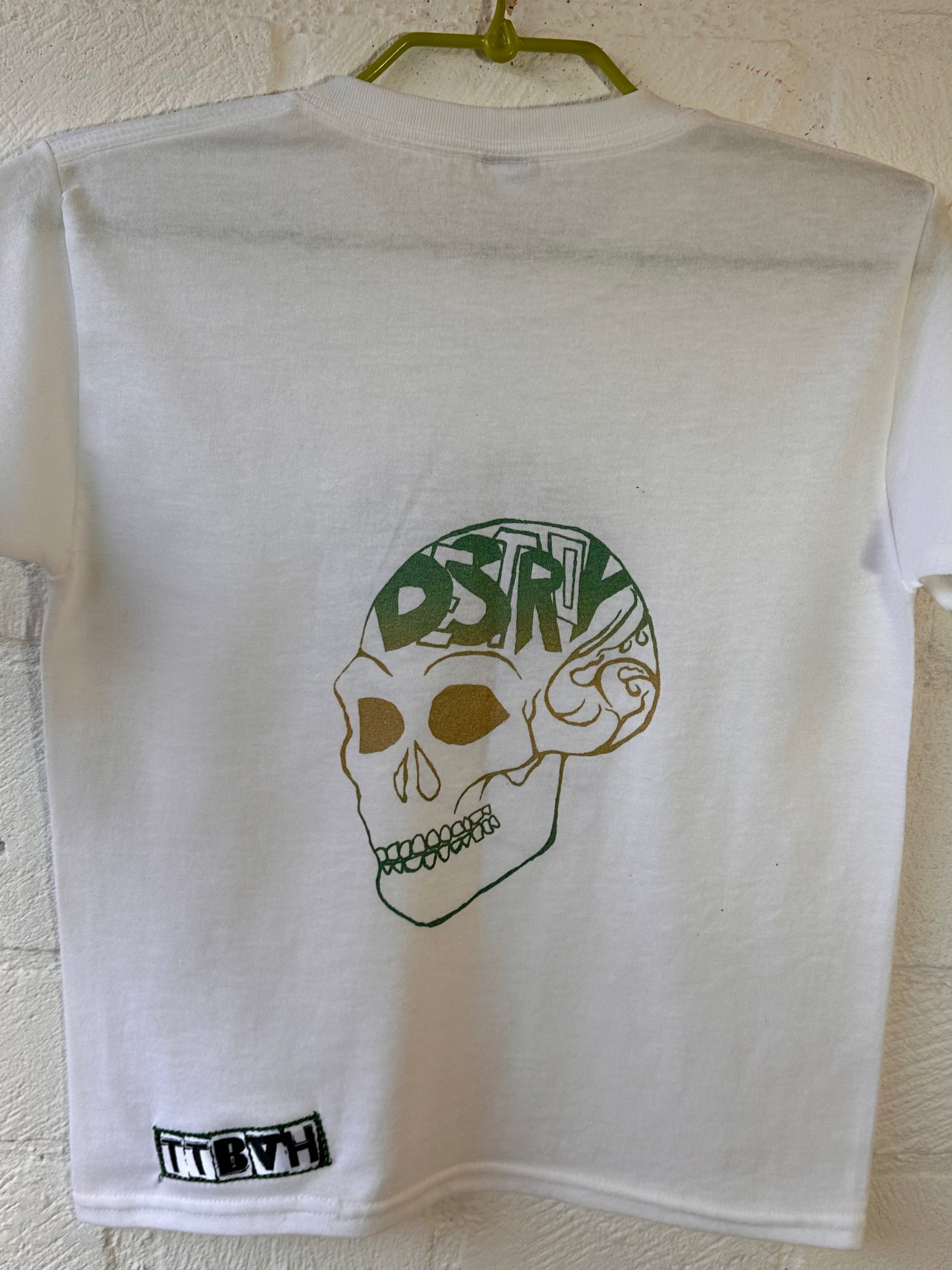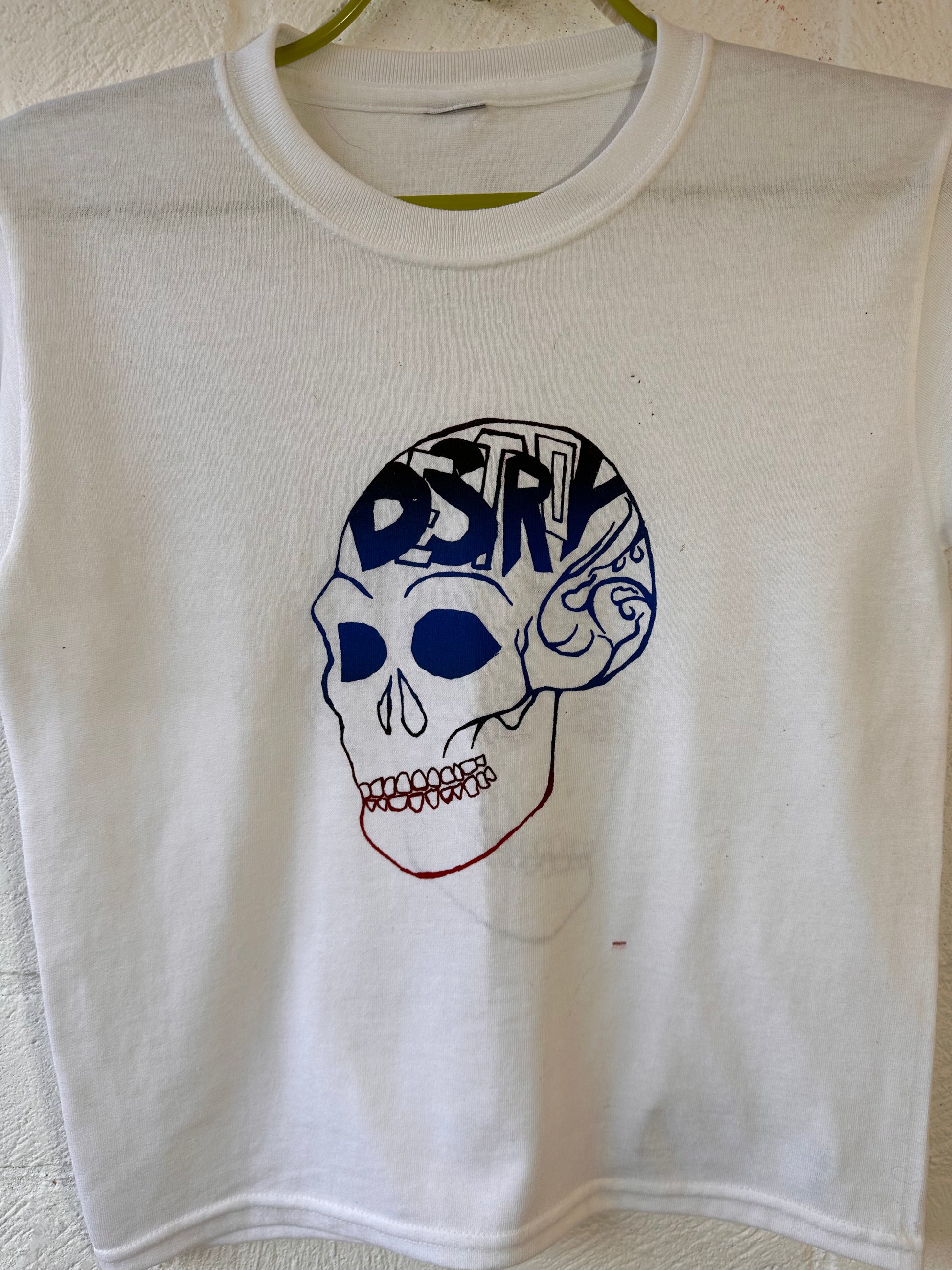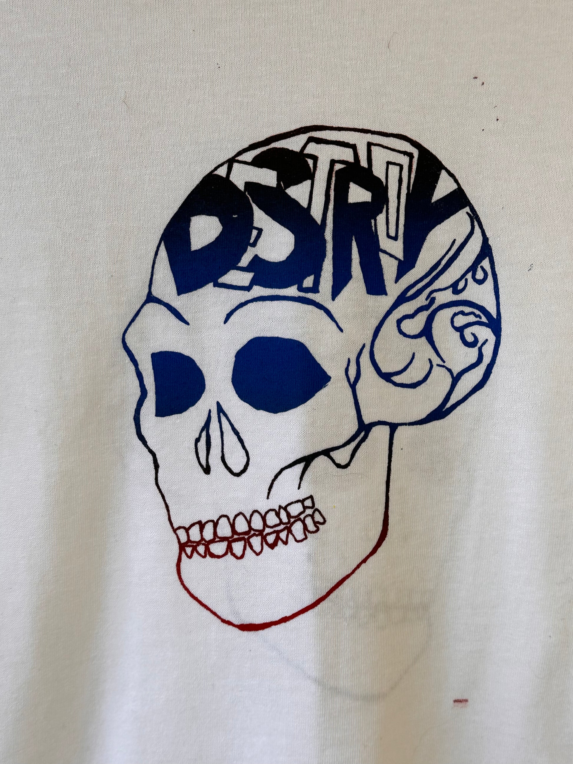 White T-Shirt with Destroy Series Skull Screen Print in Blue, Red, Green and Gold Ink. (10/18)