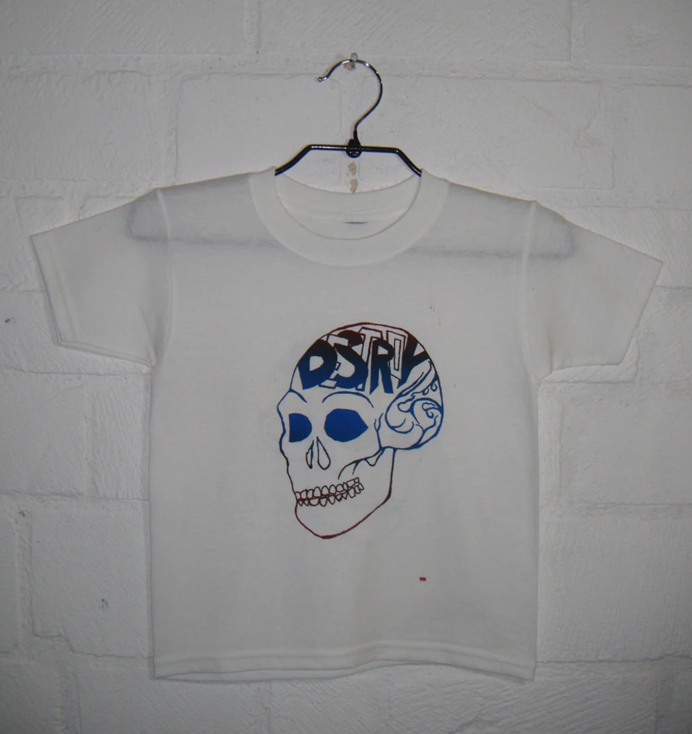 White Baby Tee with Destroy Series Skull Screen Print in Blue, Red, Yellow and Green Ink