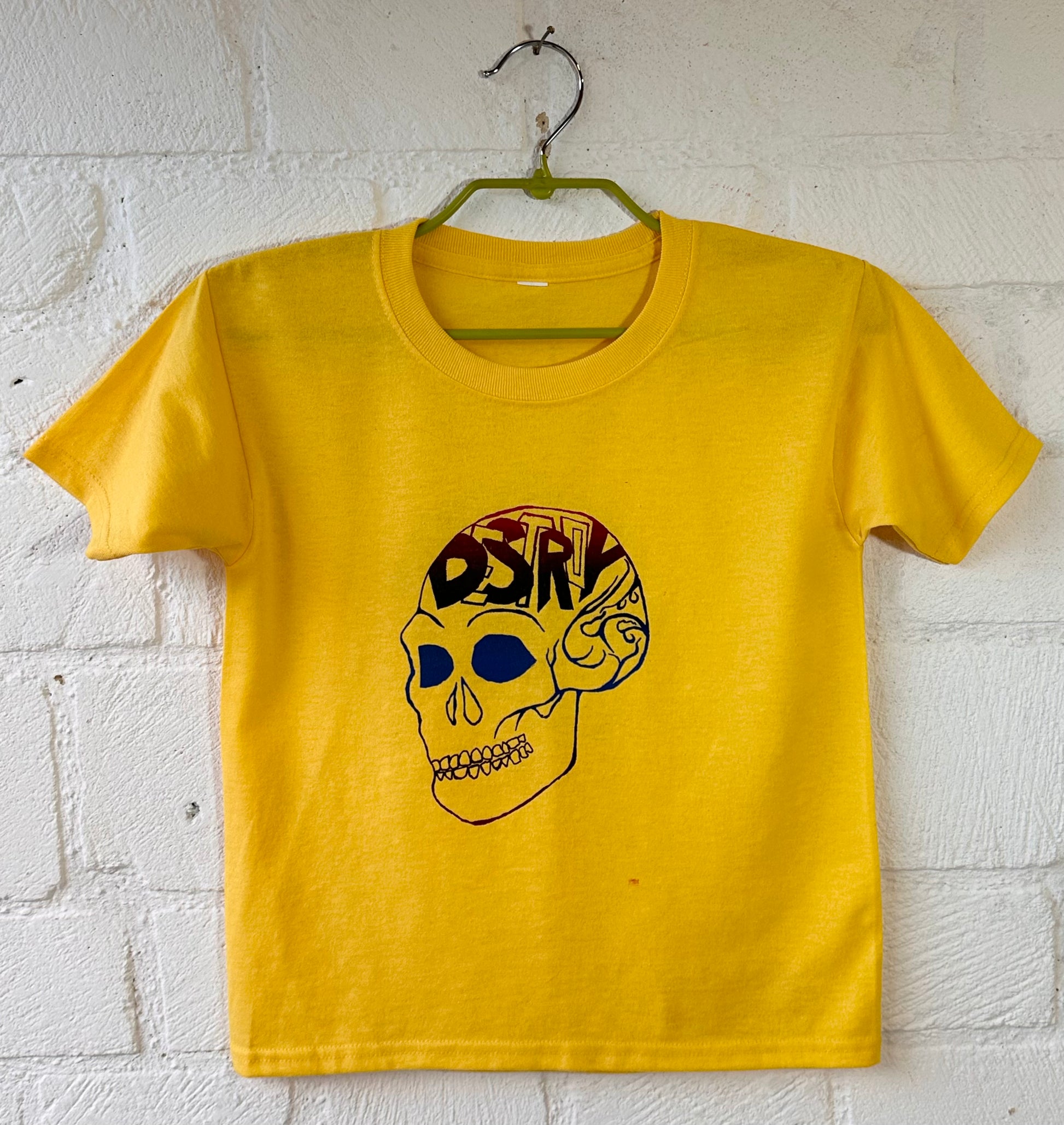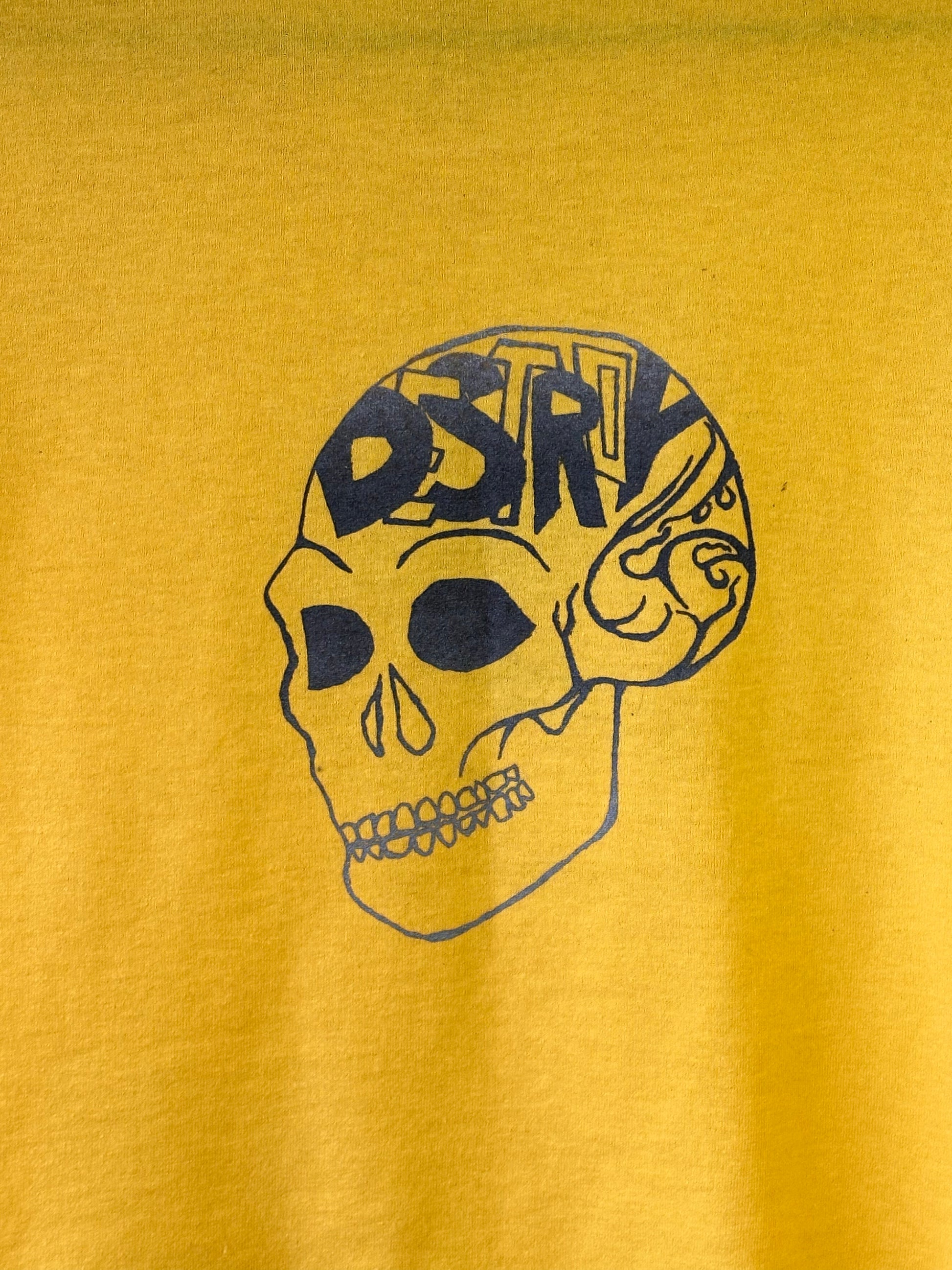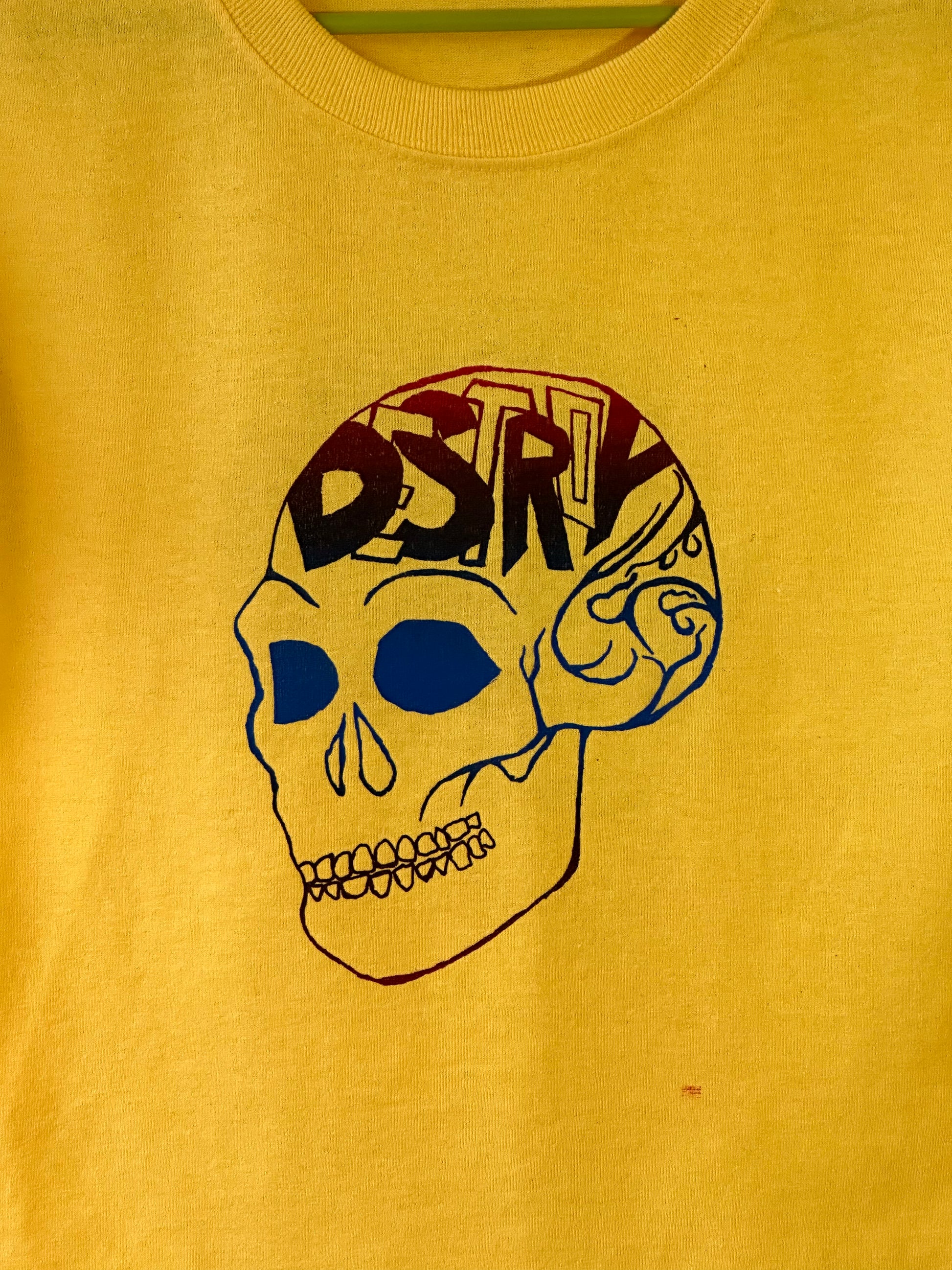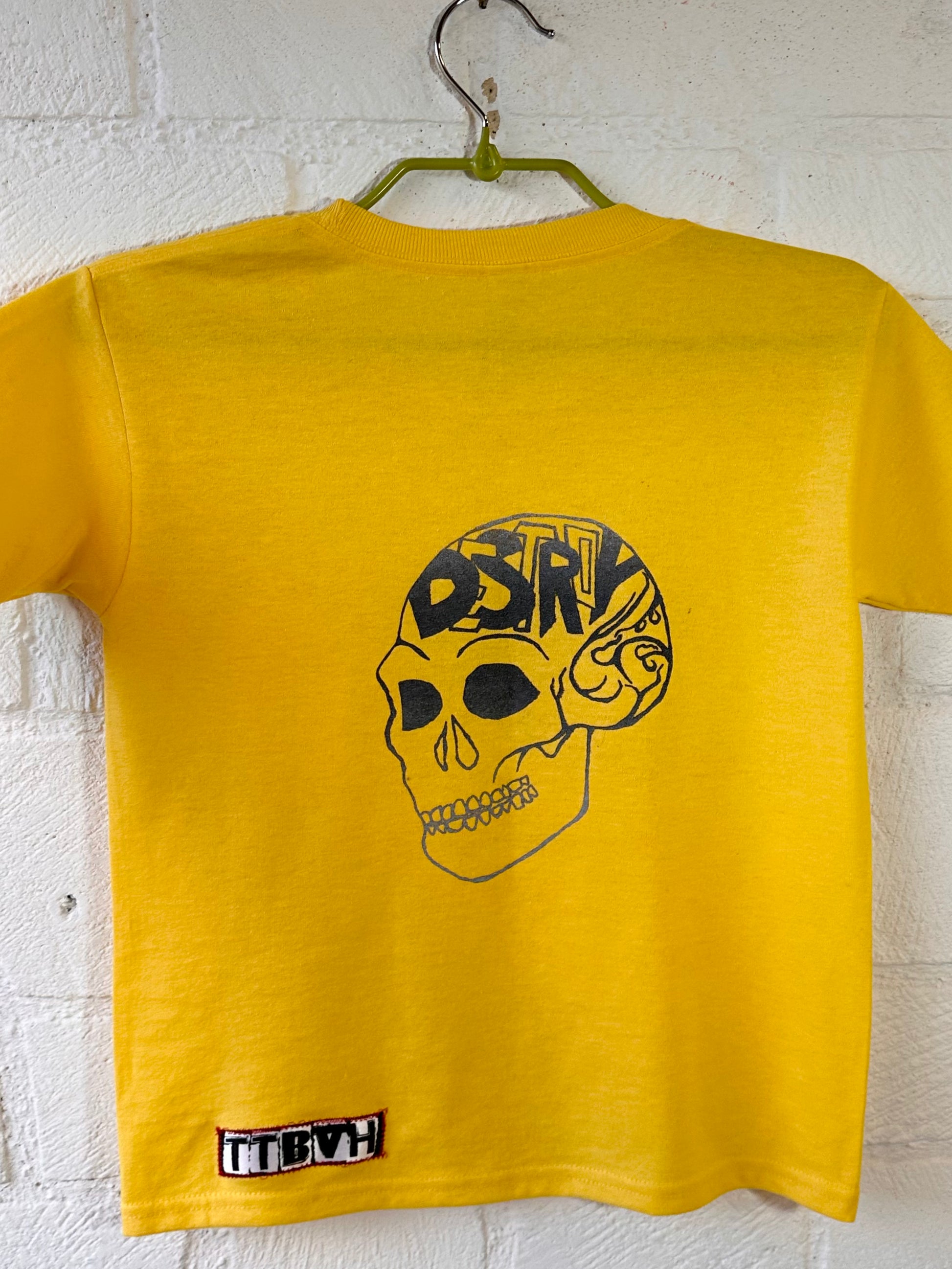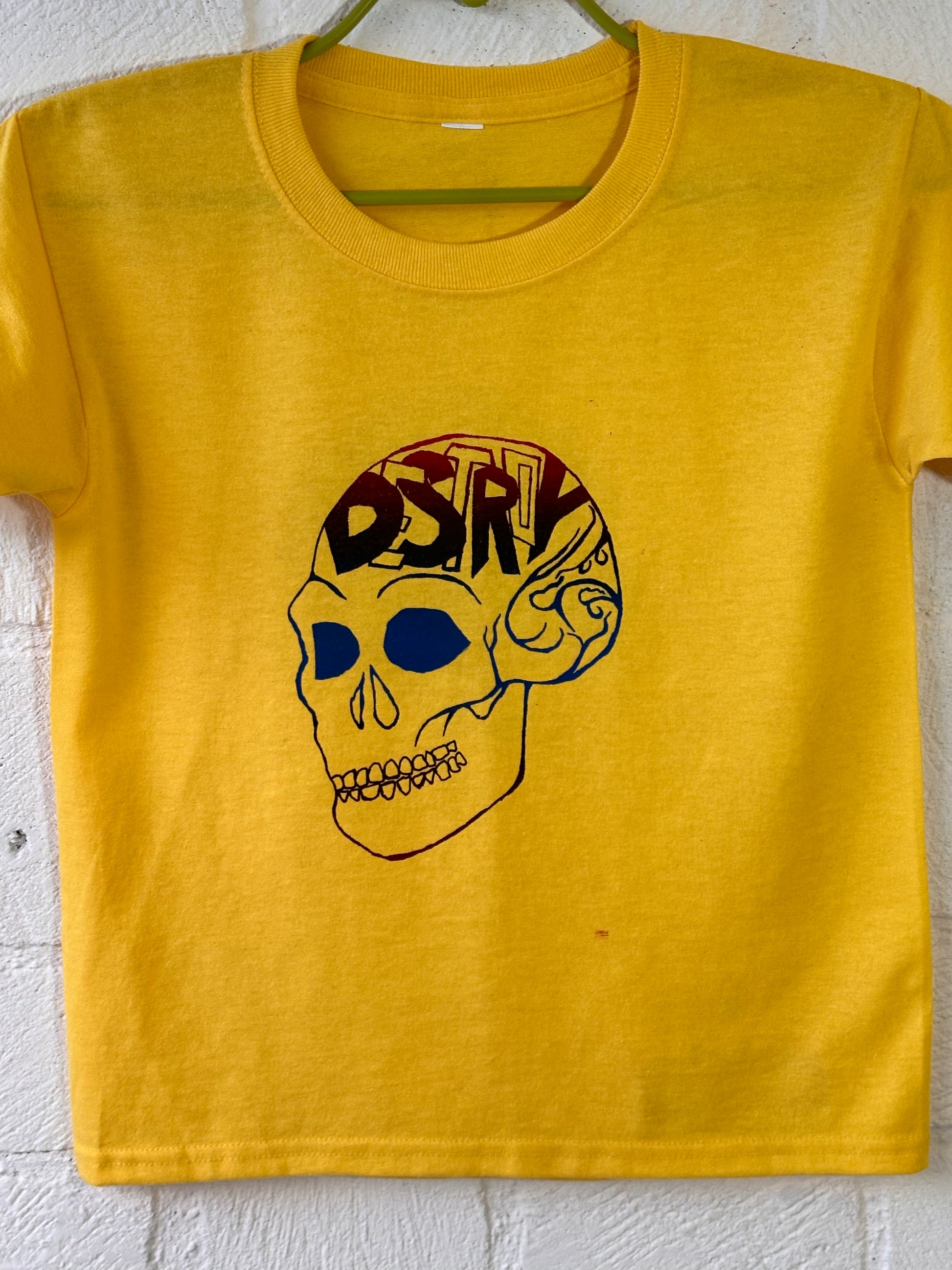 Yellow T-Shirt with Destroy Series Skull Screen Print in Blue, Red and Silver Ink. (11/18)