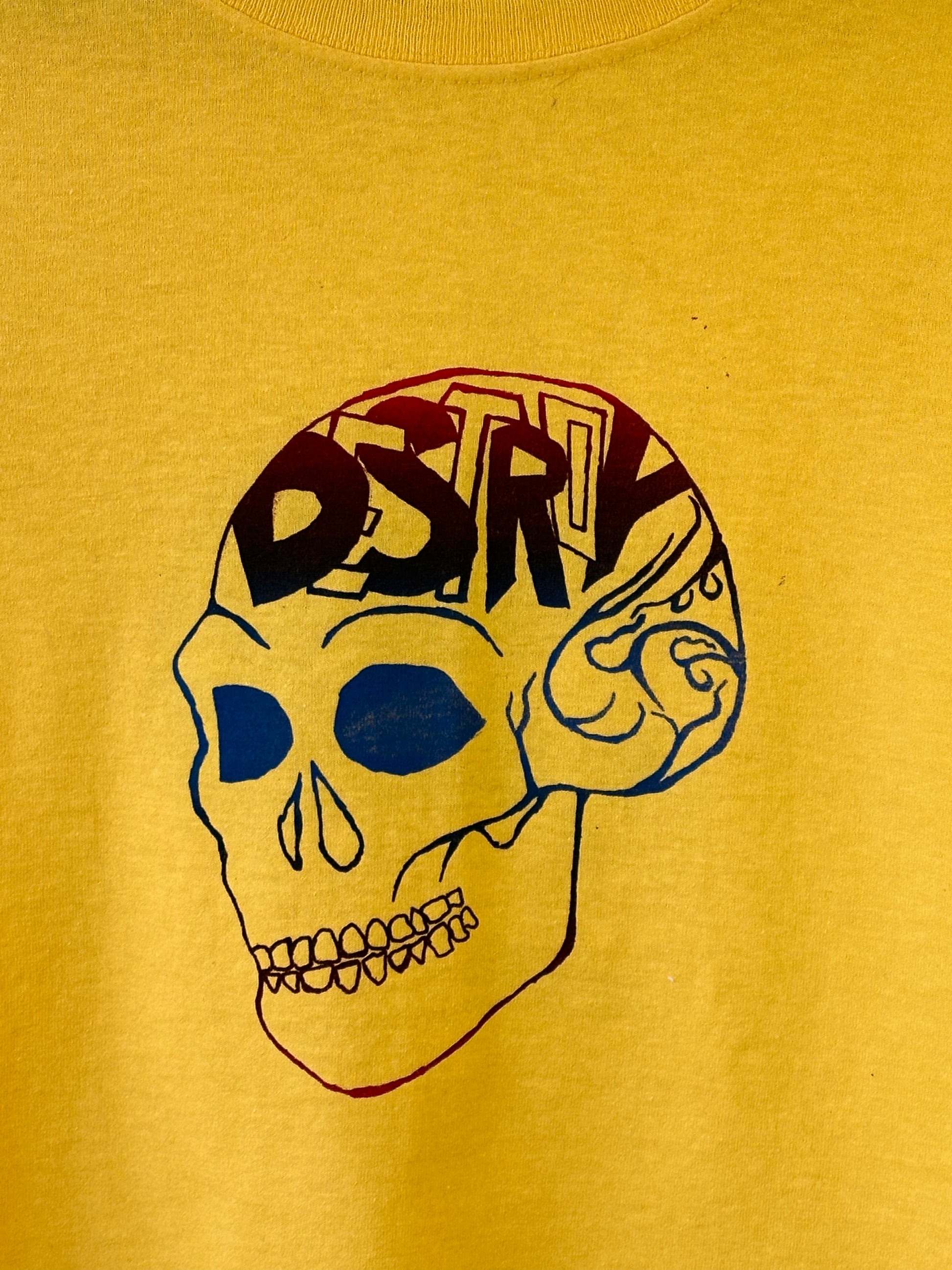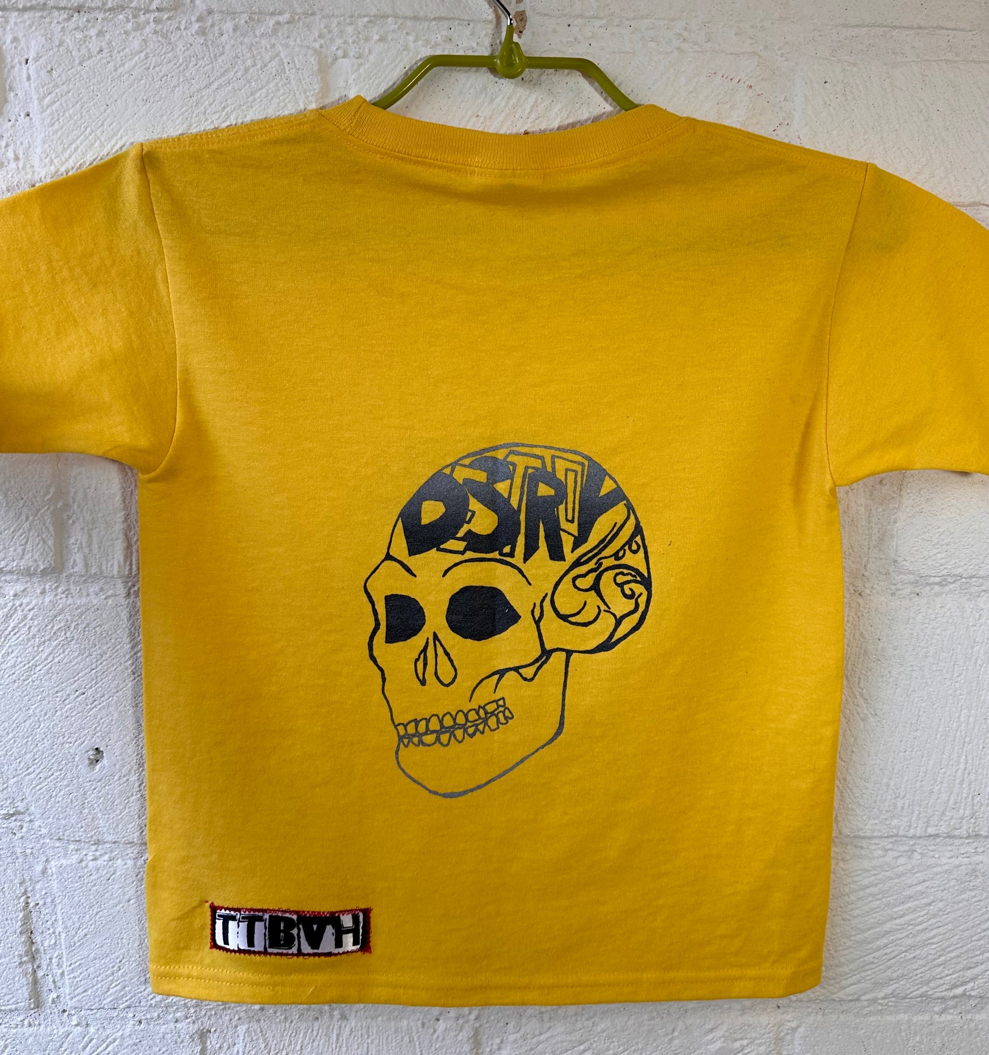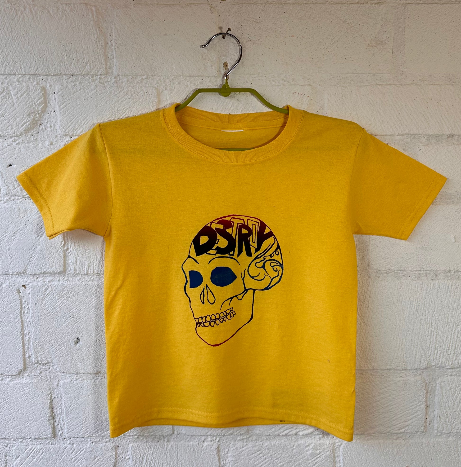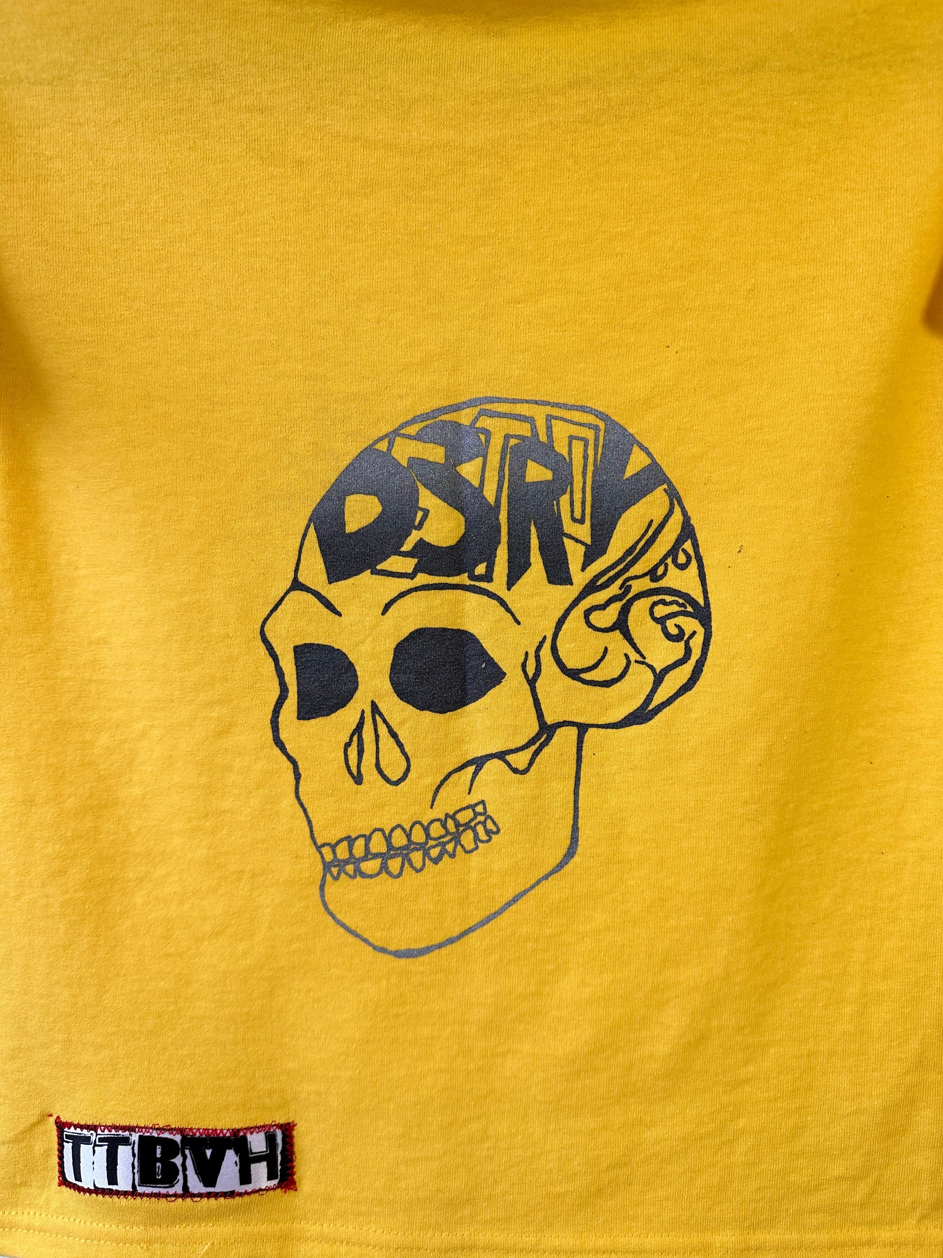 Yellow Baby Tee with Destroy Series Skull Screen Print in Red, Blue and Silver Ink. (9/18)