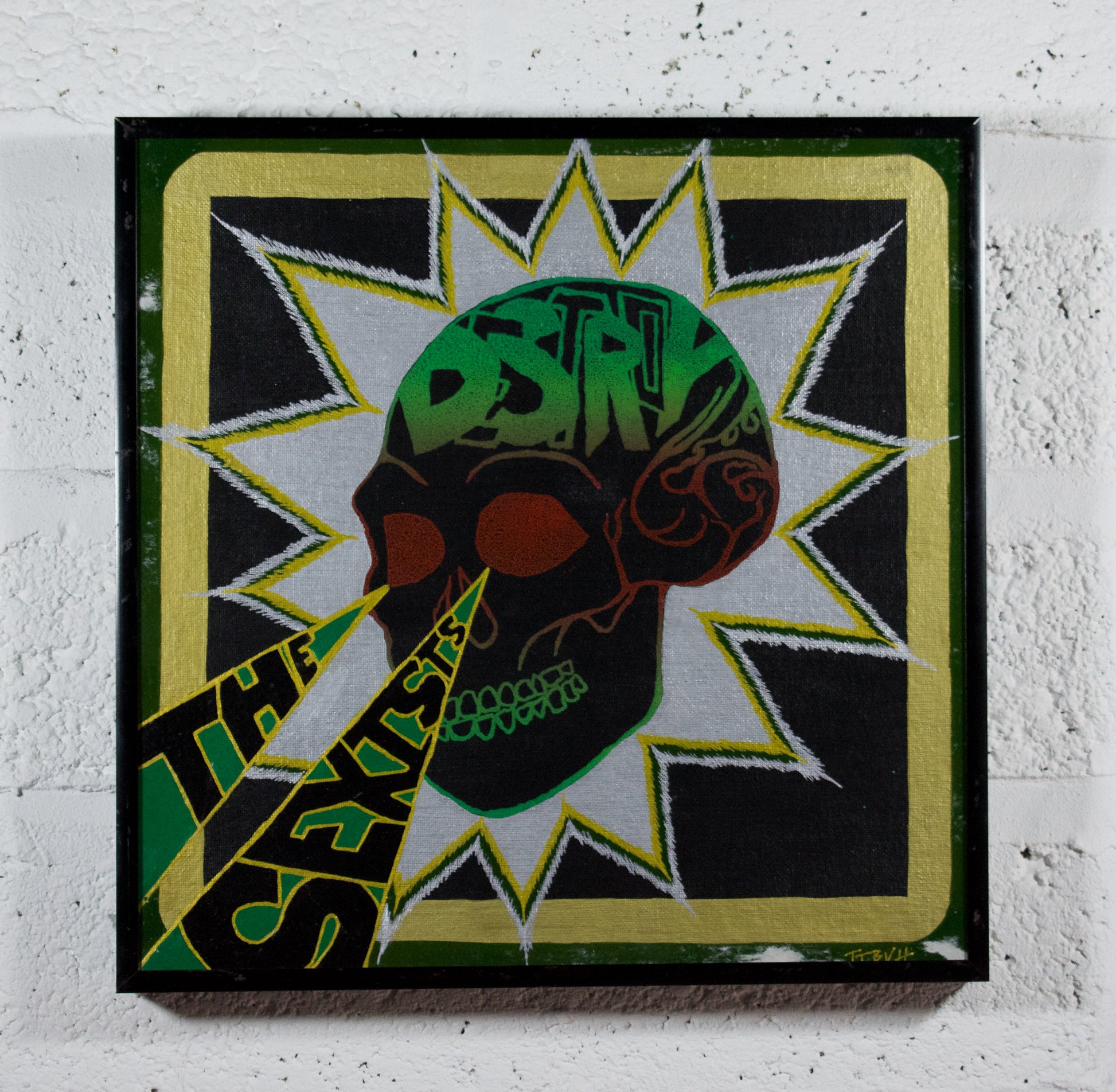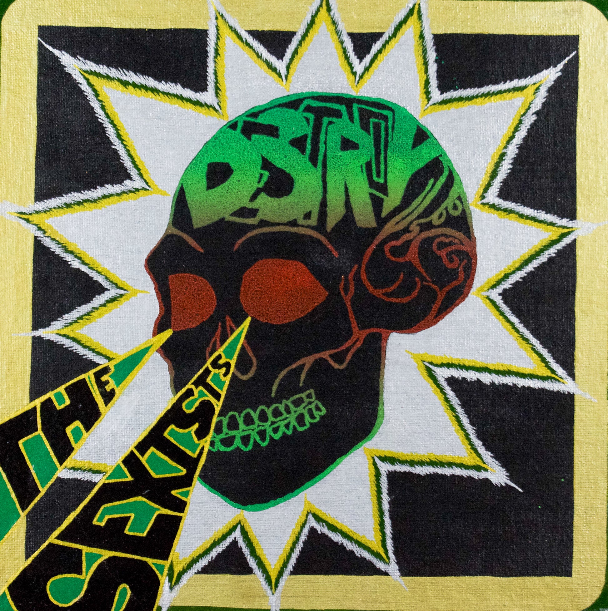 Green and red screen print on acrylic painted canvas with ballpoint ink pen detailing.