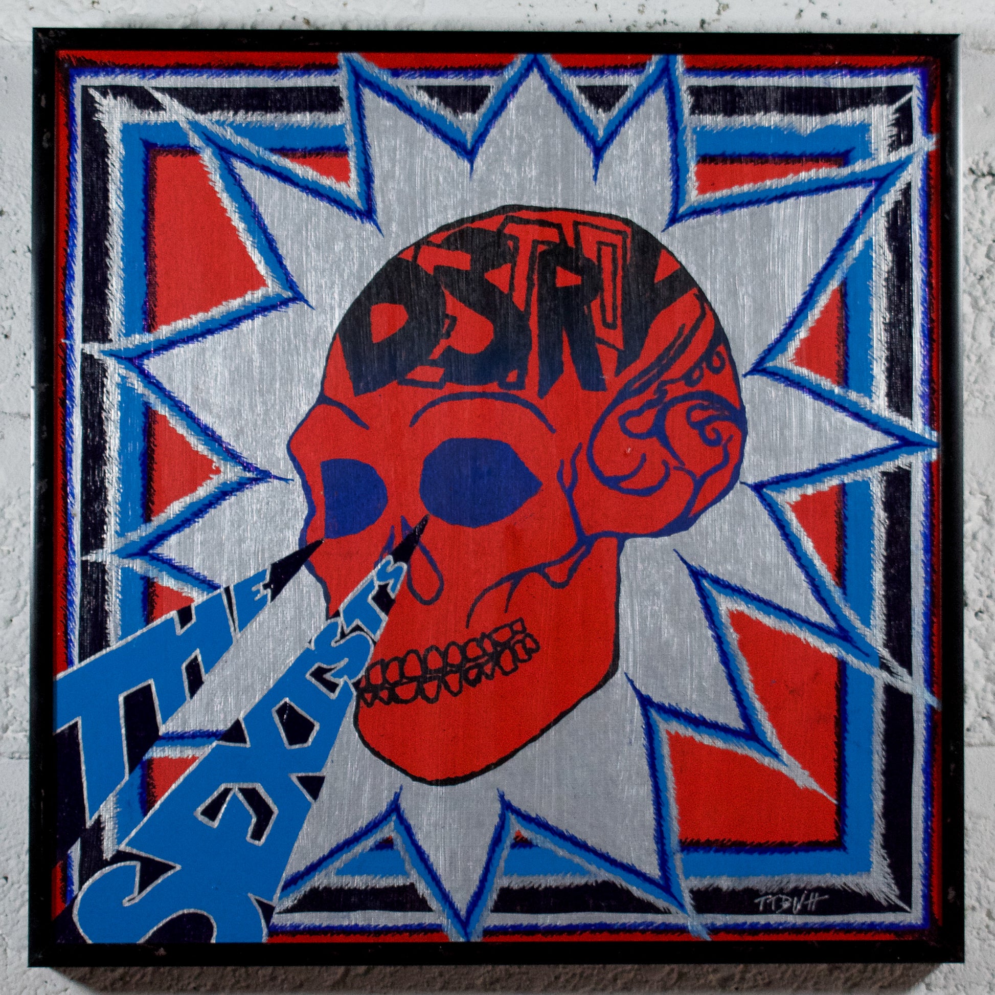 Blue screenprint on acrylic painted canvas with ballpoint ink pen detailing.