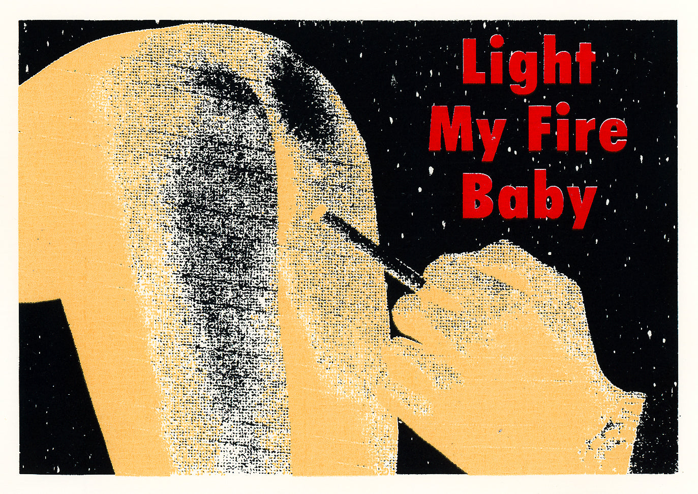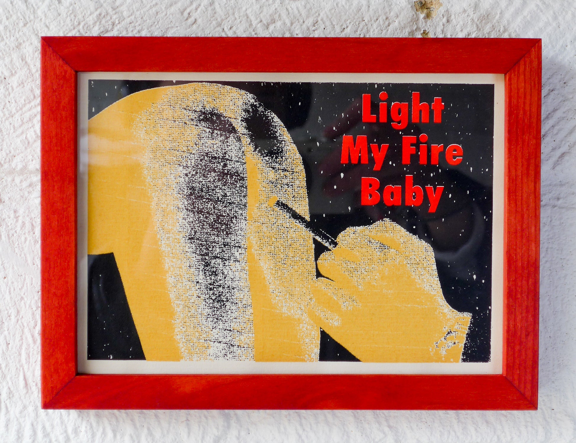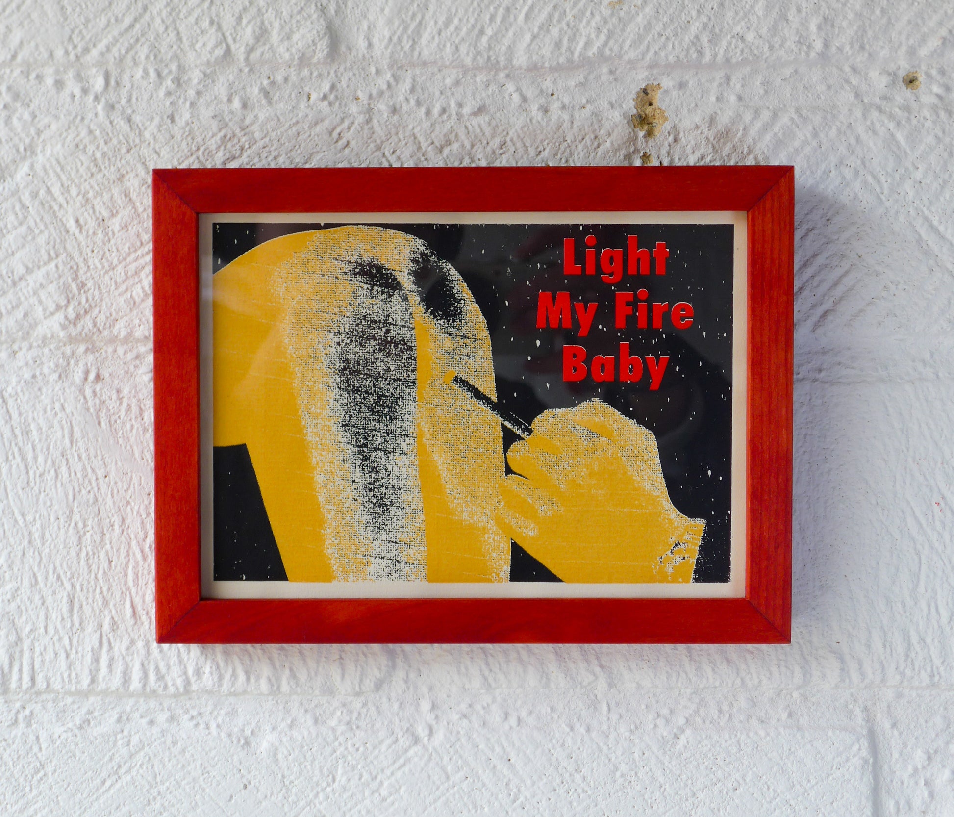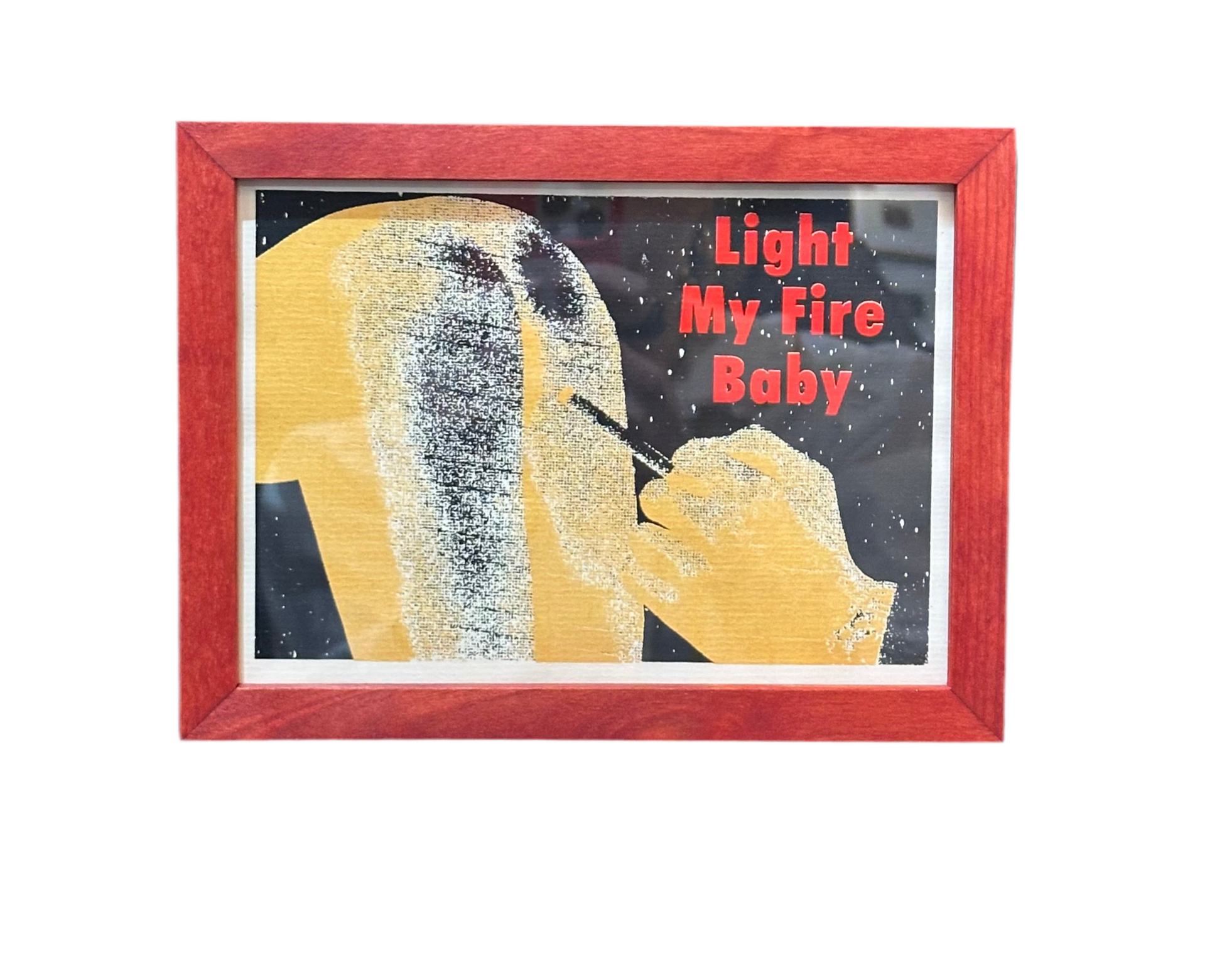 Light My Fire Baby Screen Print in black, gold and red ink on card in red wooden frame.