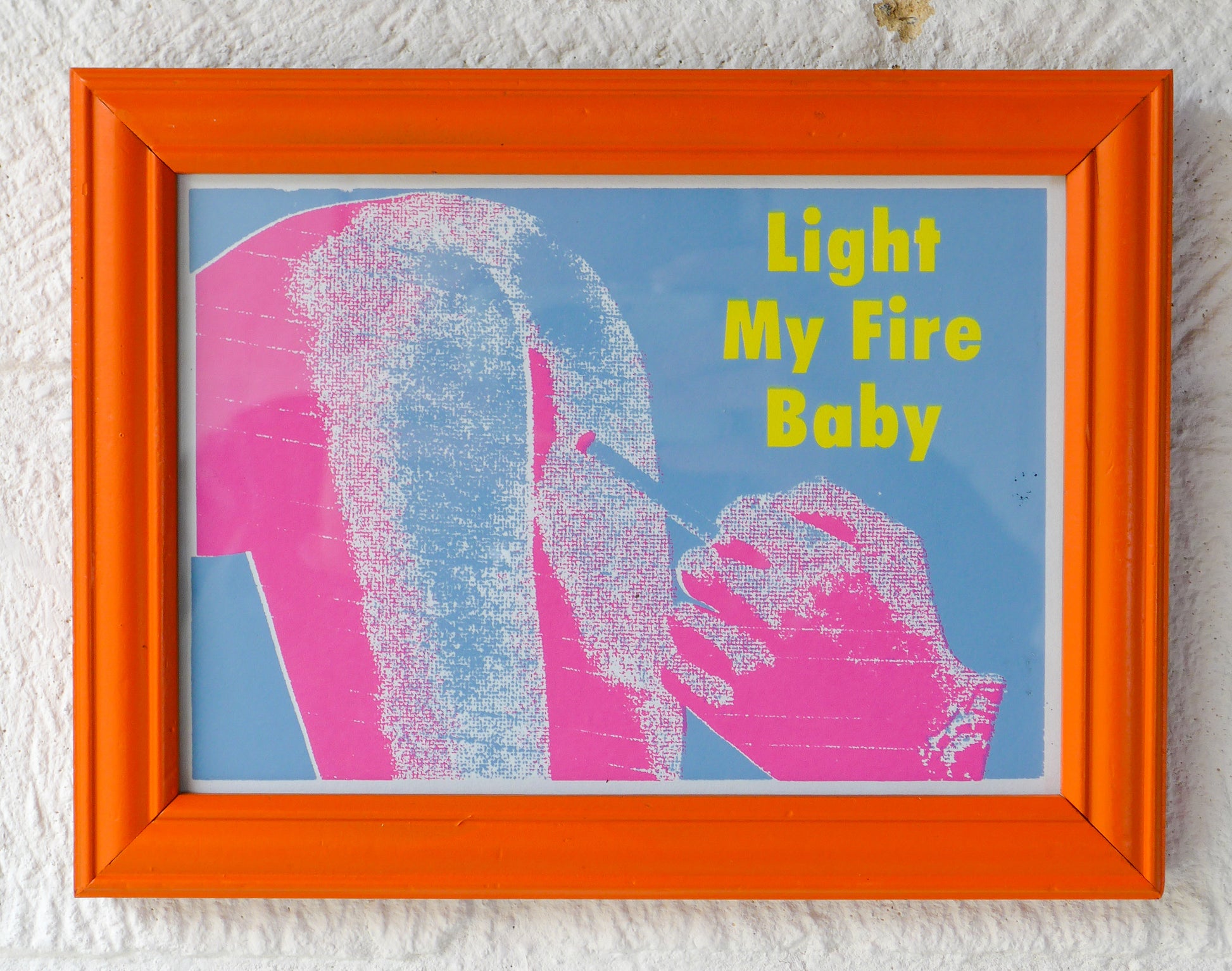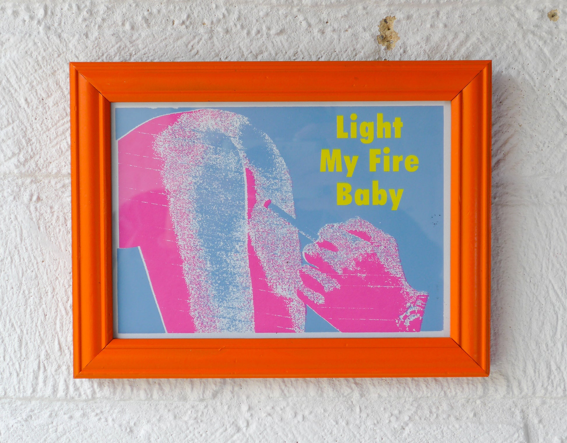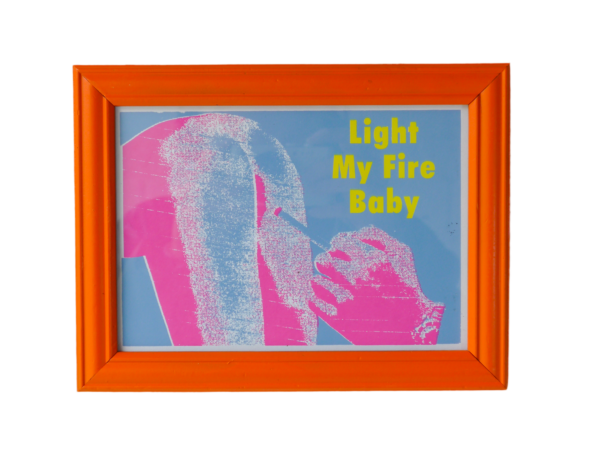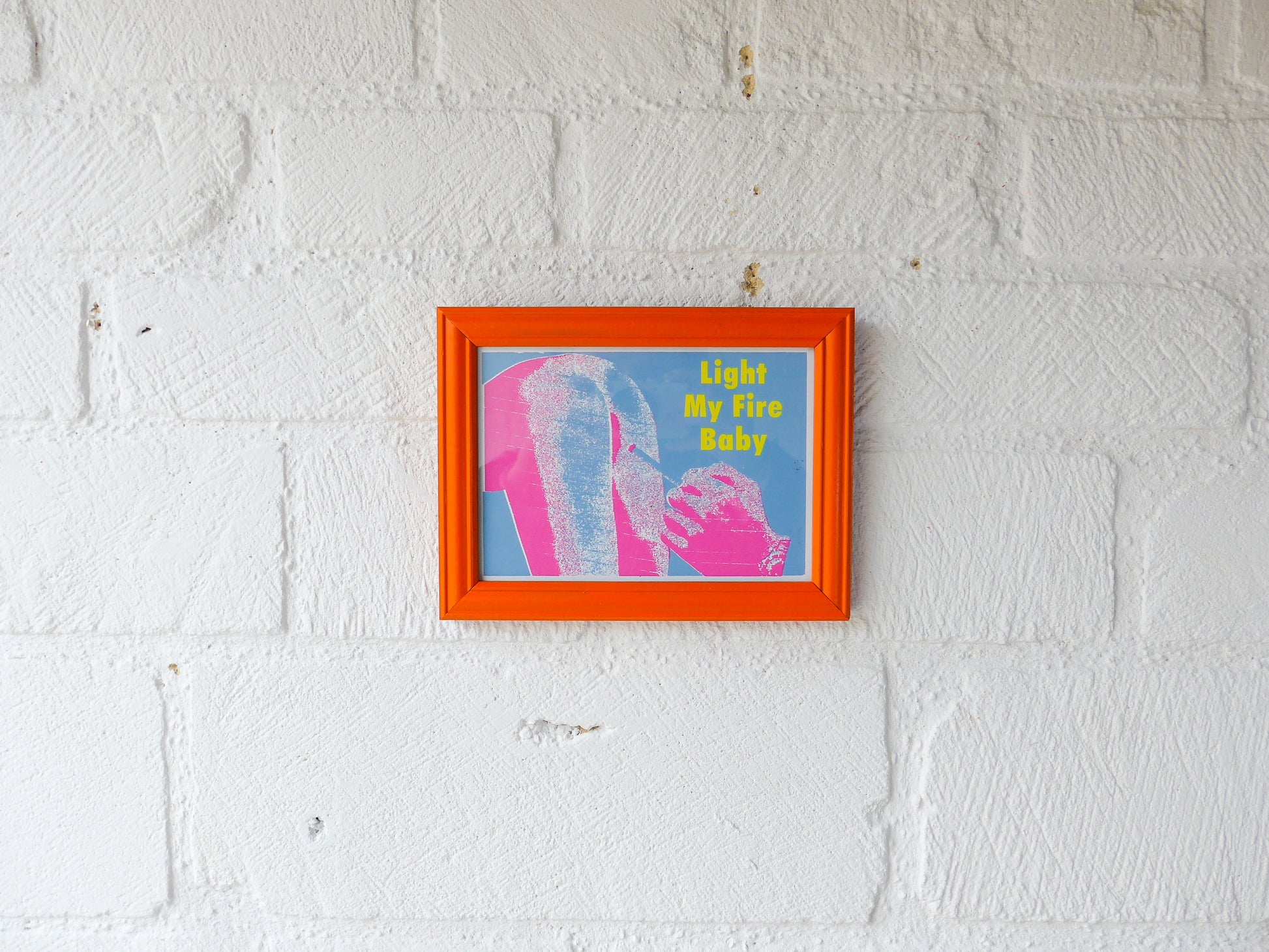 Orange framed Light My Fire Baby screen print in blue, pink and yellow ink on white card. Open edition printed in 2024.
