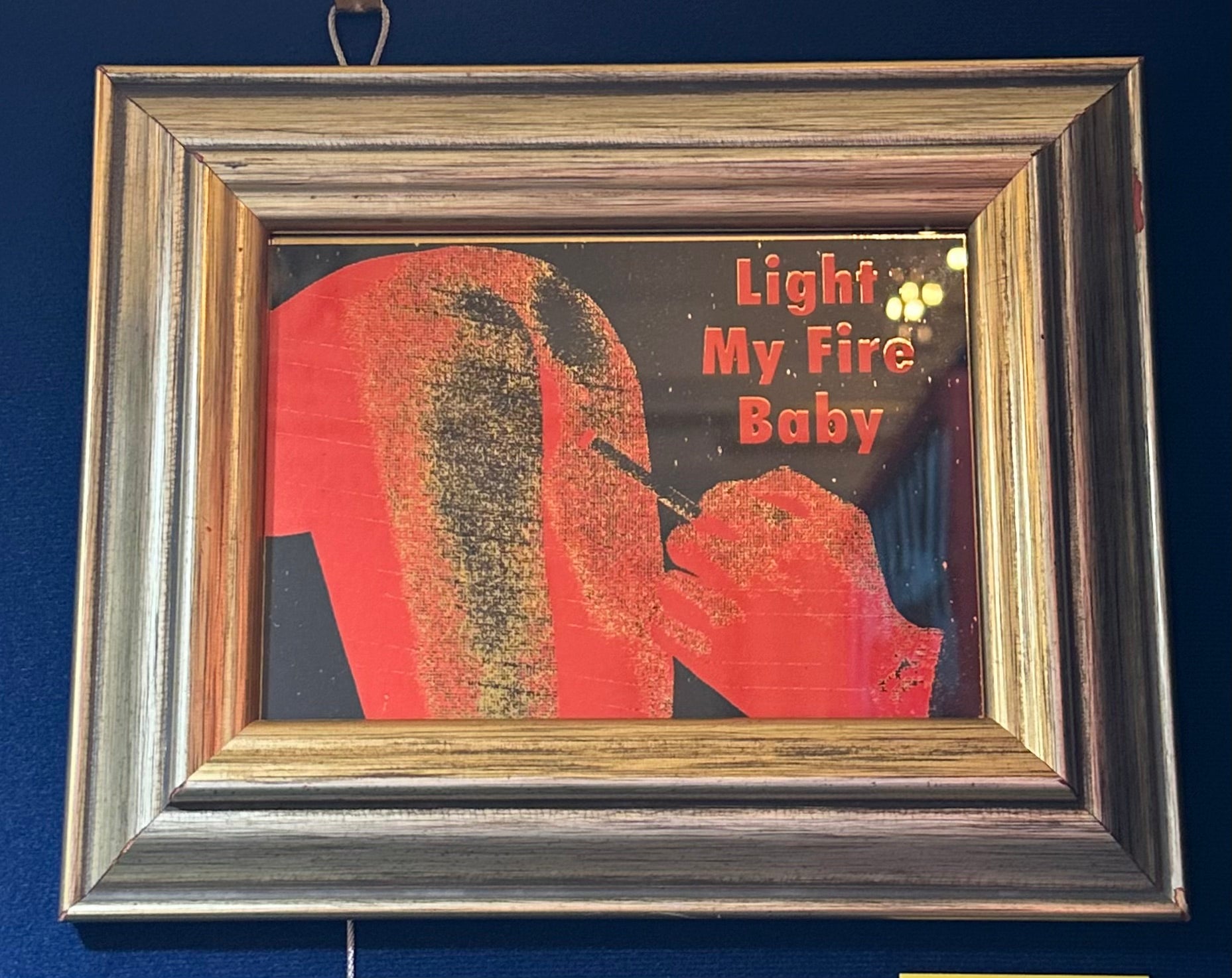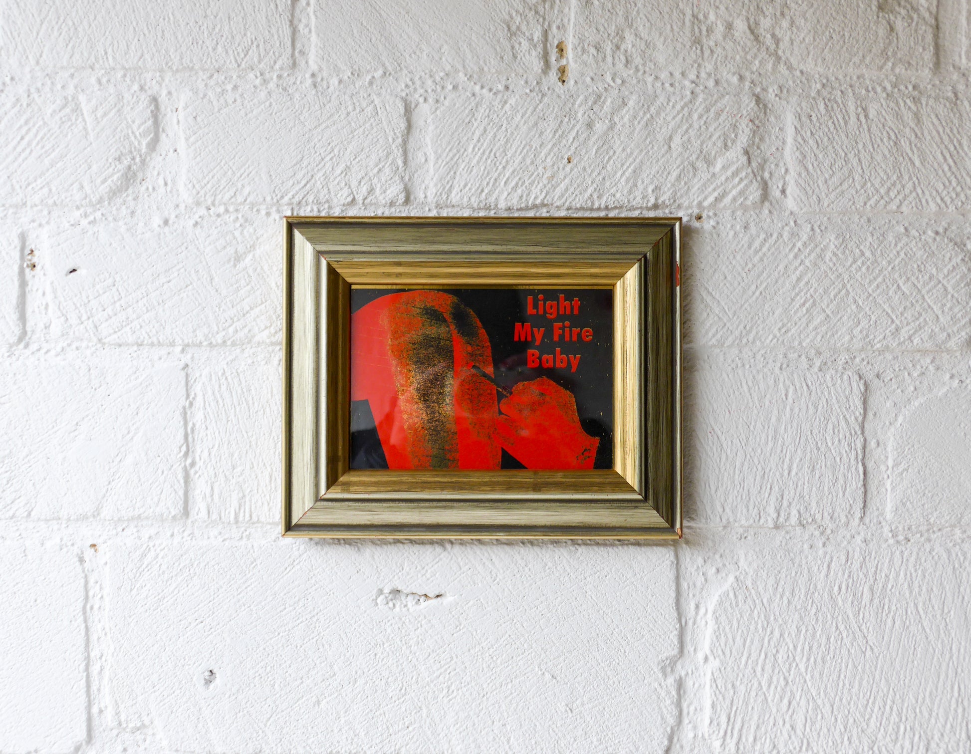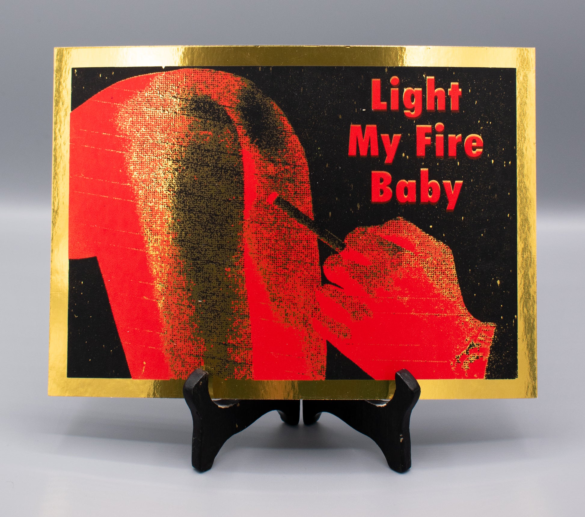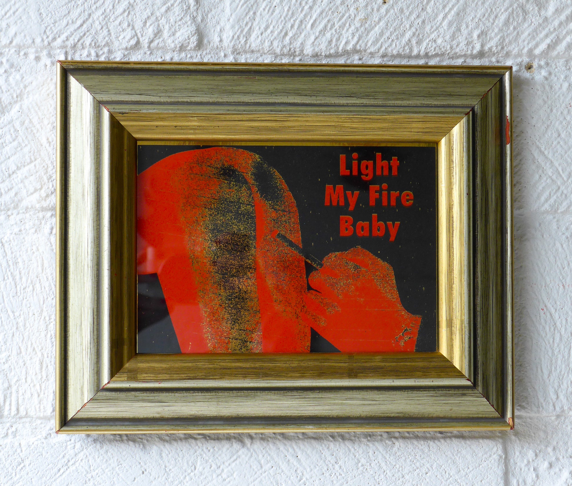 Light My Fire Baby screen print in black and red acrylic on metallic gold card in gold frame.