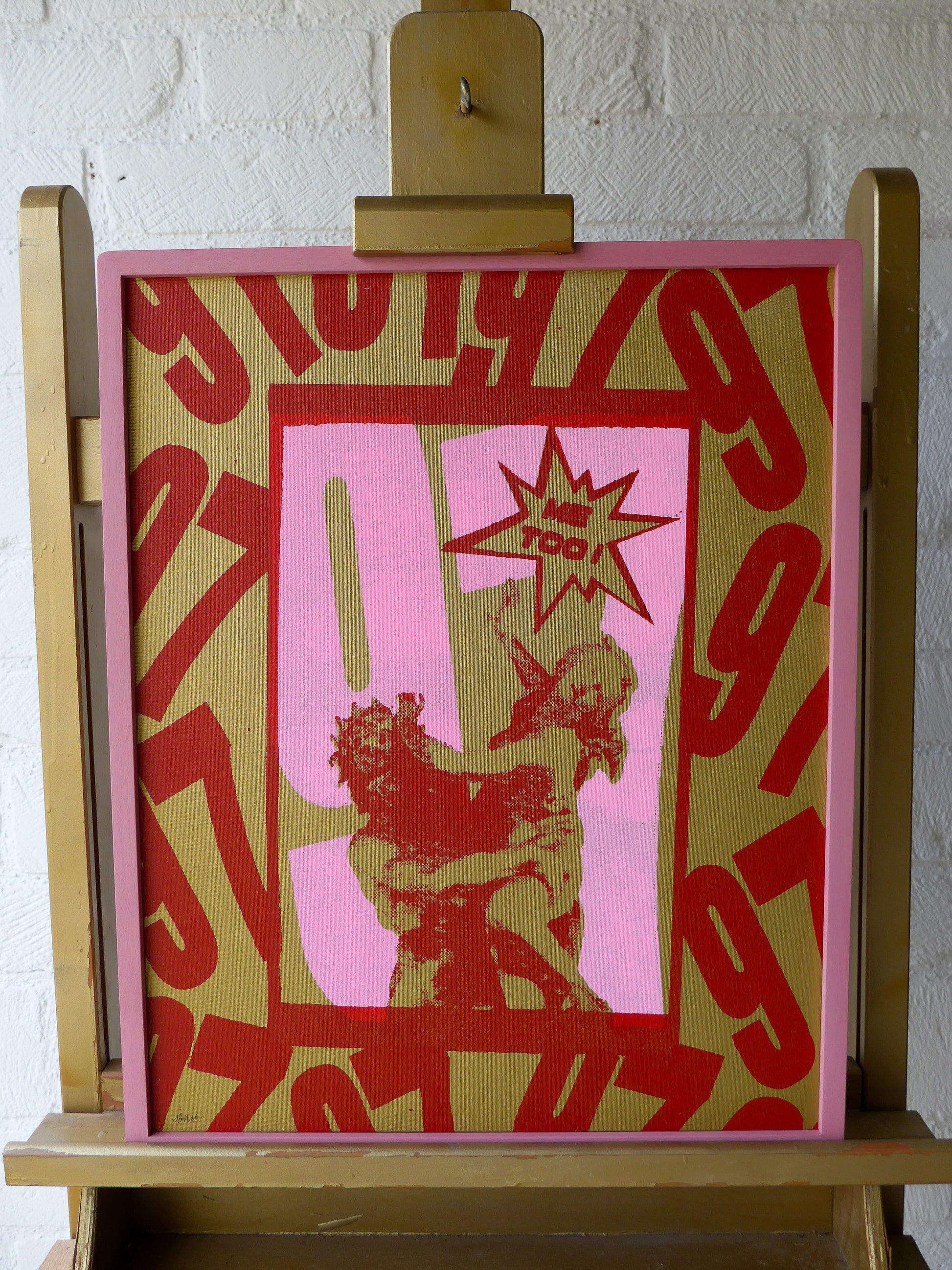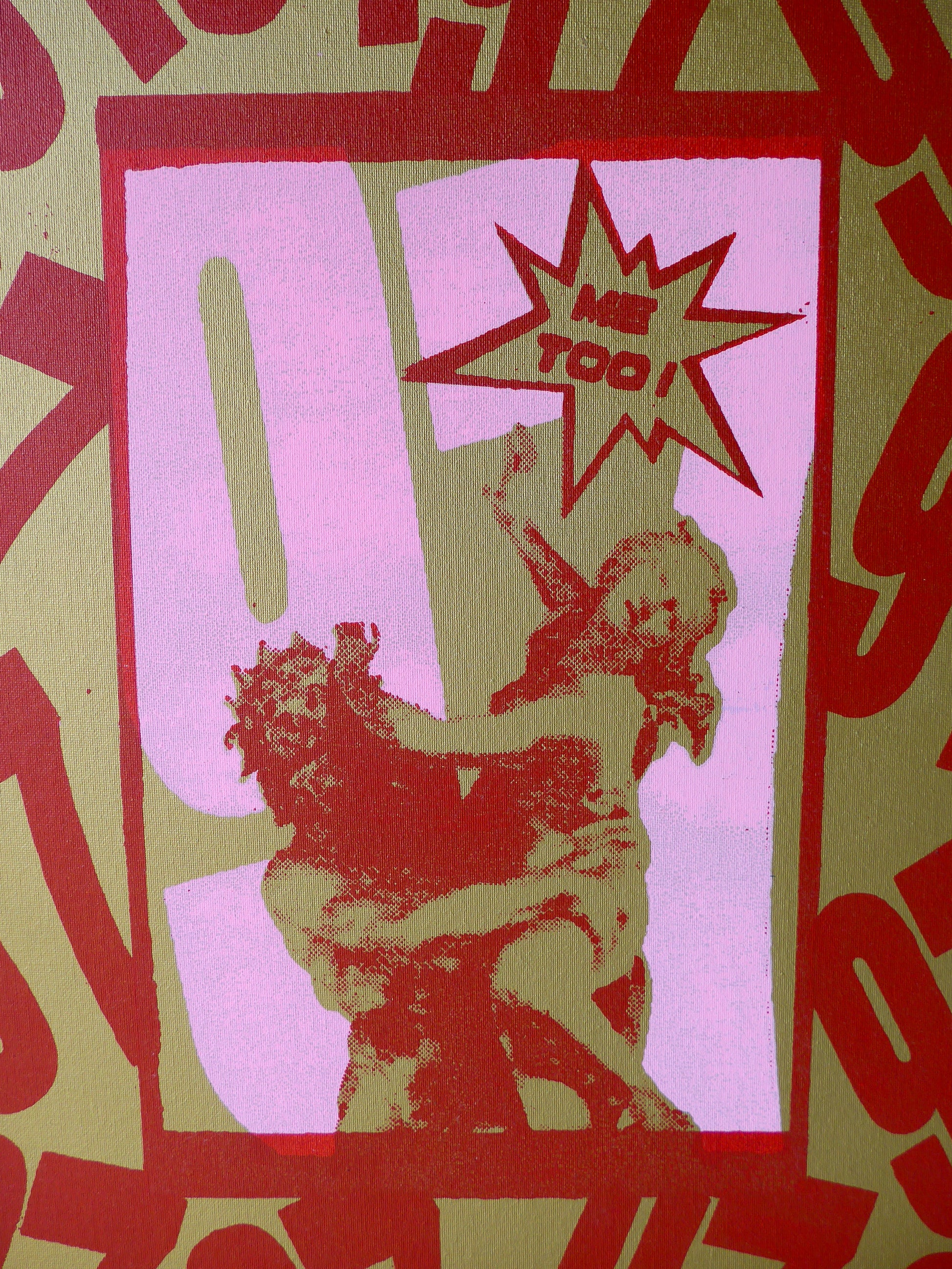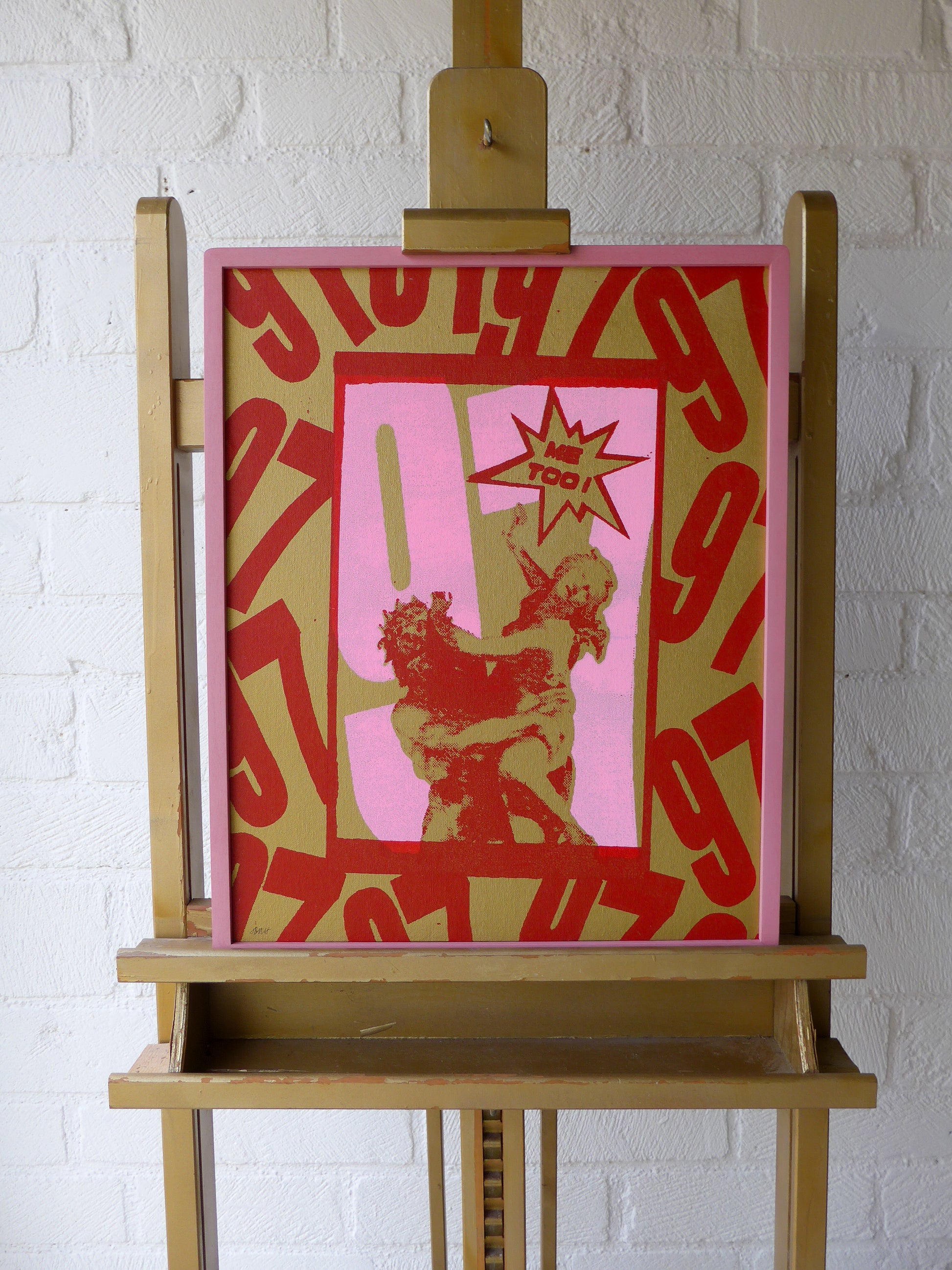 Proserpina, 97 Screen Print in Pink and Red Ink on a Gold Spray-painted Canvas in pink rounded edge wooden frame.