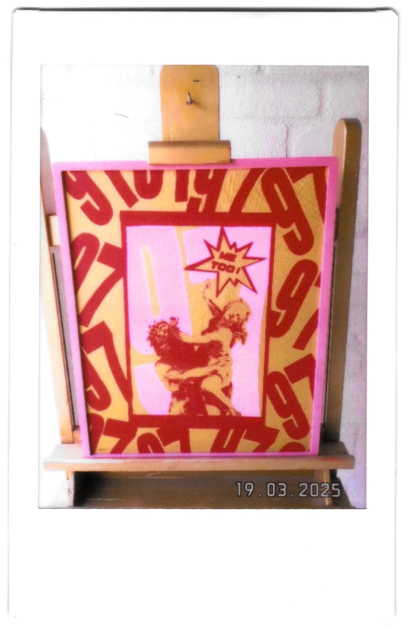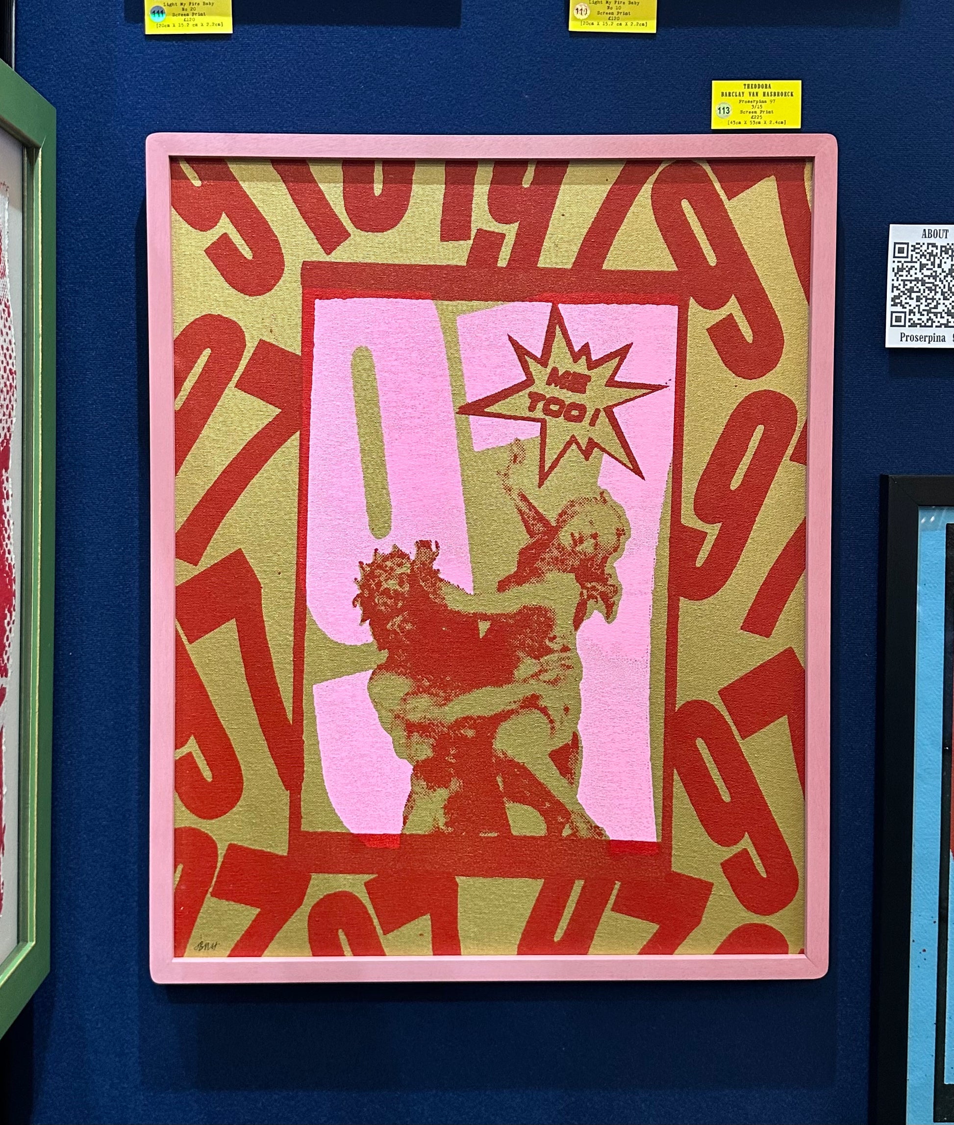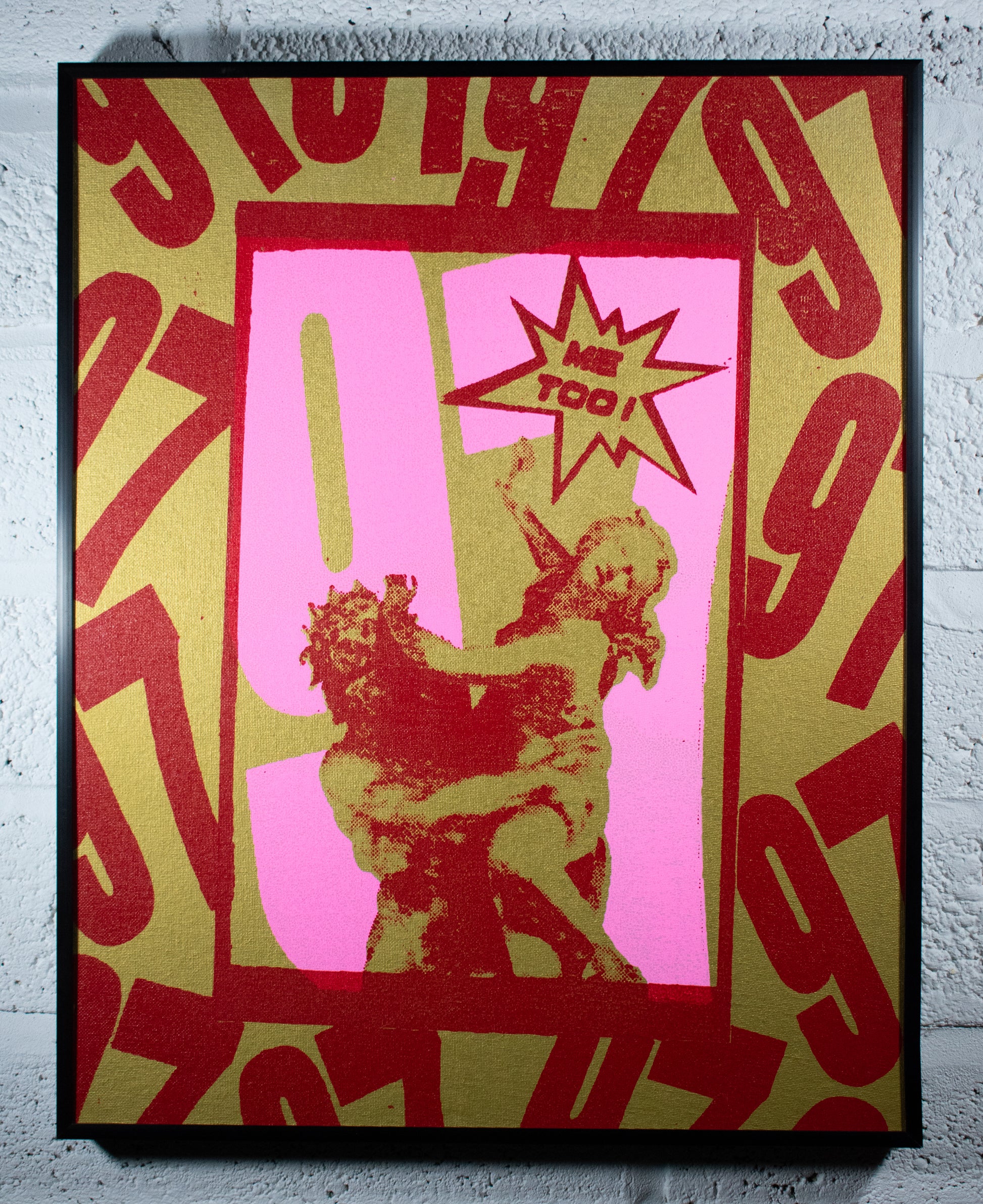 Proserpina, 97 Screen Print in Pink and Red Ink on a Gold Spray-painted Canvas in pink rounded edge wooden frame.