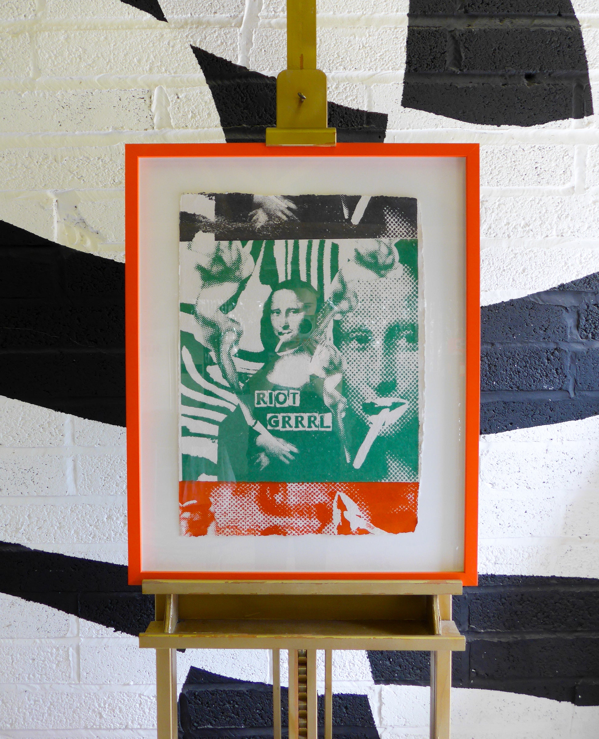 Riot Grrrl Mona screen print in orange, red and black ink on recycled cotton rag card floated in an orange frame.