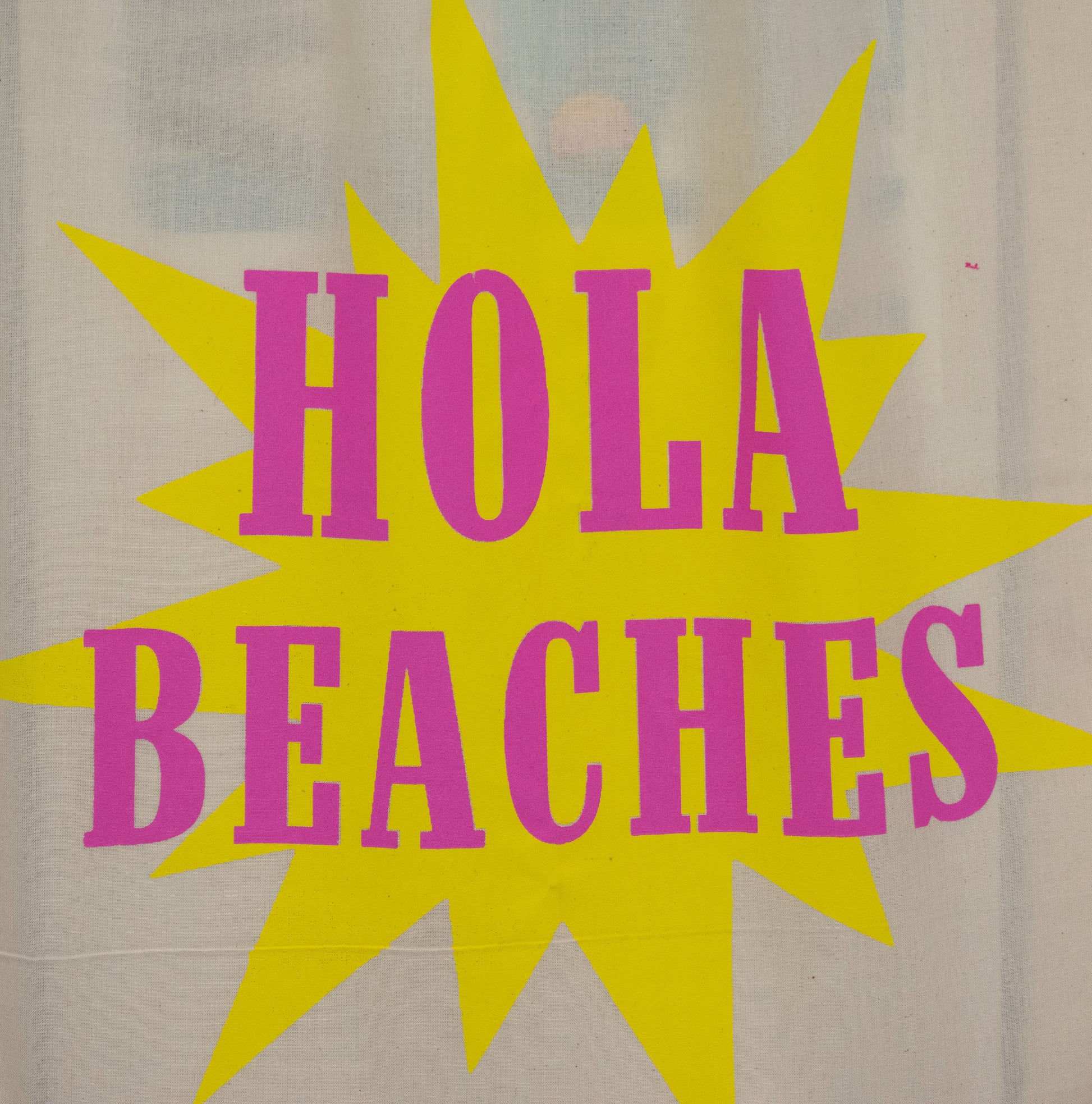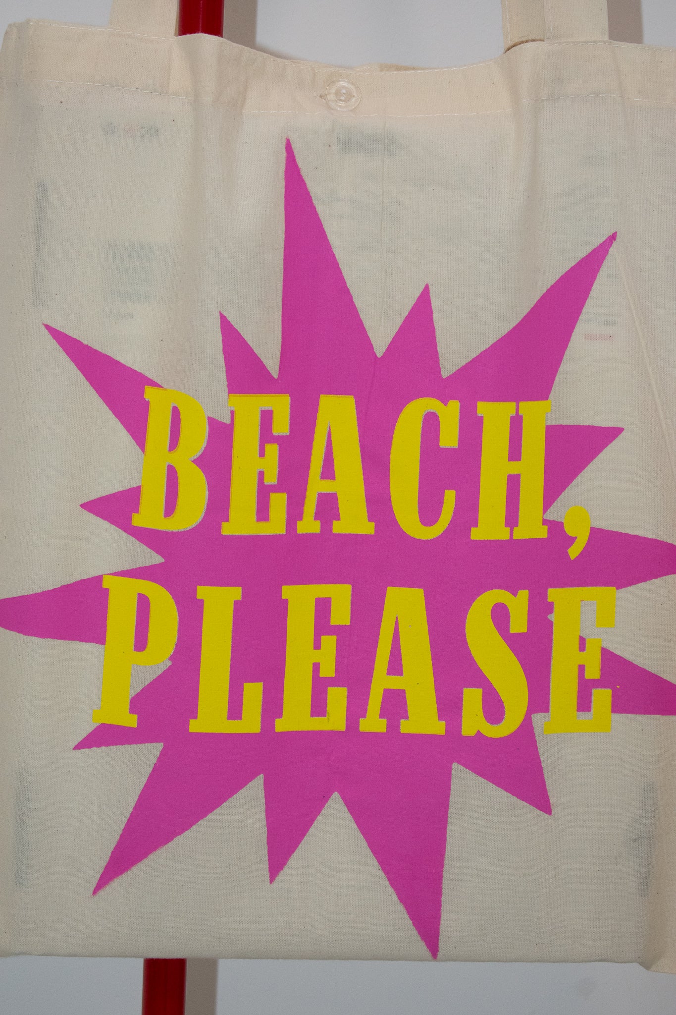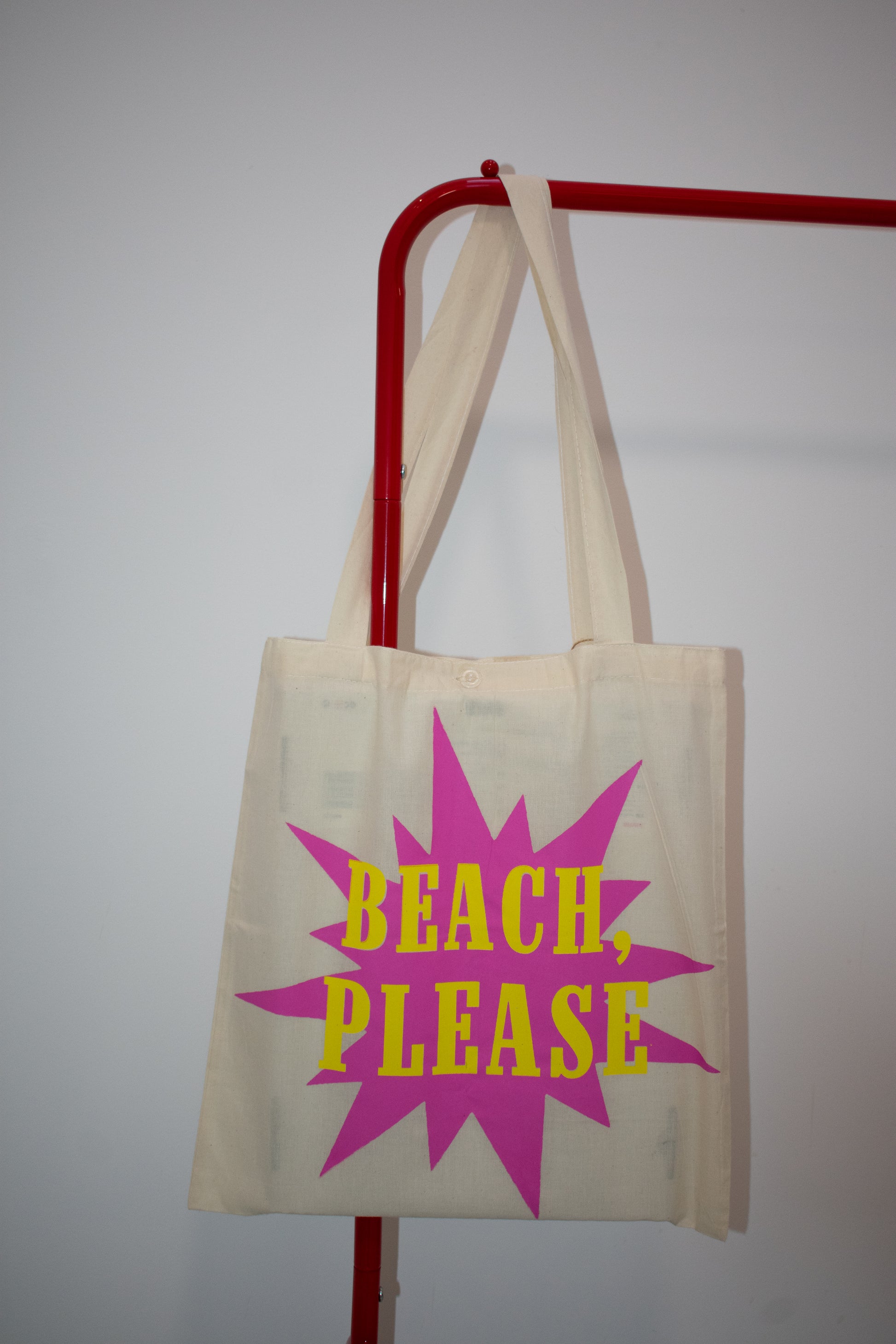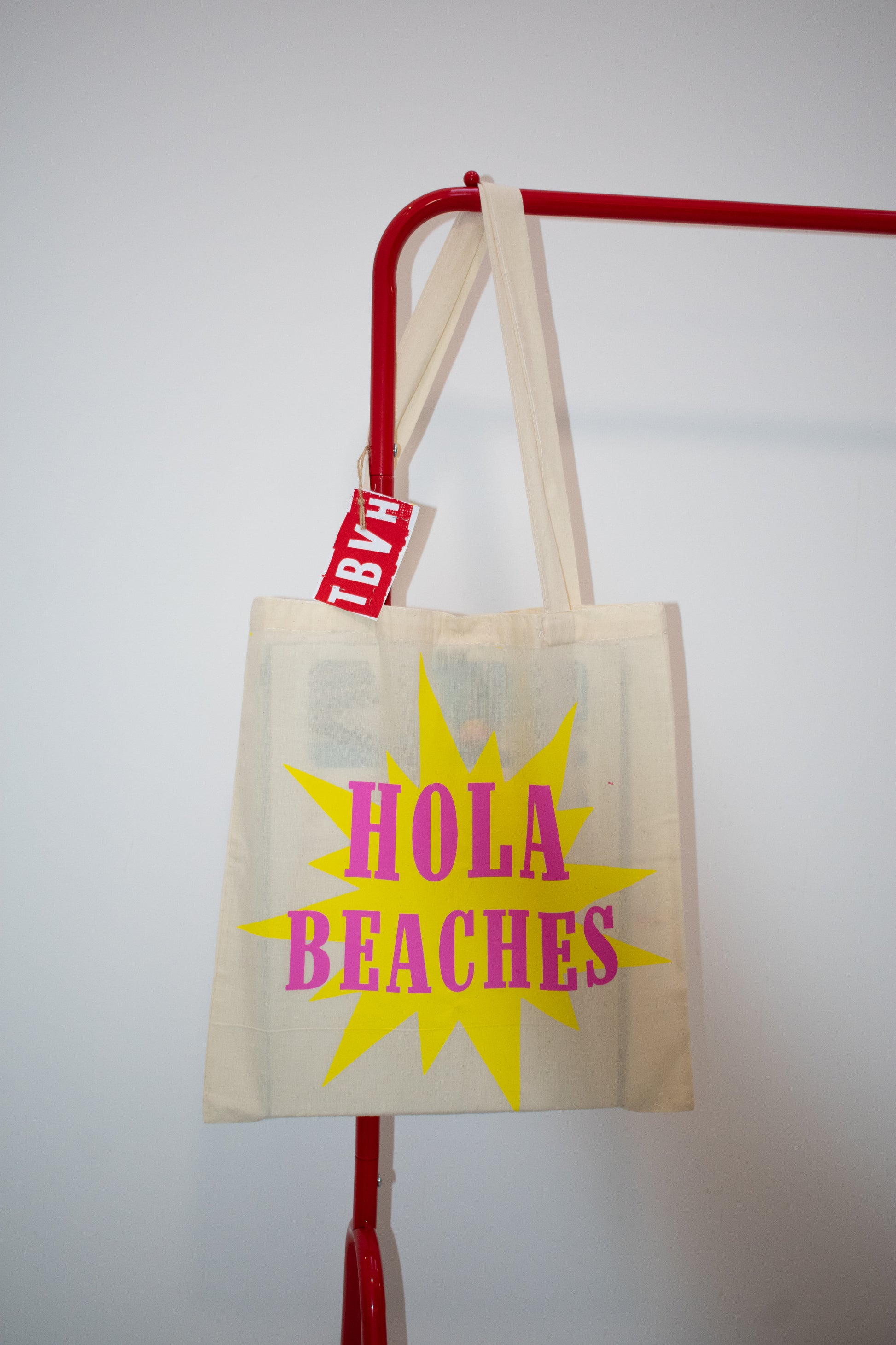 Hola Beaches X Beach Please screen printed in yellow and pink on a beige tote bag.