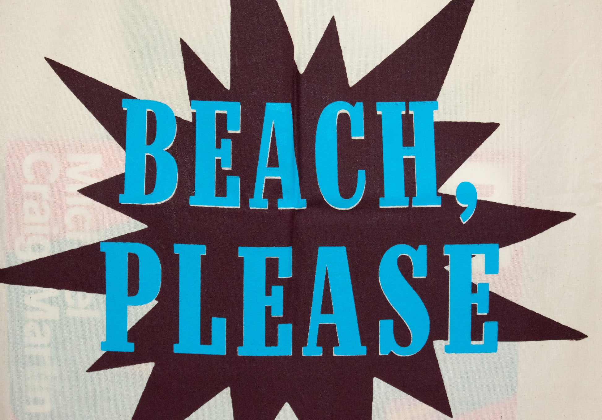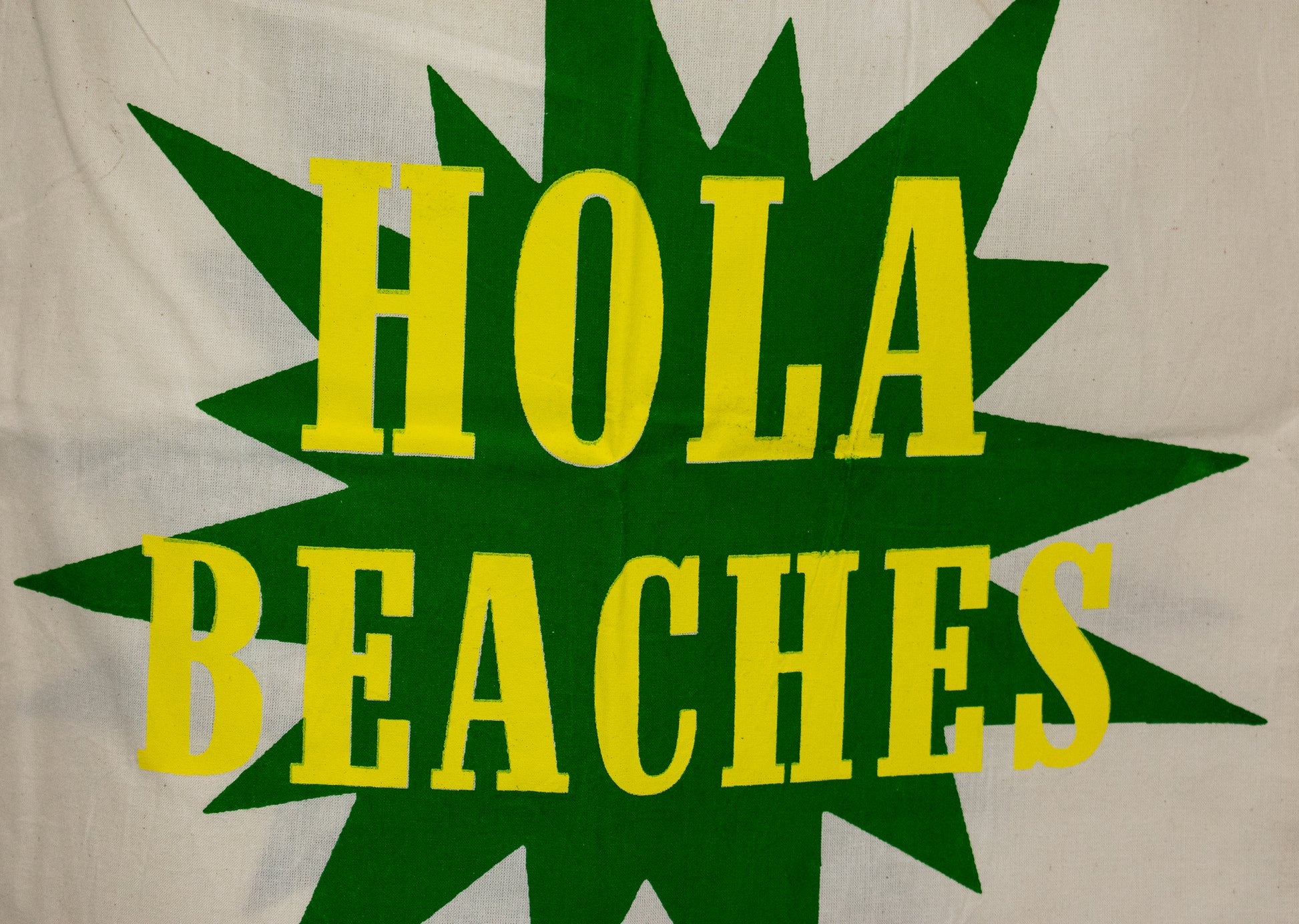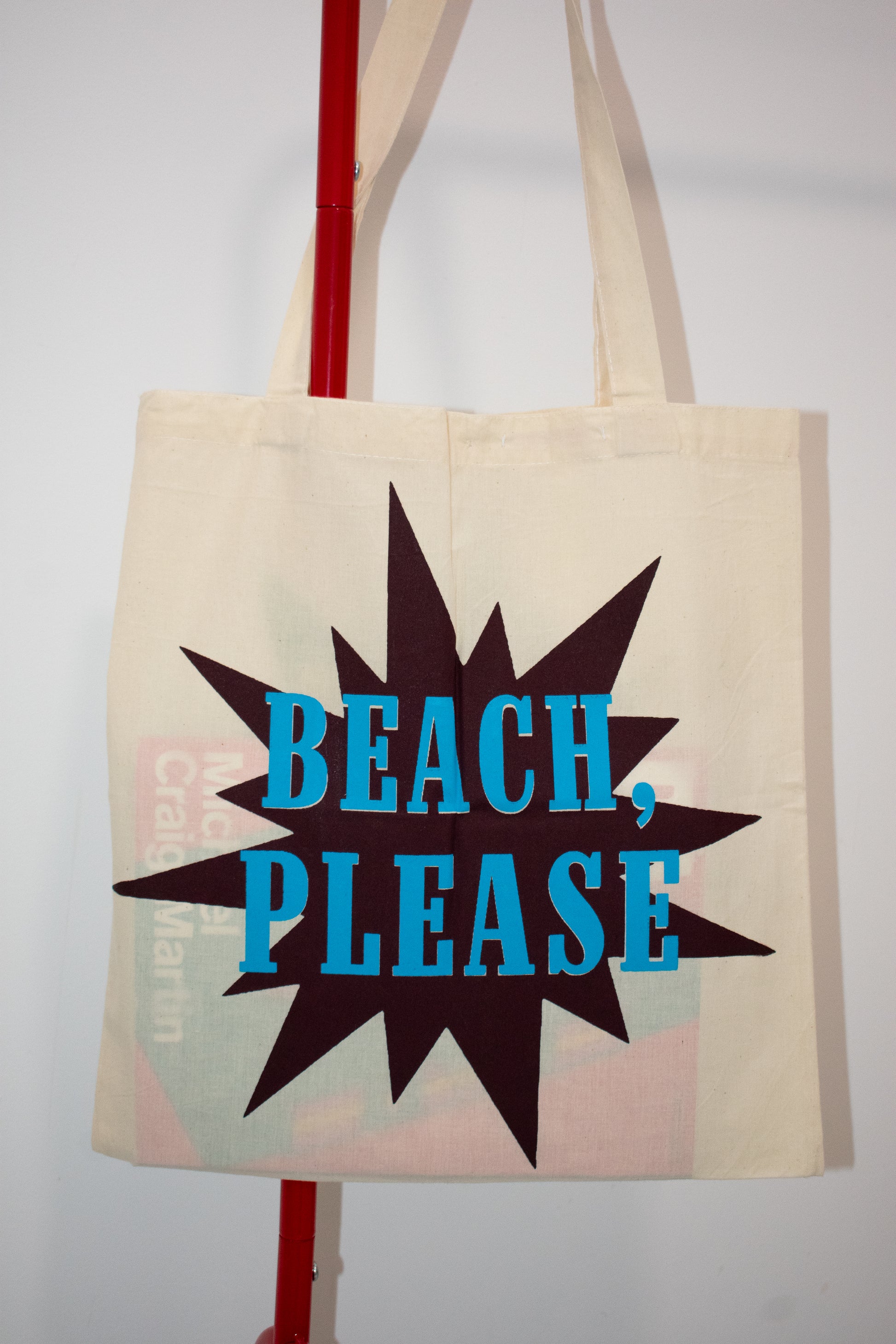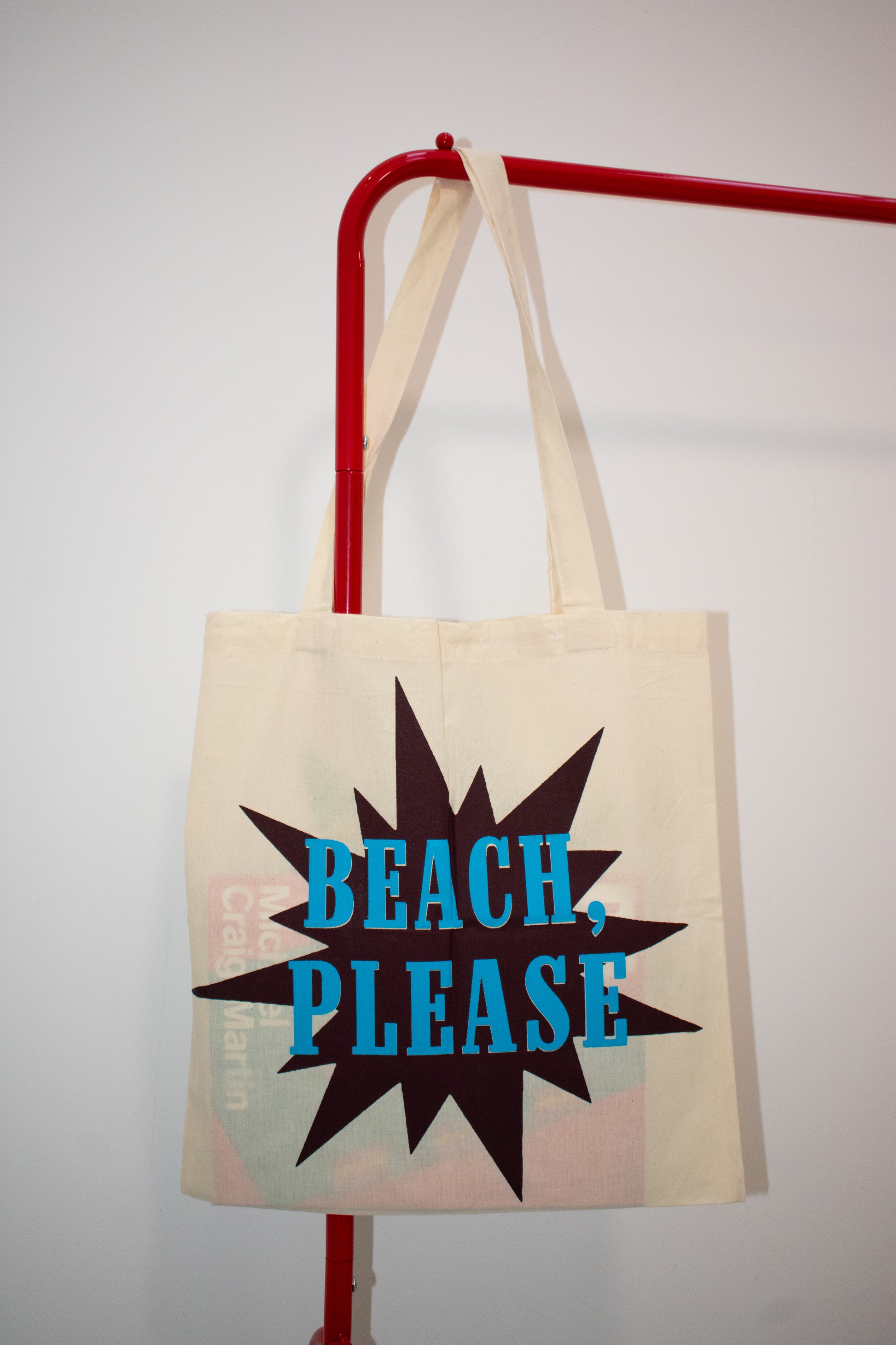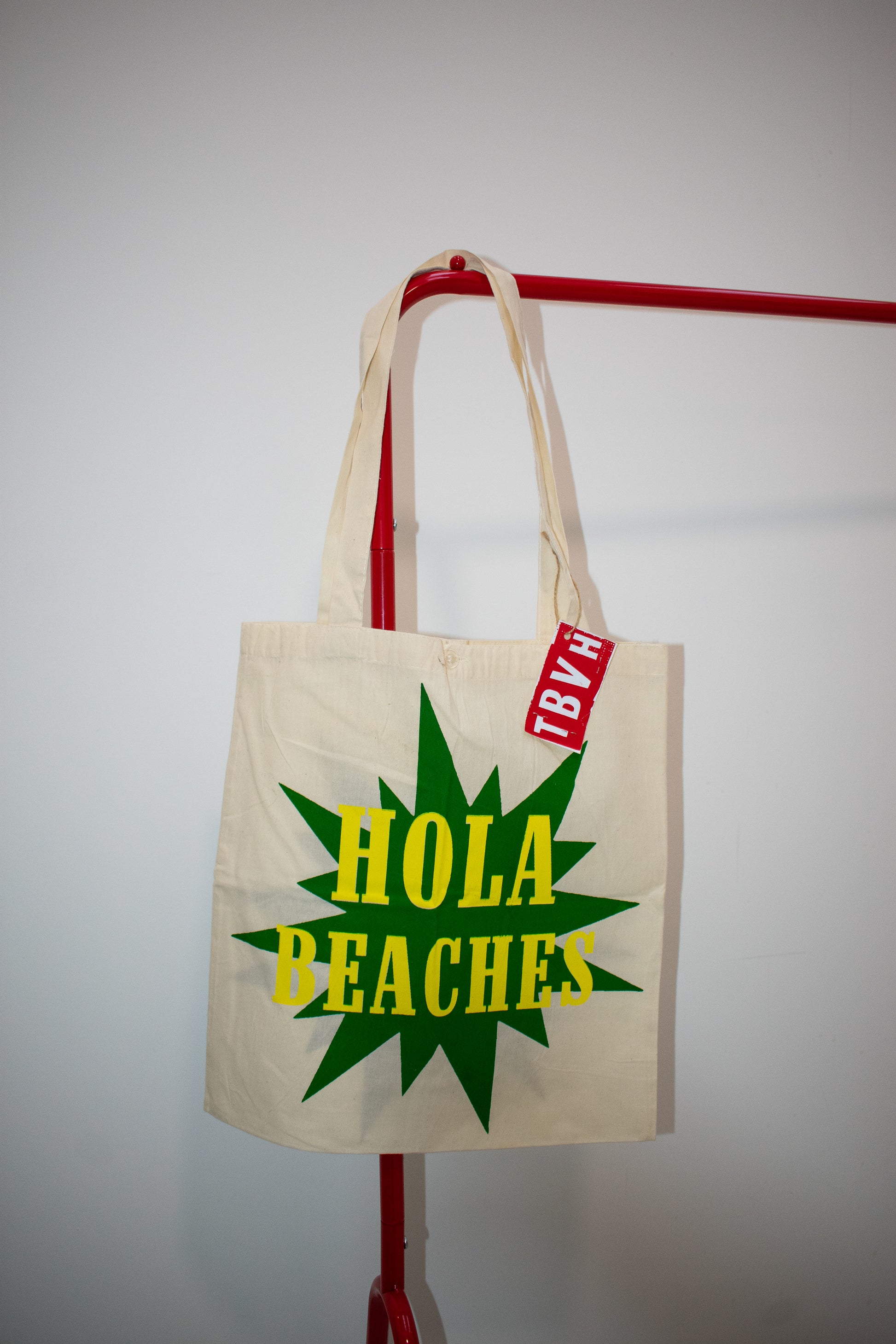 Hola Beaches X Beach Please screen printed in yellow, green, blue and burgundy on a beige tote bag.