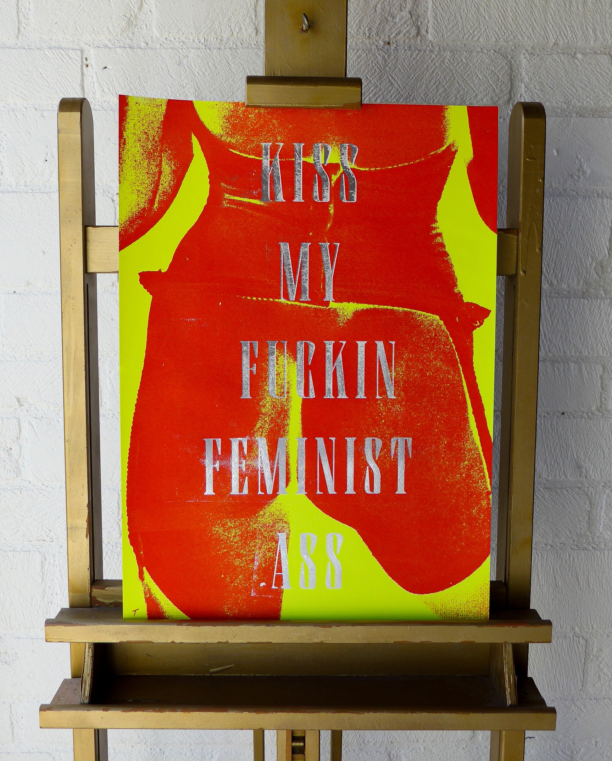 Kiss My Fuckin Feminist Ass screen print in yellow and red with silver foilded text. There are 2 of these prints and due to the nature of the medium both differ from each other.