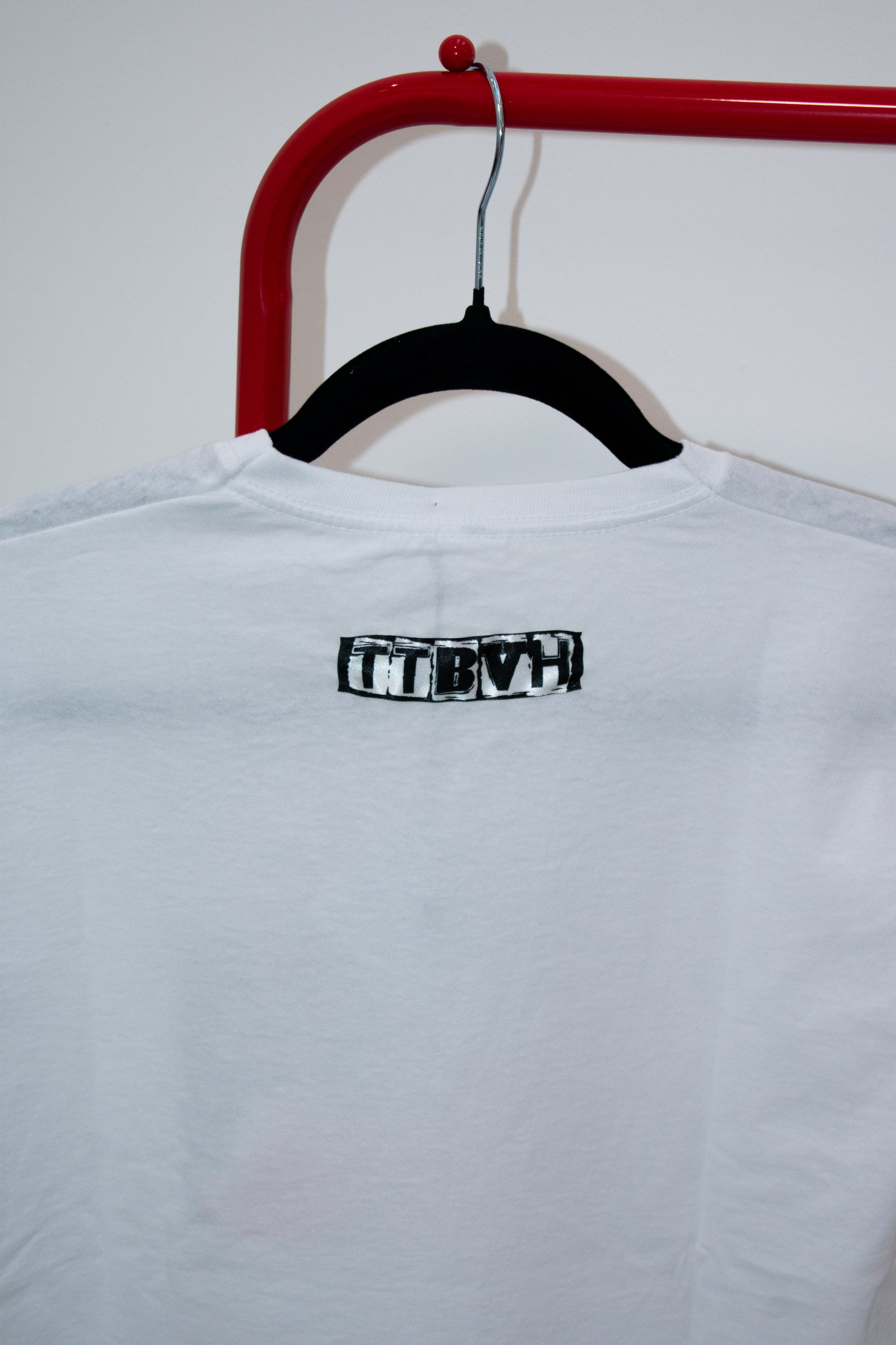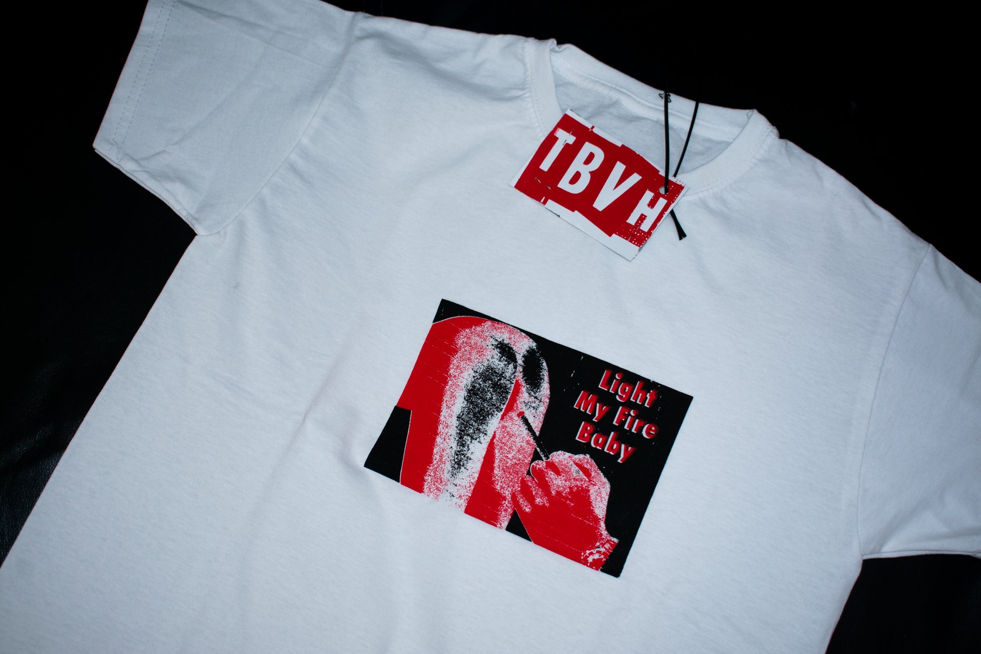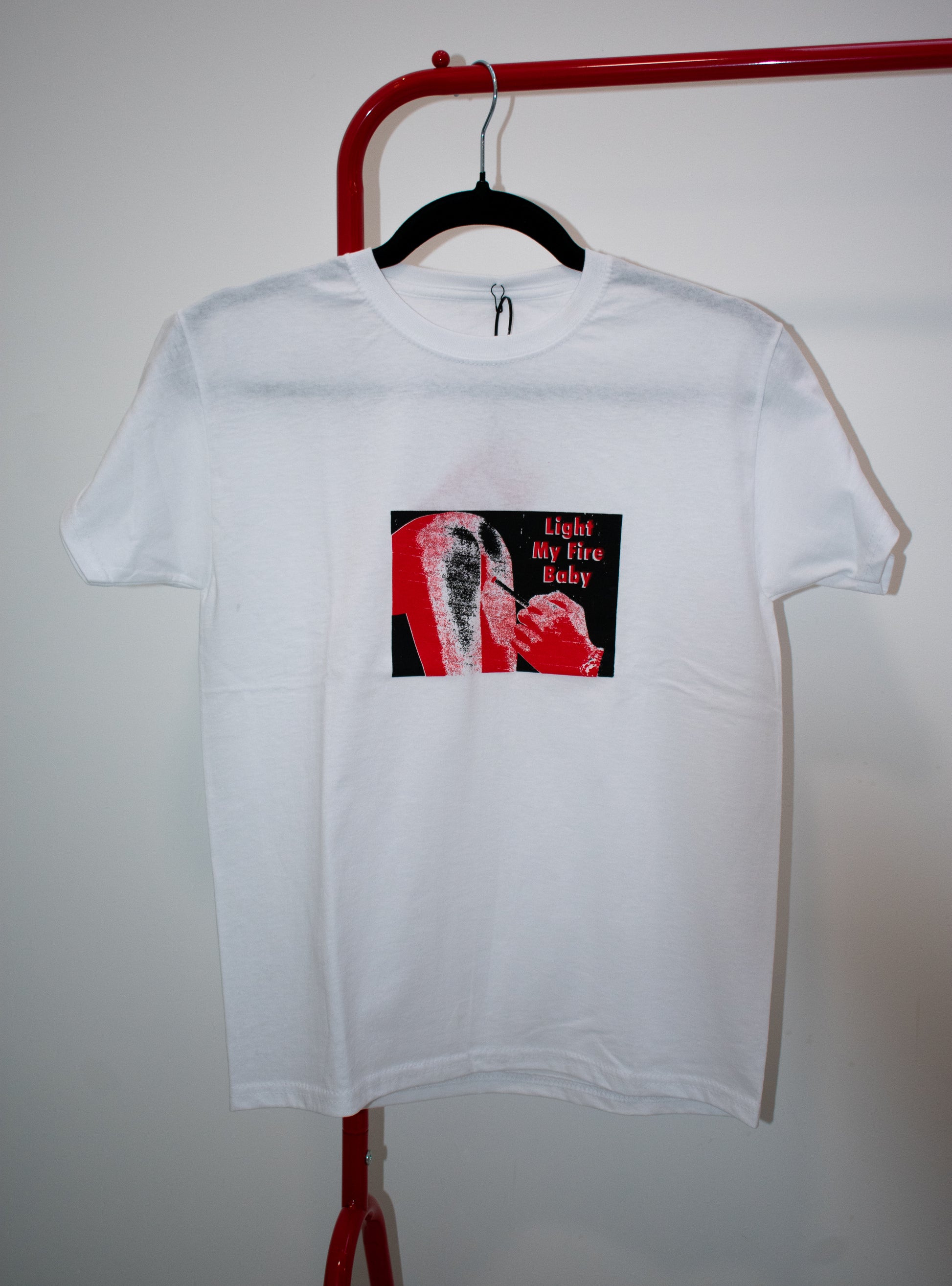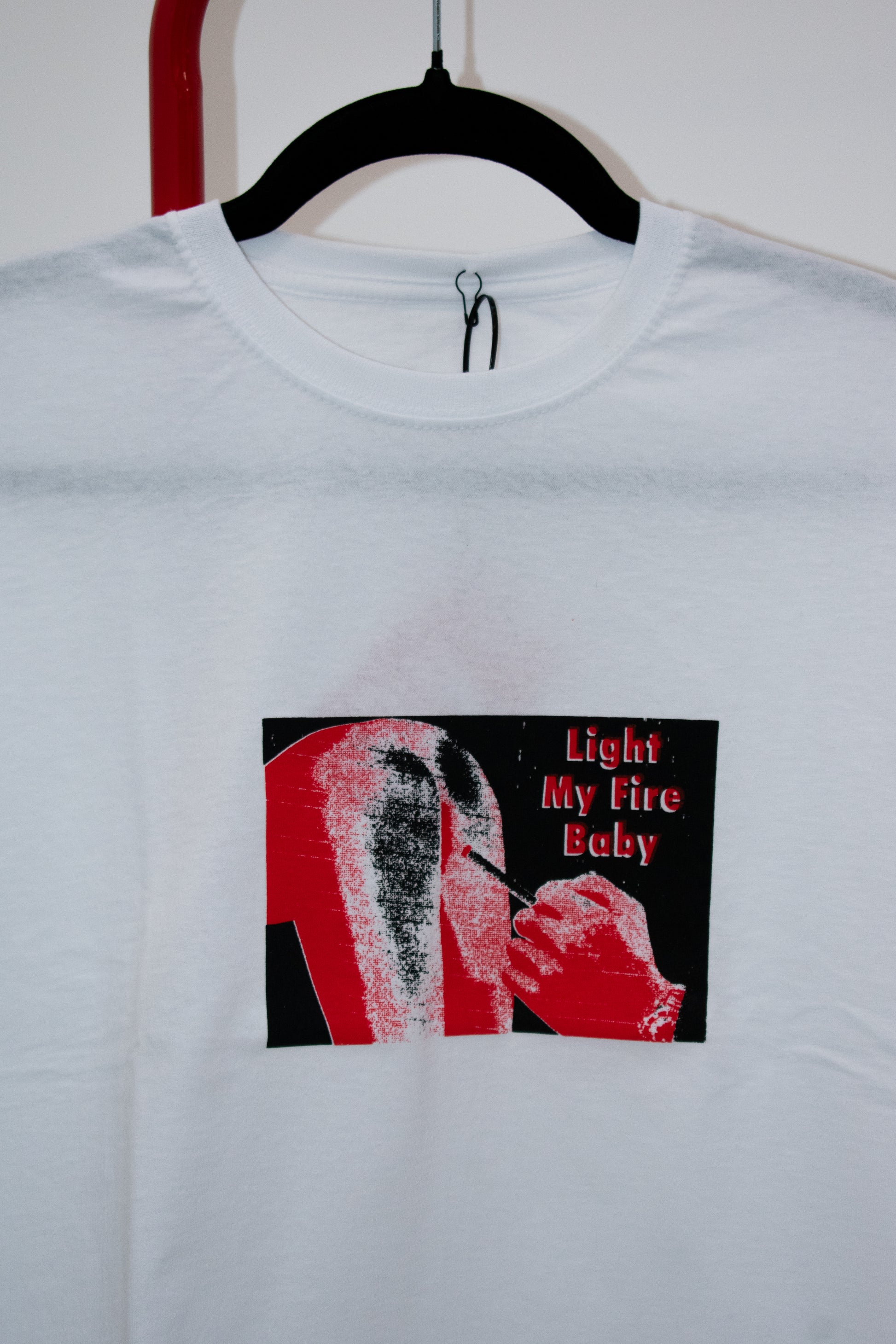 Light My Fire Baby screen print in black and red acrylic on a white t-shirt.