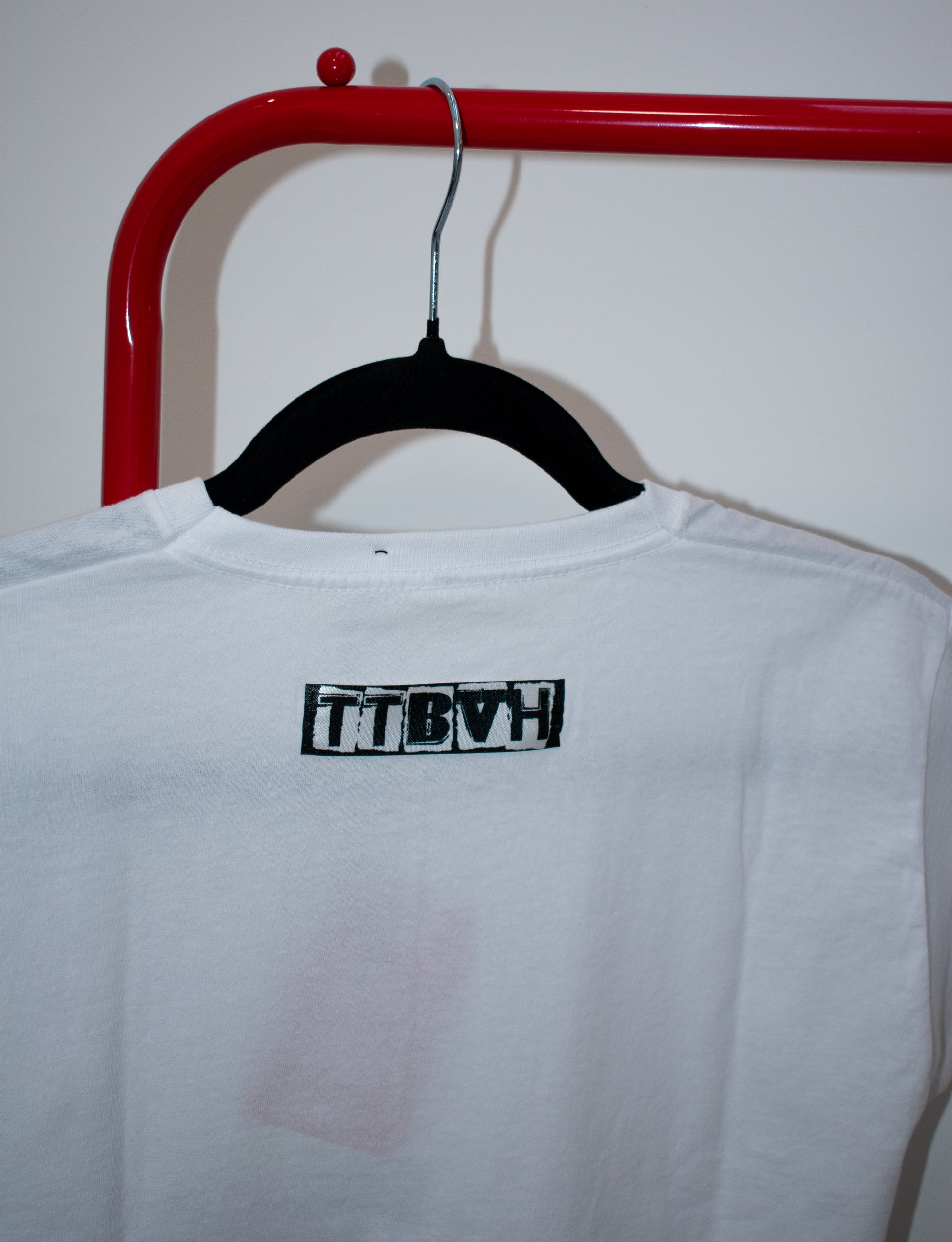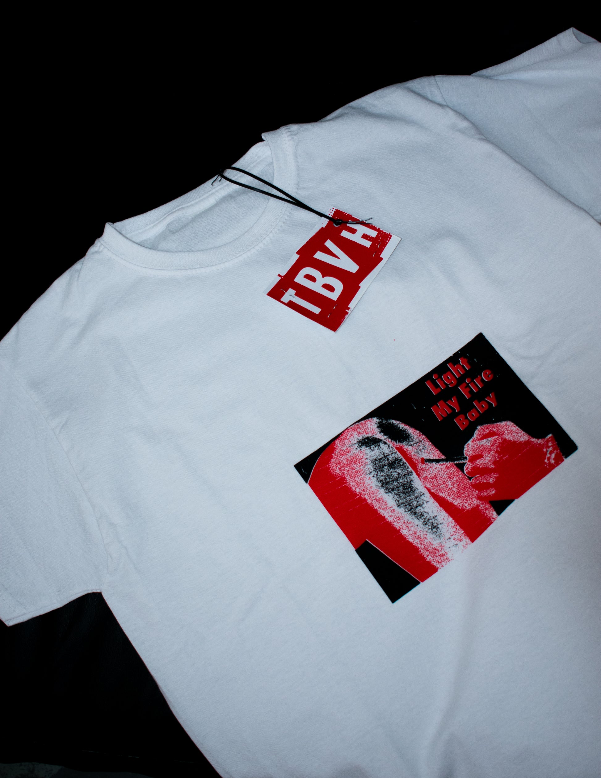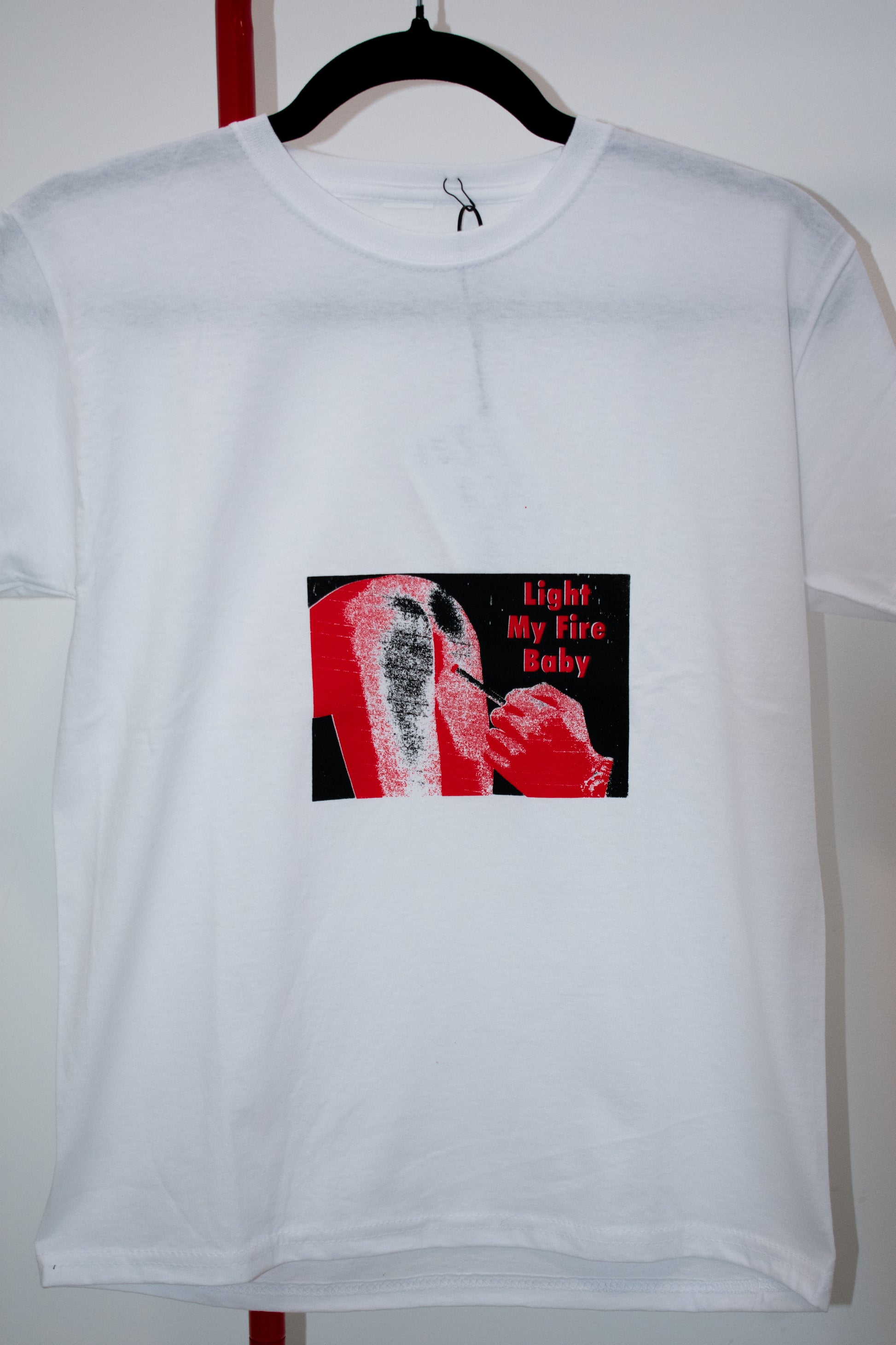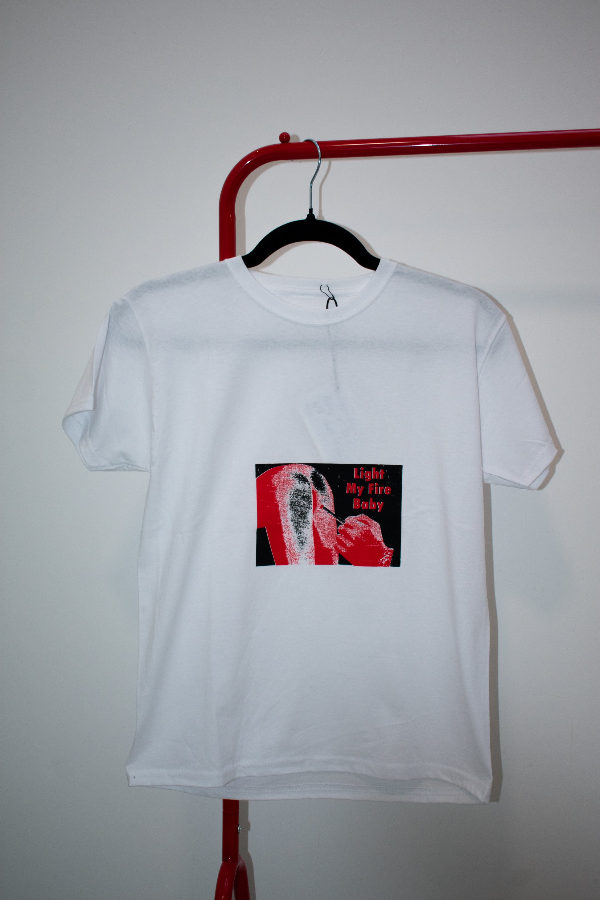 Light My Fire Baby screen print in black and red acrylic on a white t-shirt.