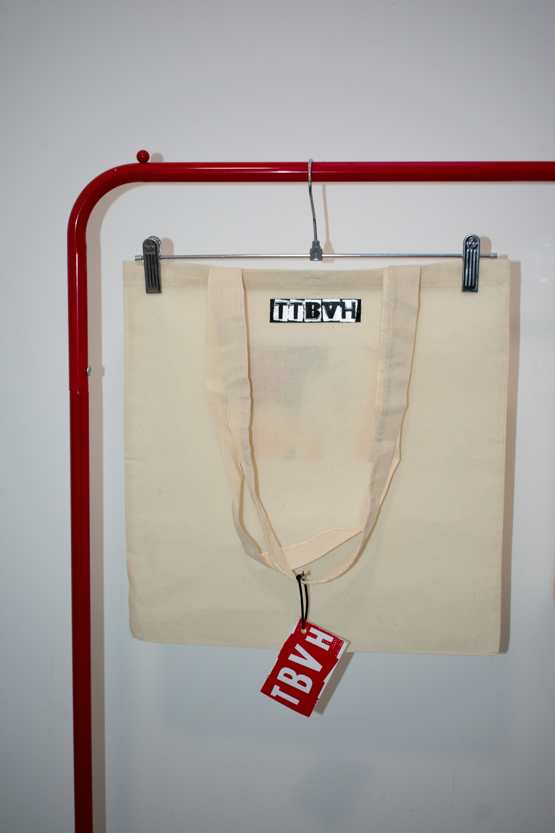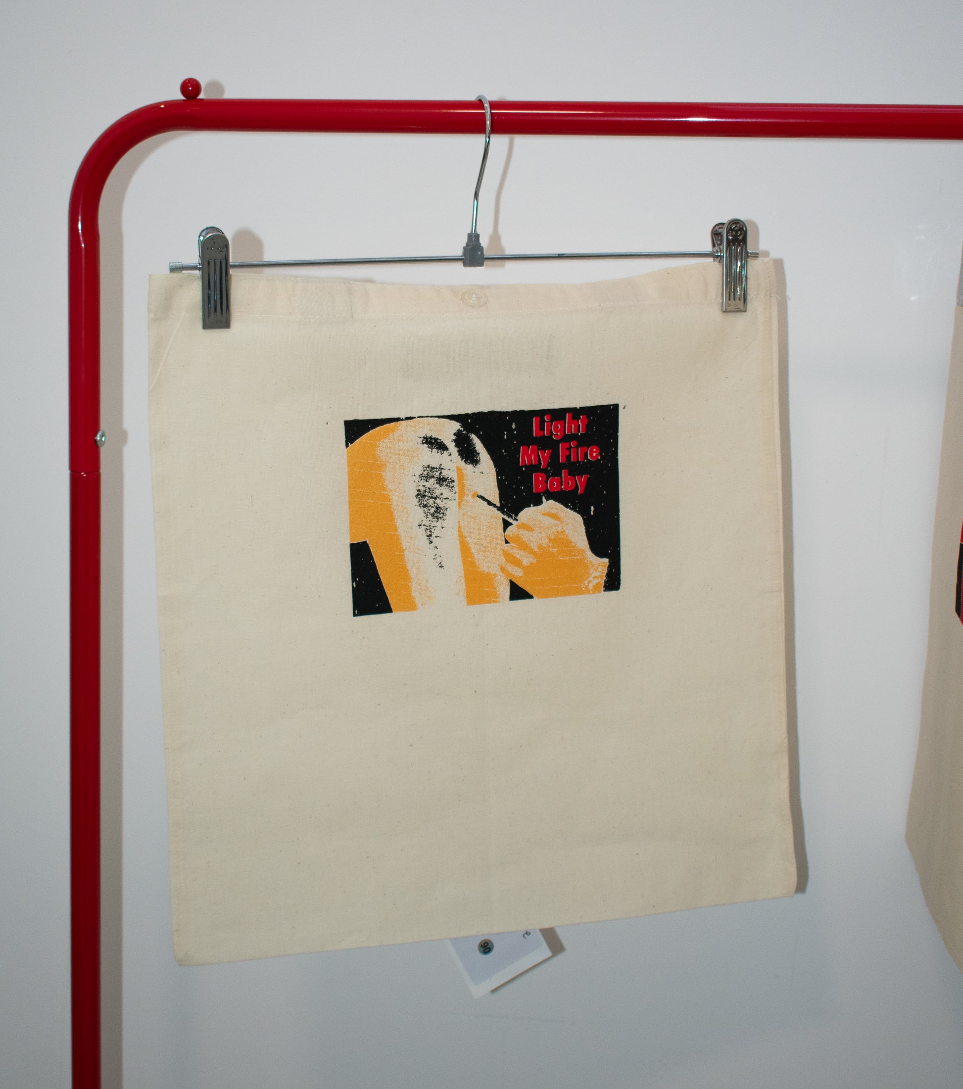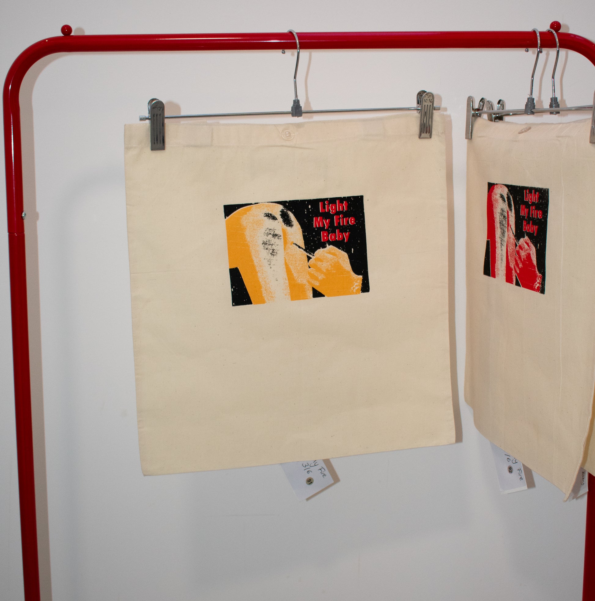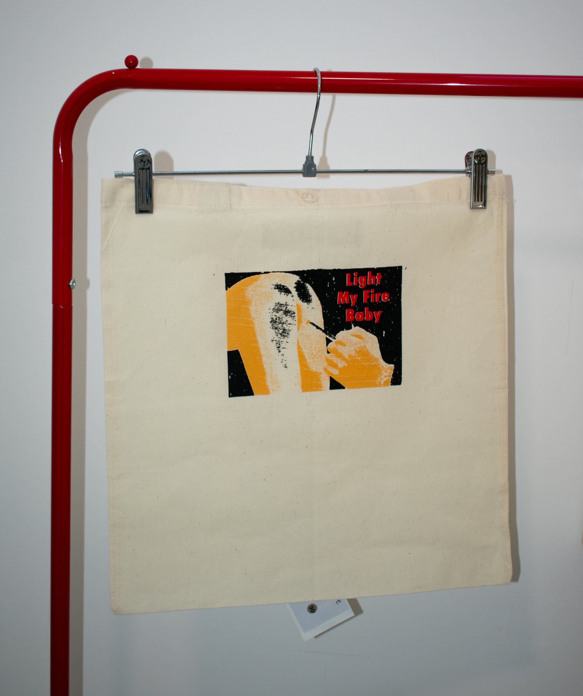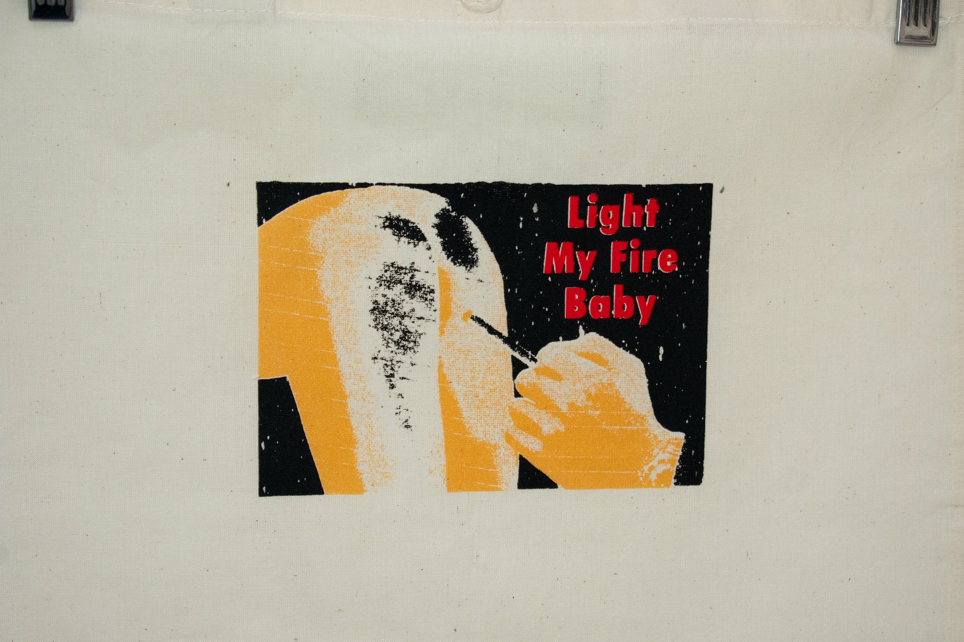 Light My Fire Baby screen print in black, red and gold acrylic on beige a tote bag.