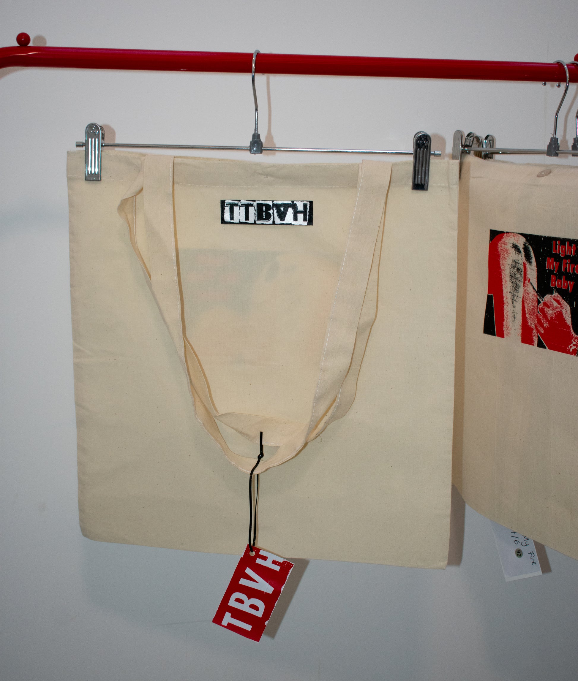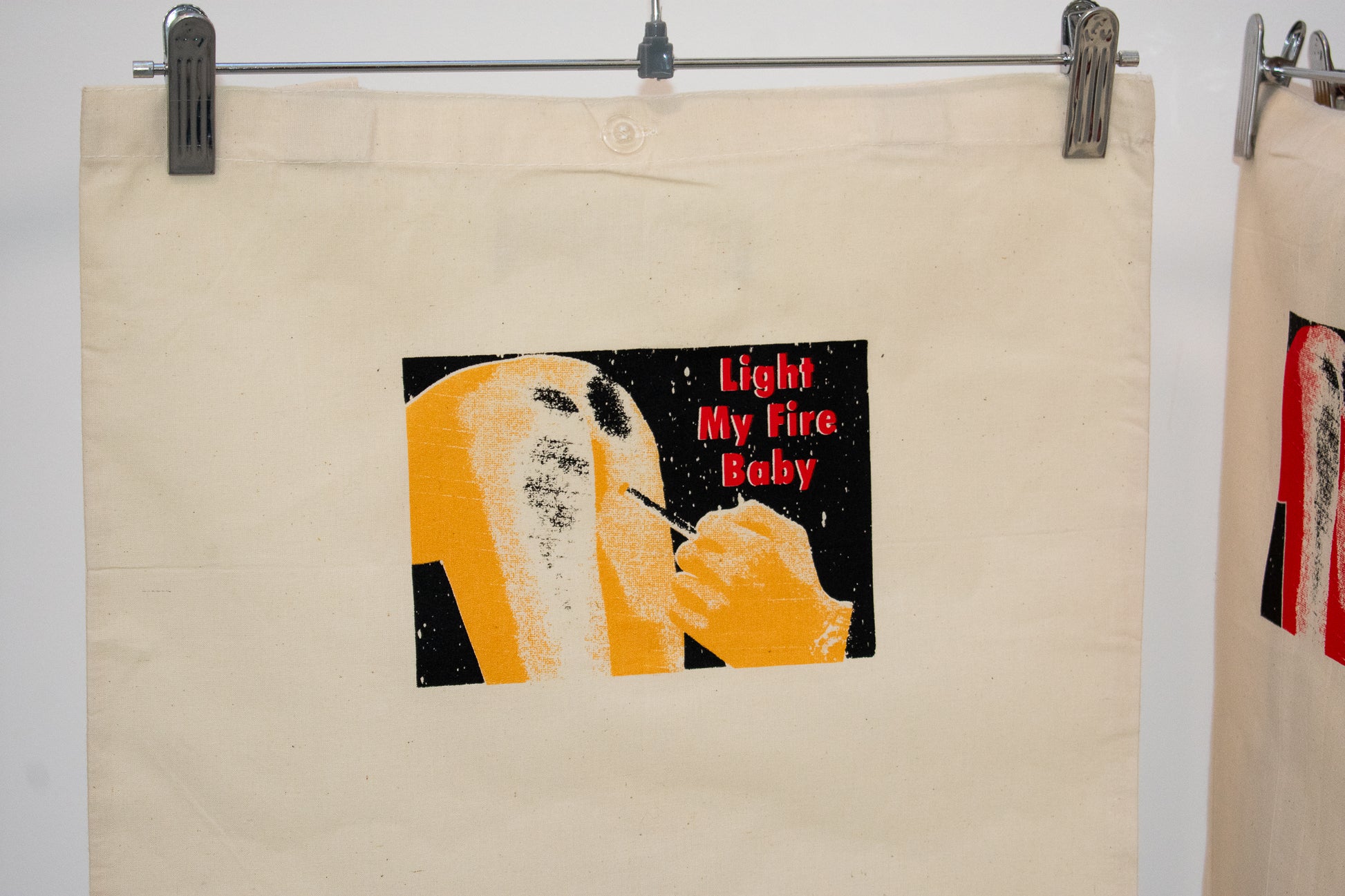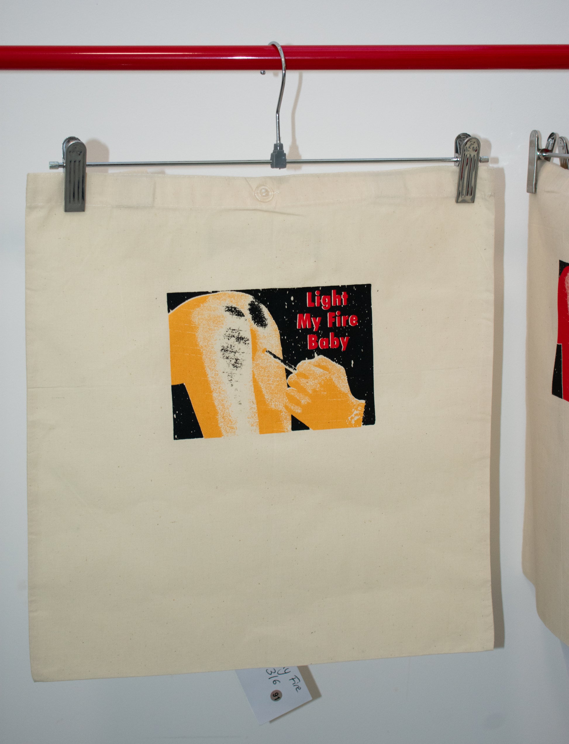 Light My Fire Baby screen print in black, red and gold acrylic on beige a tote bag.