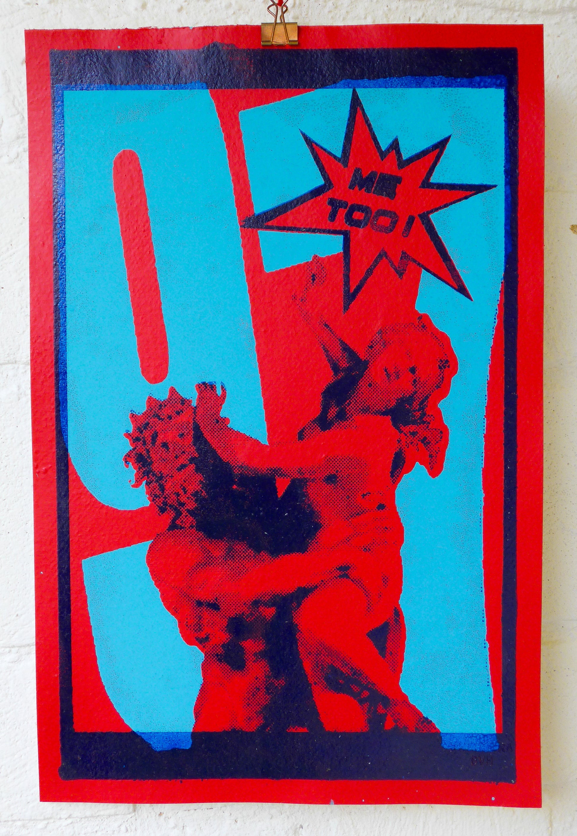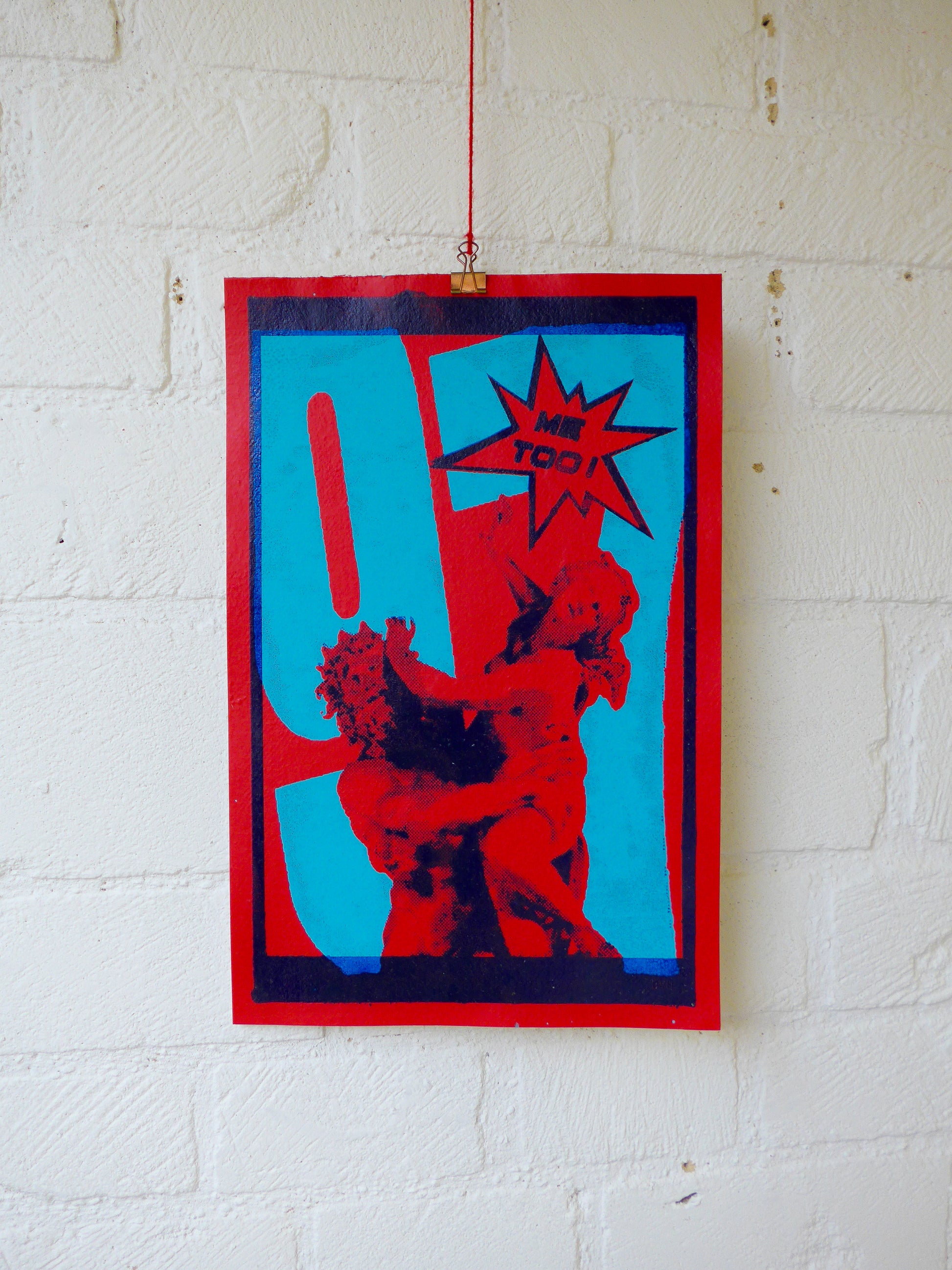 Proserpina, 97 Screen Print in Light Blue and Dark Blue Ink on Red Spray-painted Recycled Cotton Rag Card.