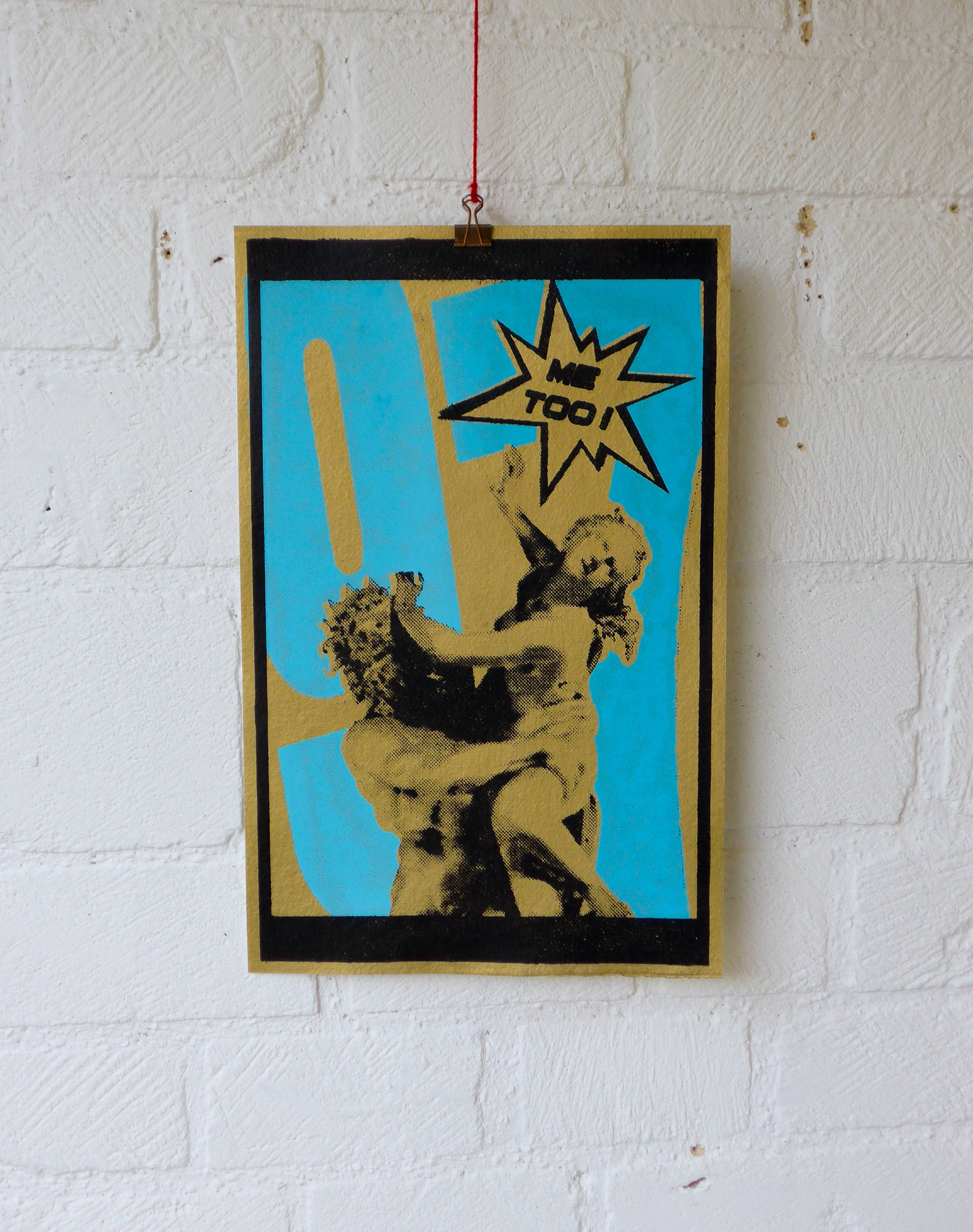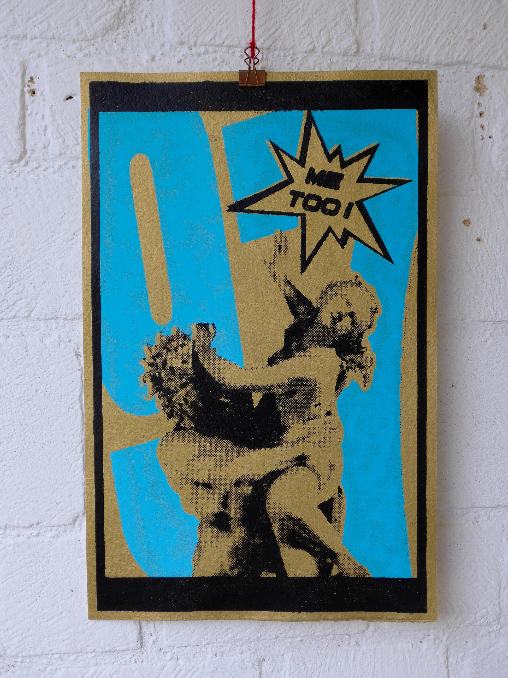 Proserpina, 97 Screen Print in Light Blue and Black Ink on Gold Spray-painted Recycled Cotton Rag Card.