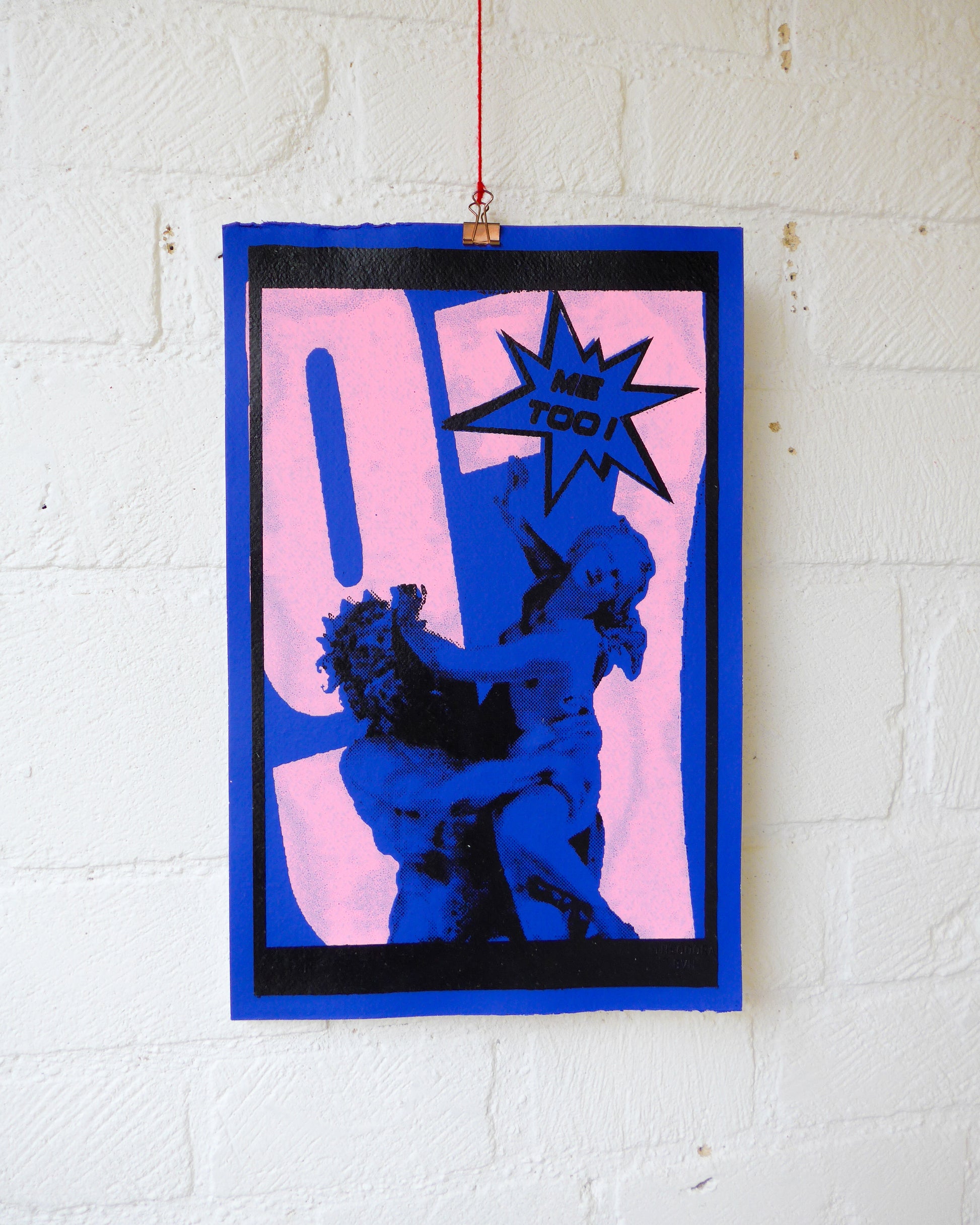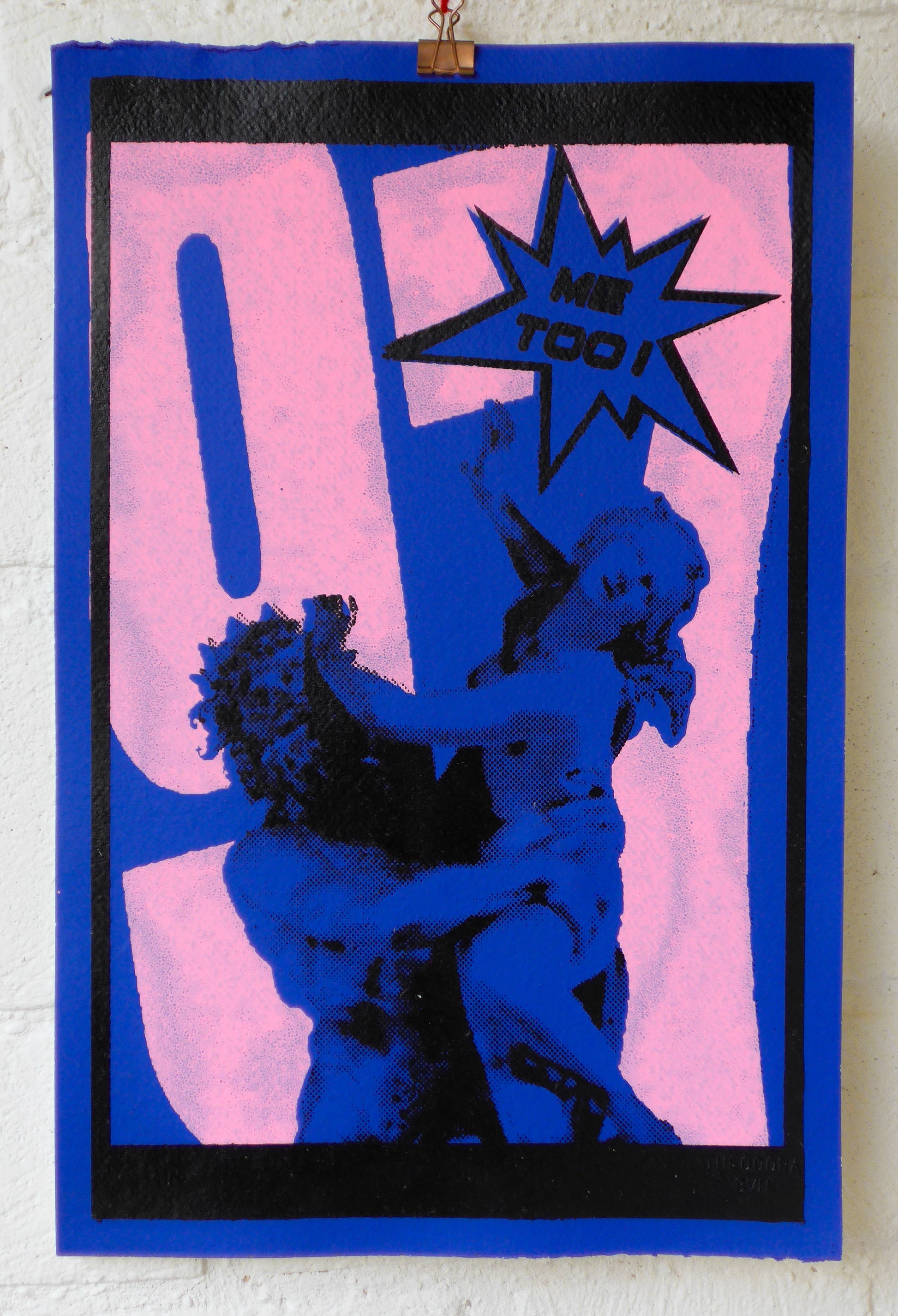 Proserpina, 97 Screen Print in Light Pink and Black Ink on Blue Spray-painted Recycled Cotton Rag Card.