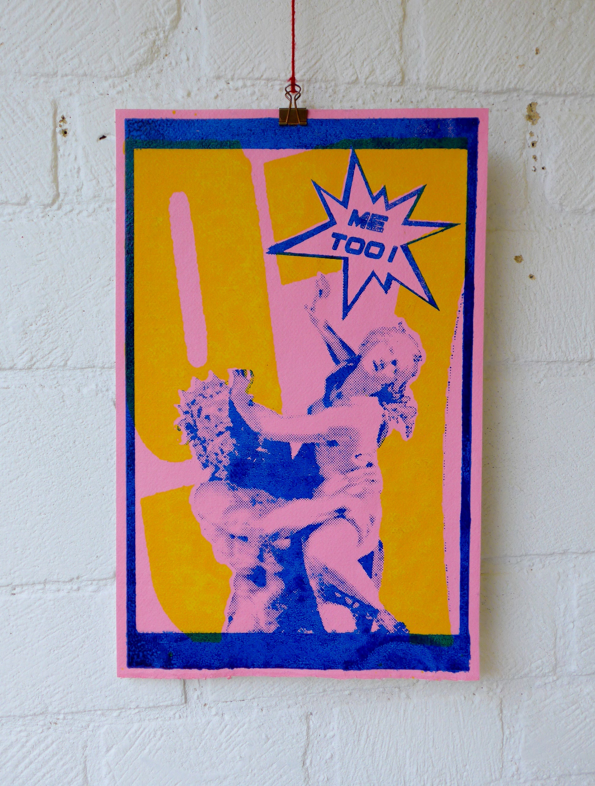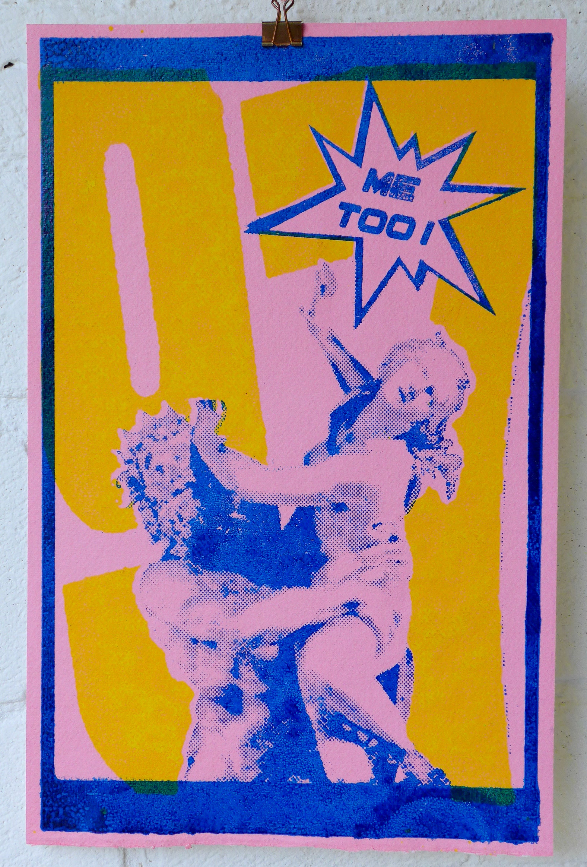 Proserpina, 97 Screen Print in Dark Blue and Yellow Ink on Pink Spray-painted Recycled Cotton Rag Card.