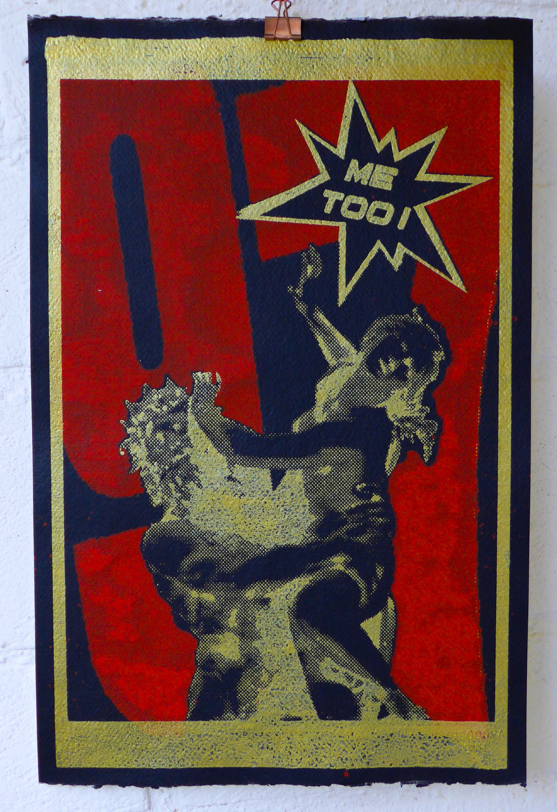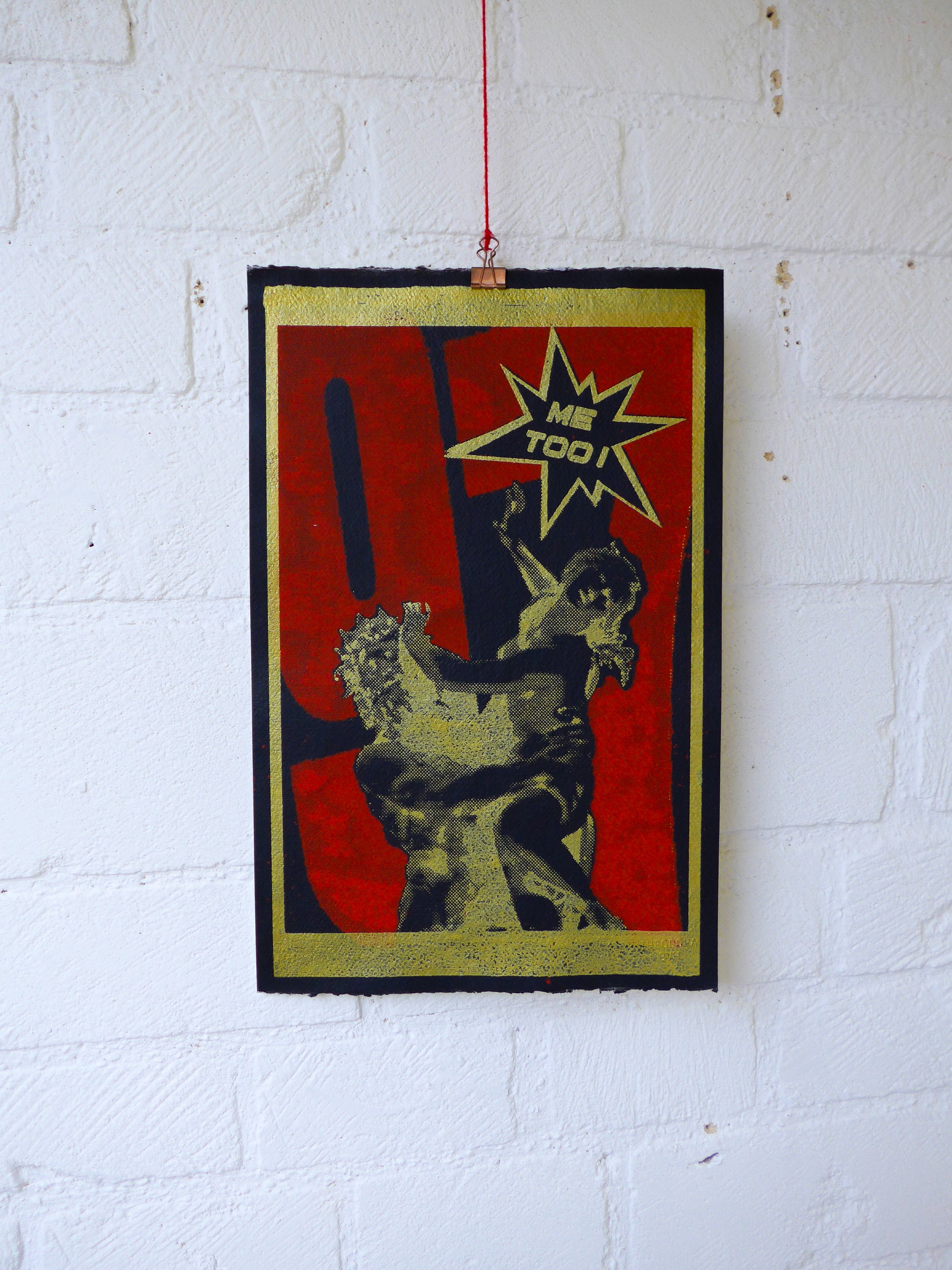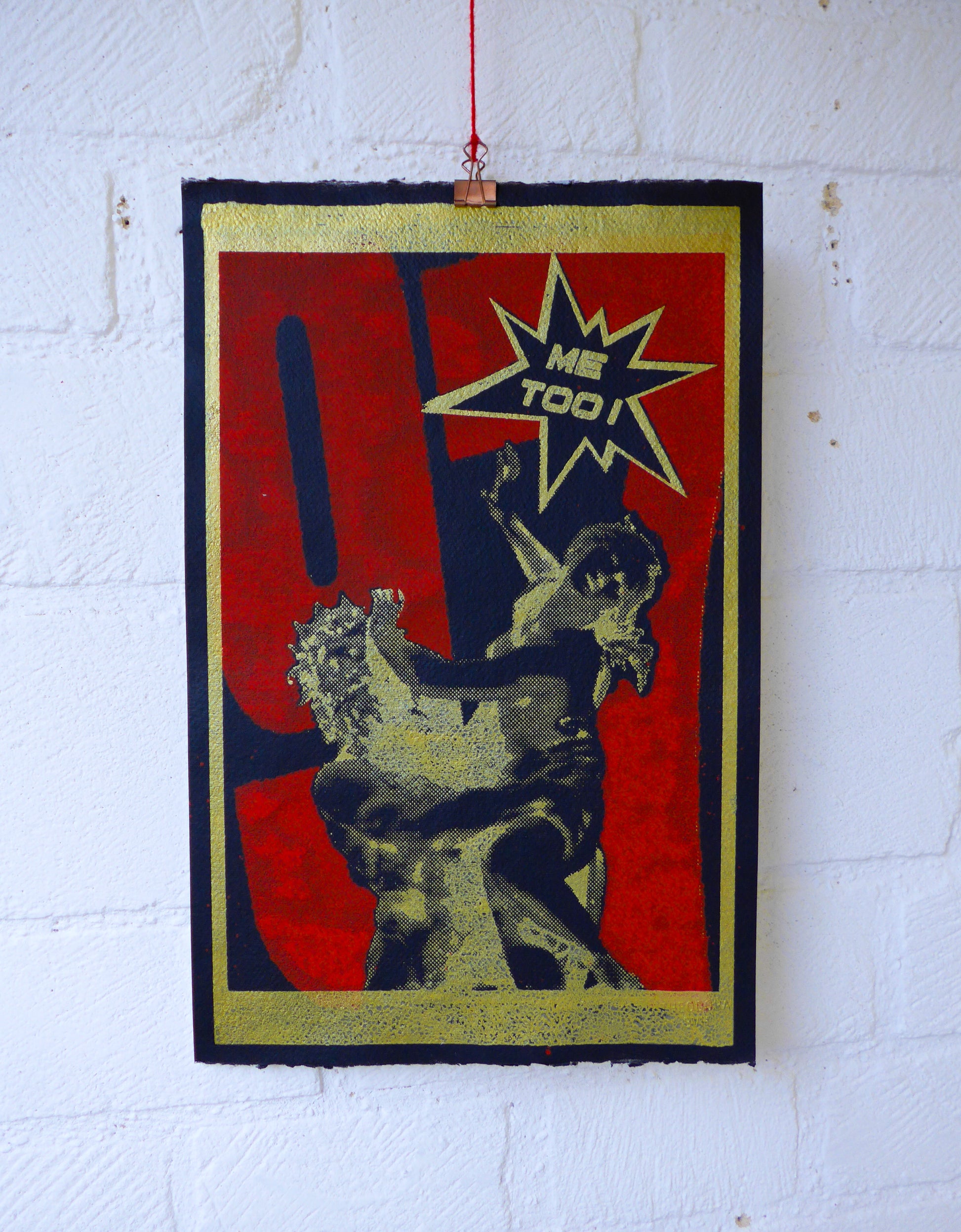 Proserpina, 97 Screen Print in Red and Gold Ink on Black Spray-painted Recycled Cotton Rag Card.