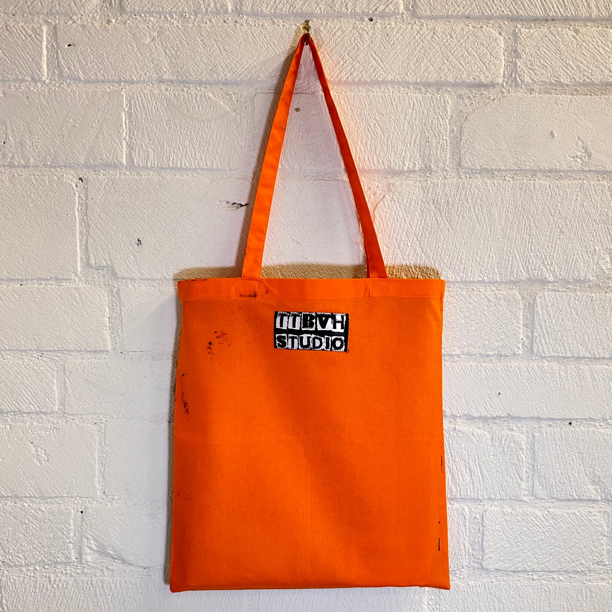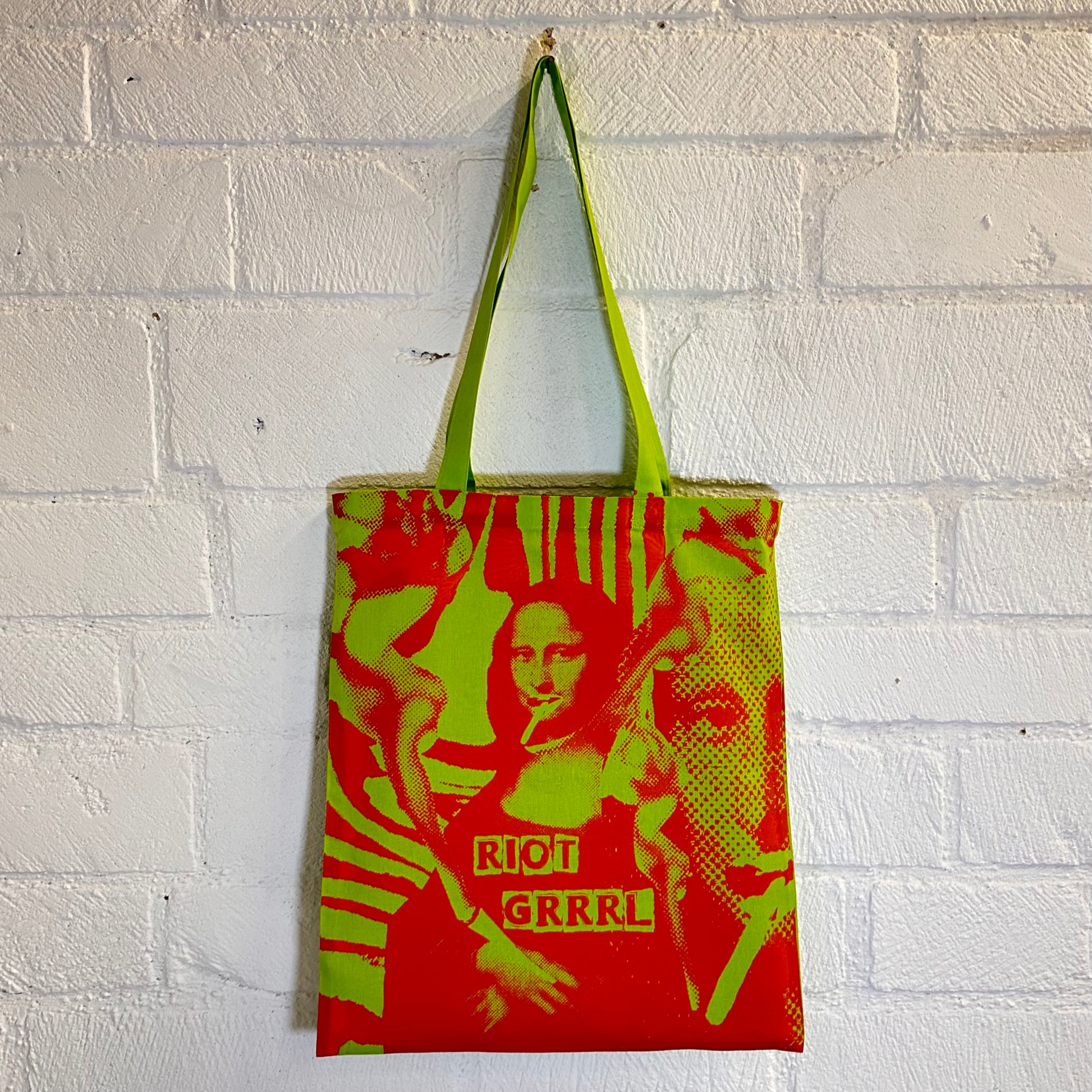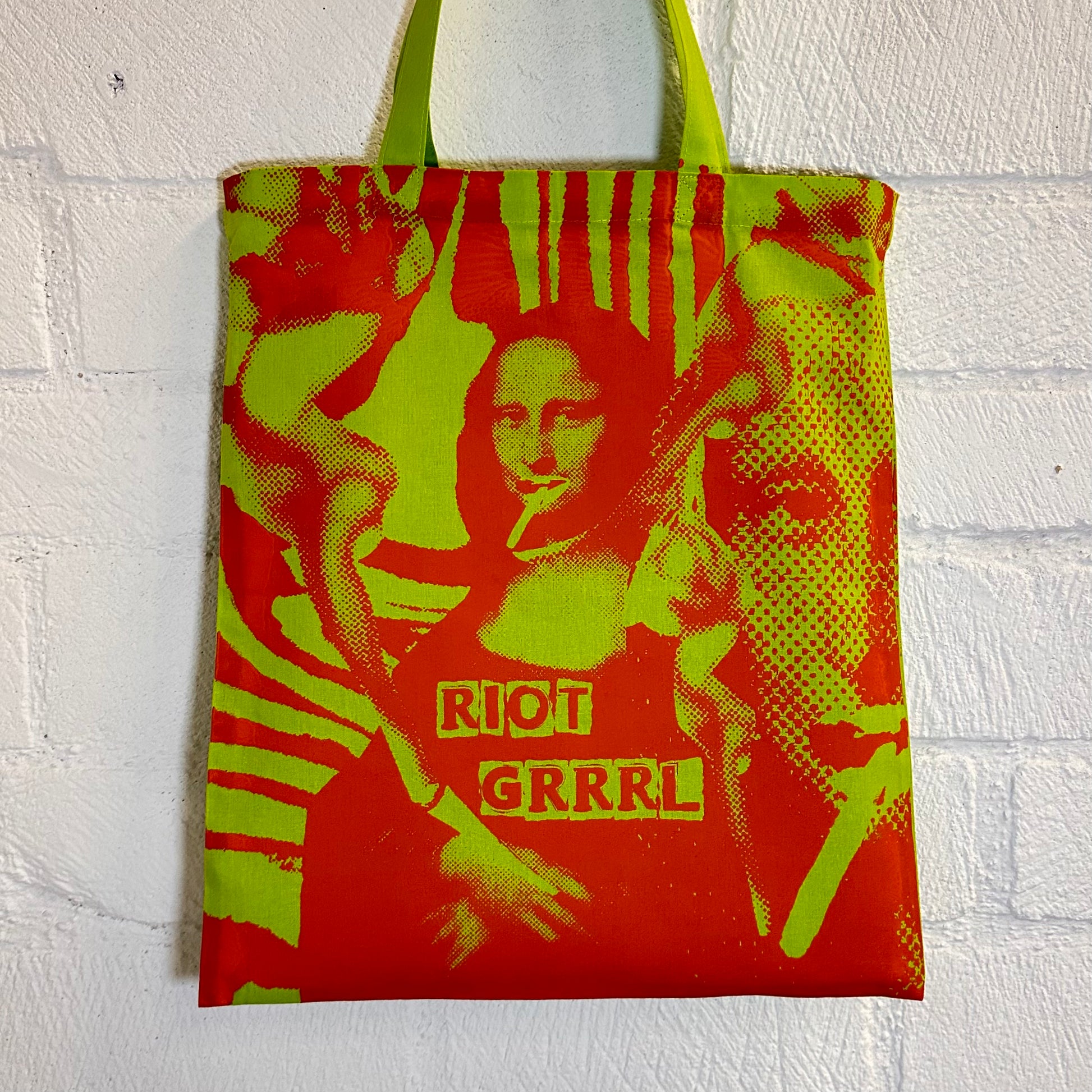 Bright green tote bag with Riot Grrrl Mona screen print in orange ink. (Images make orange ink appear more red looking)
