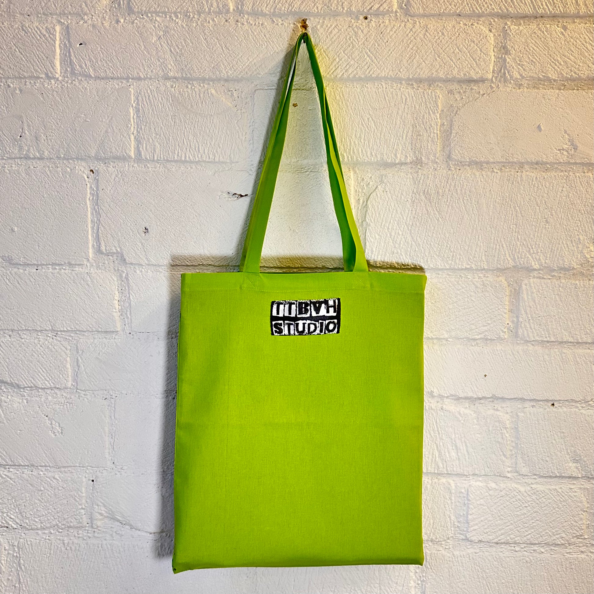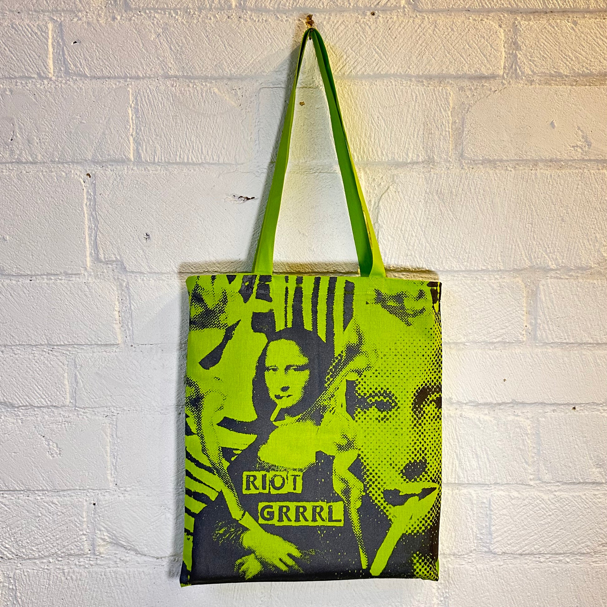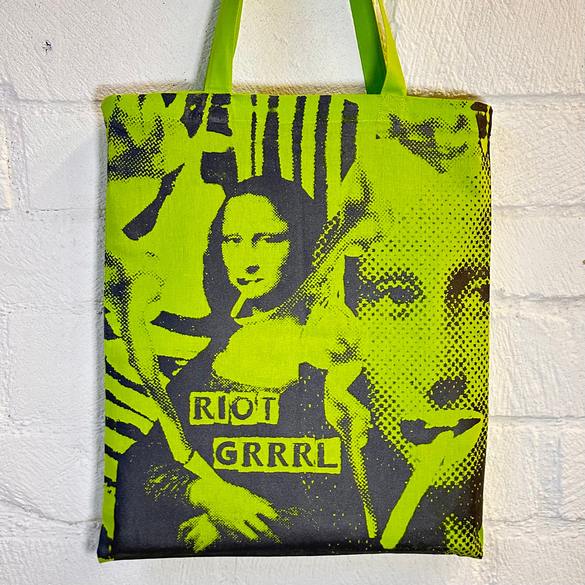 Bright green tote bag with Riot Grrrl Mona screen print in black ink.