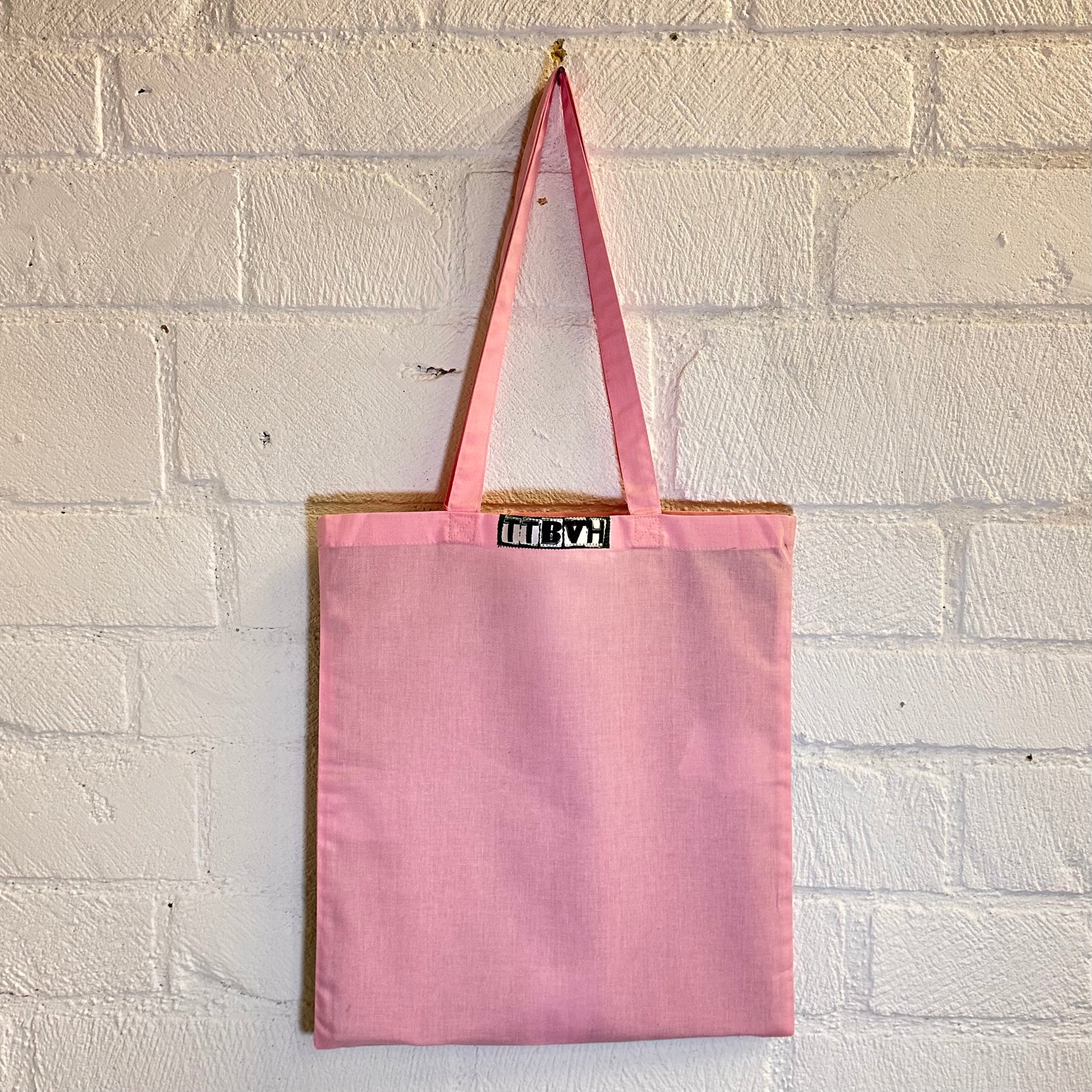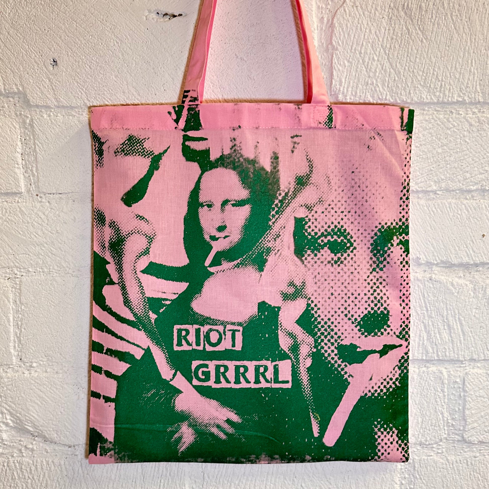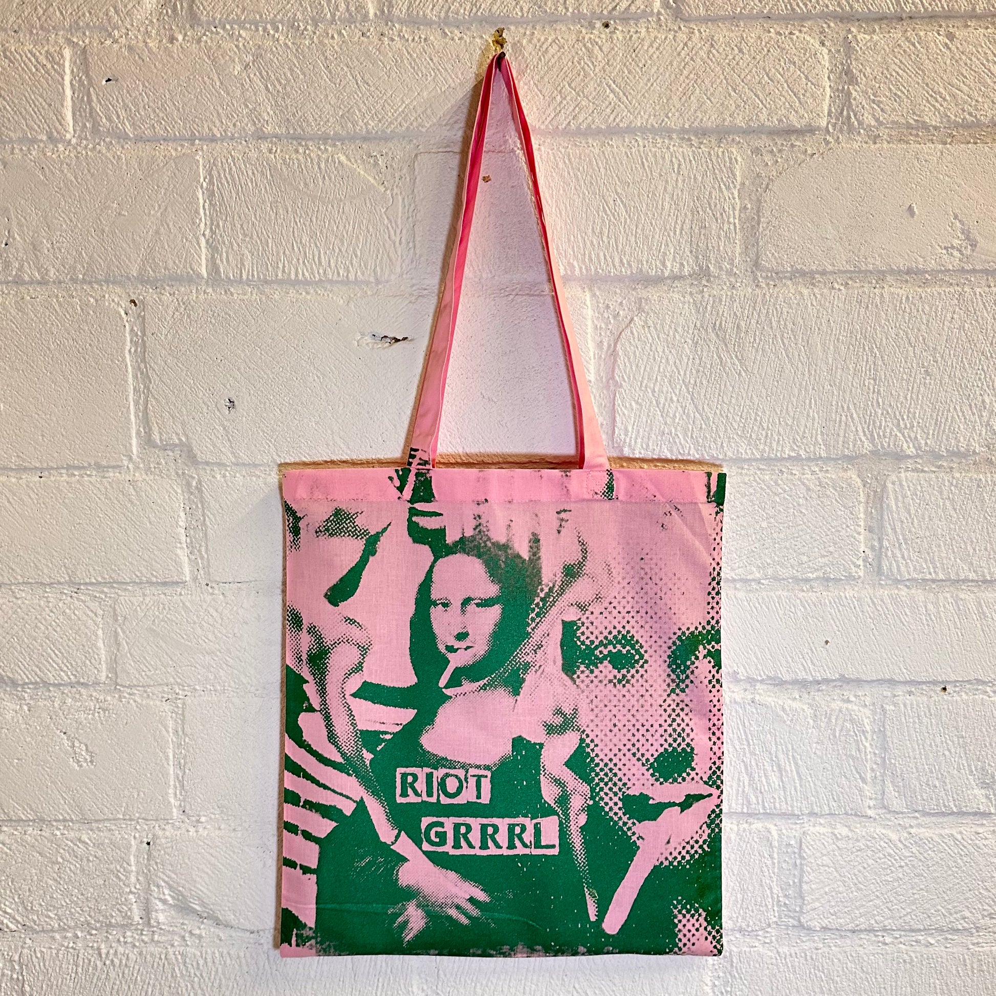 Baby pink tote bag with Riot Grrrl Mona screen print in metallic green ink.