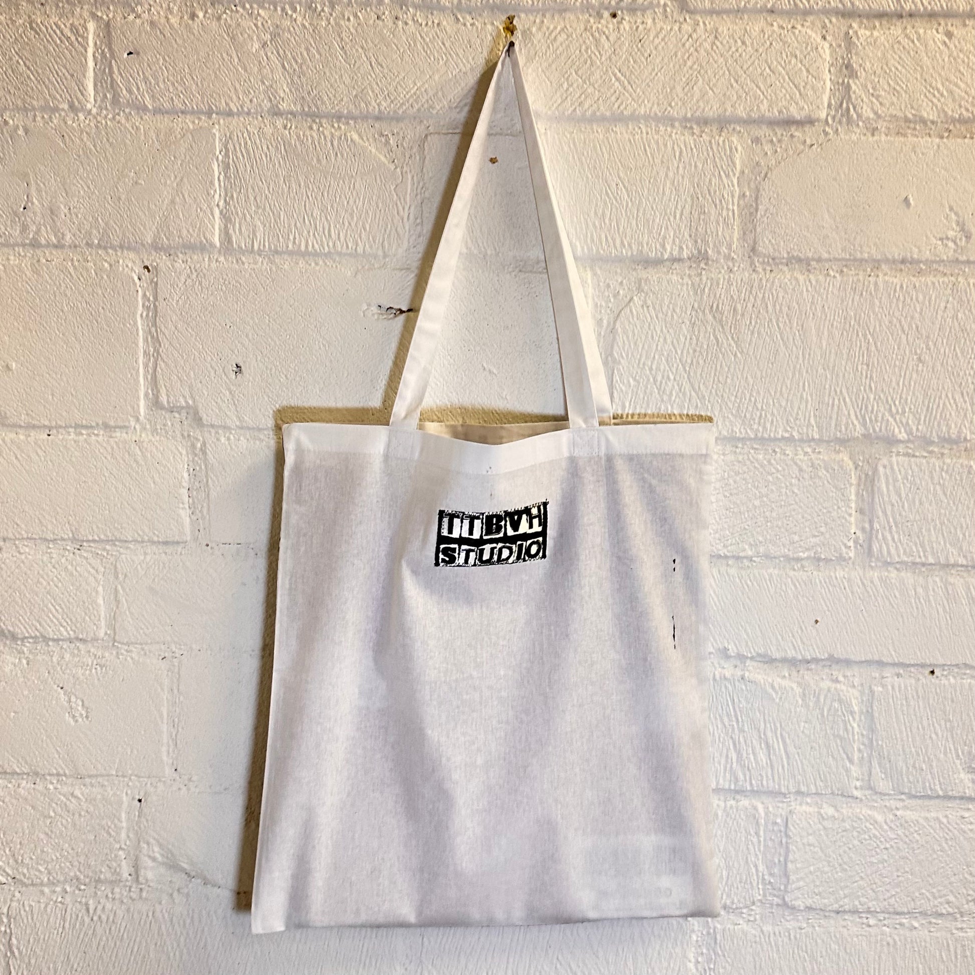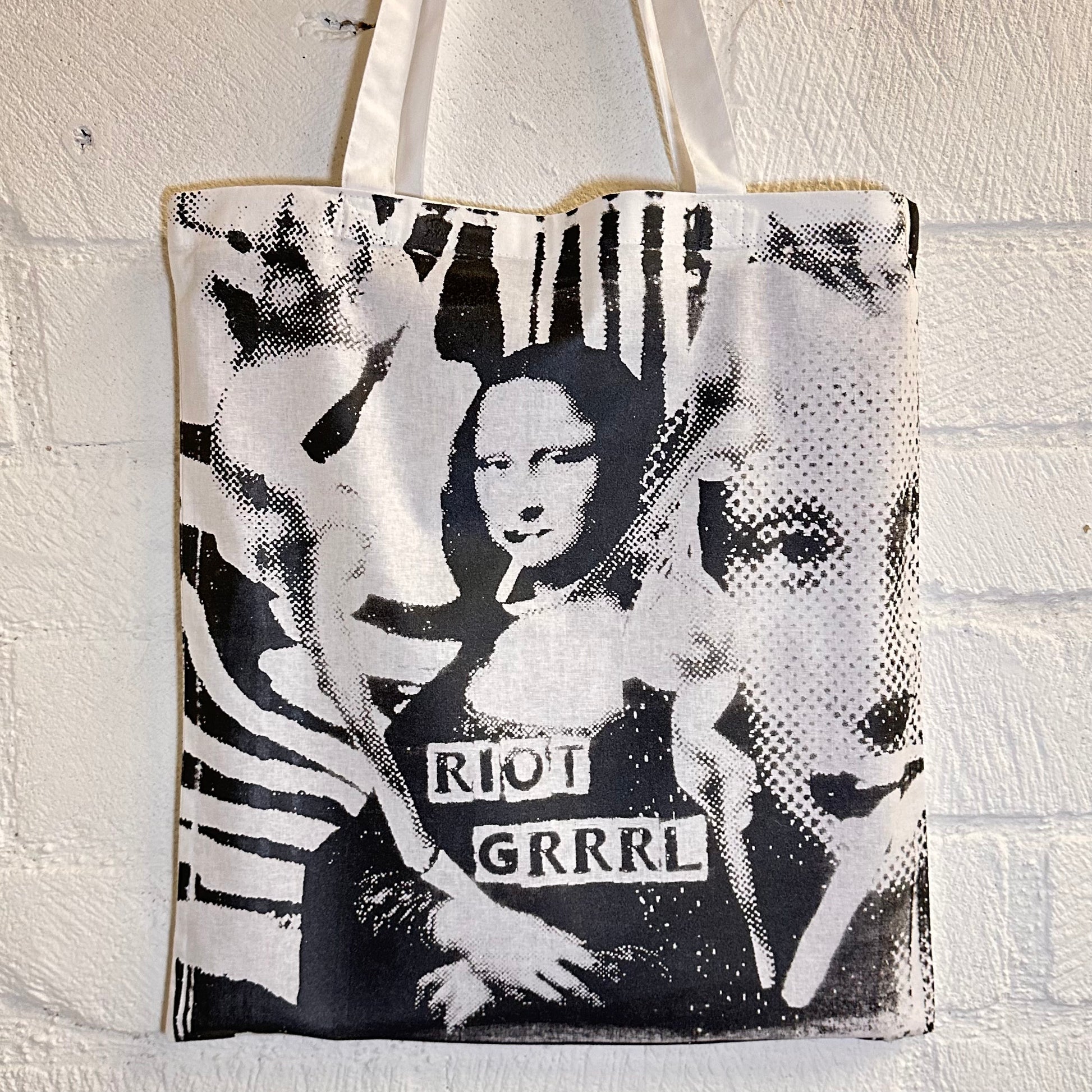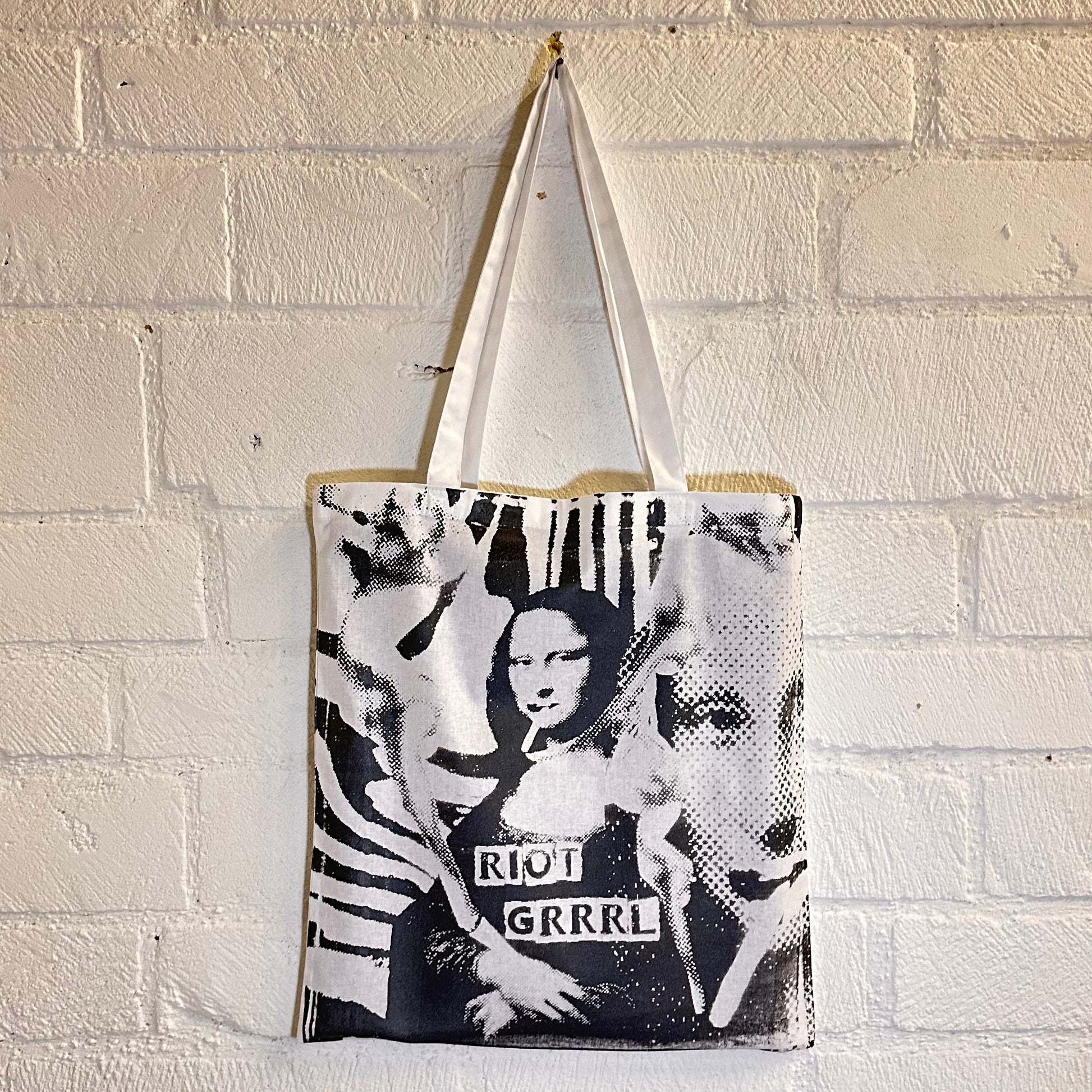 White tote bag with Riot Grrrl Mona screen print in metallic grey/black ink.