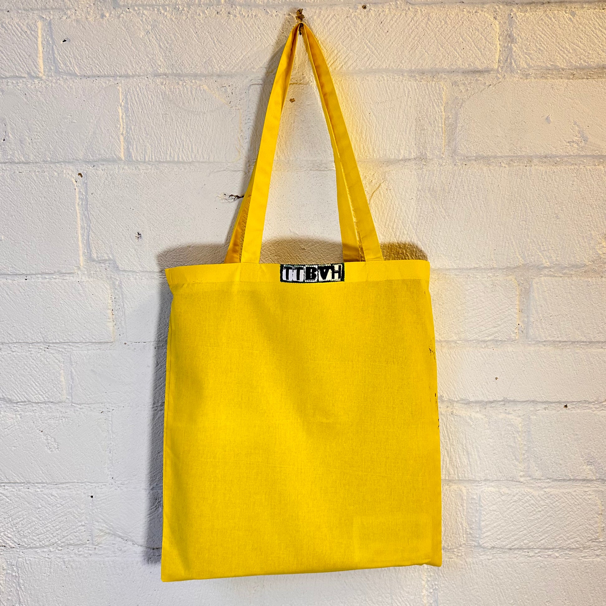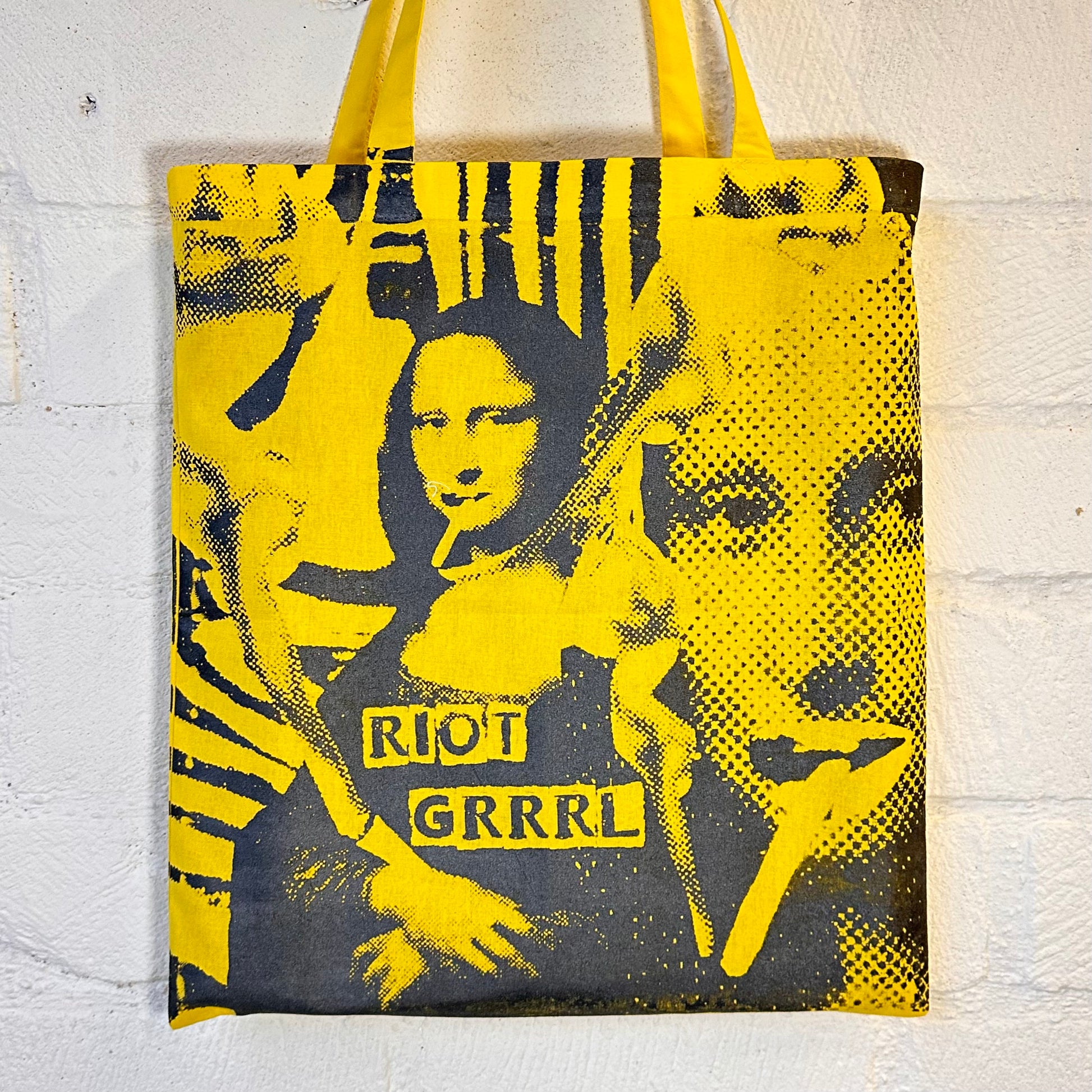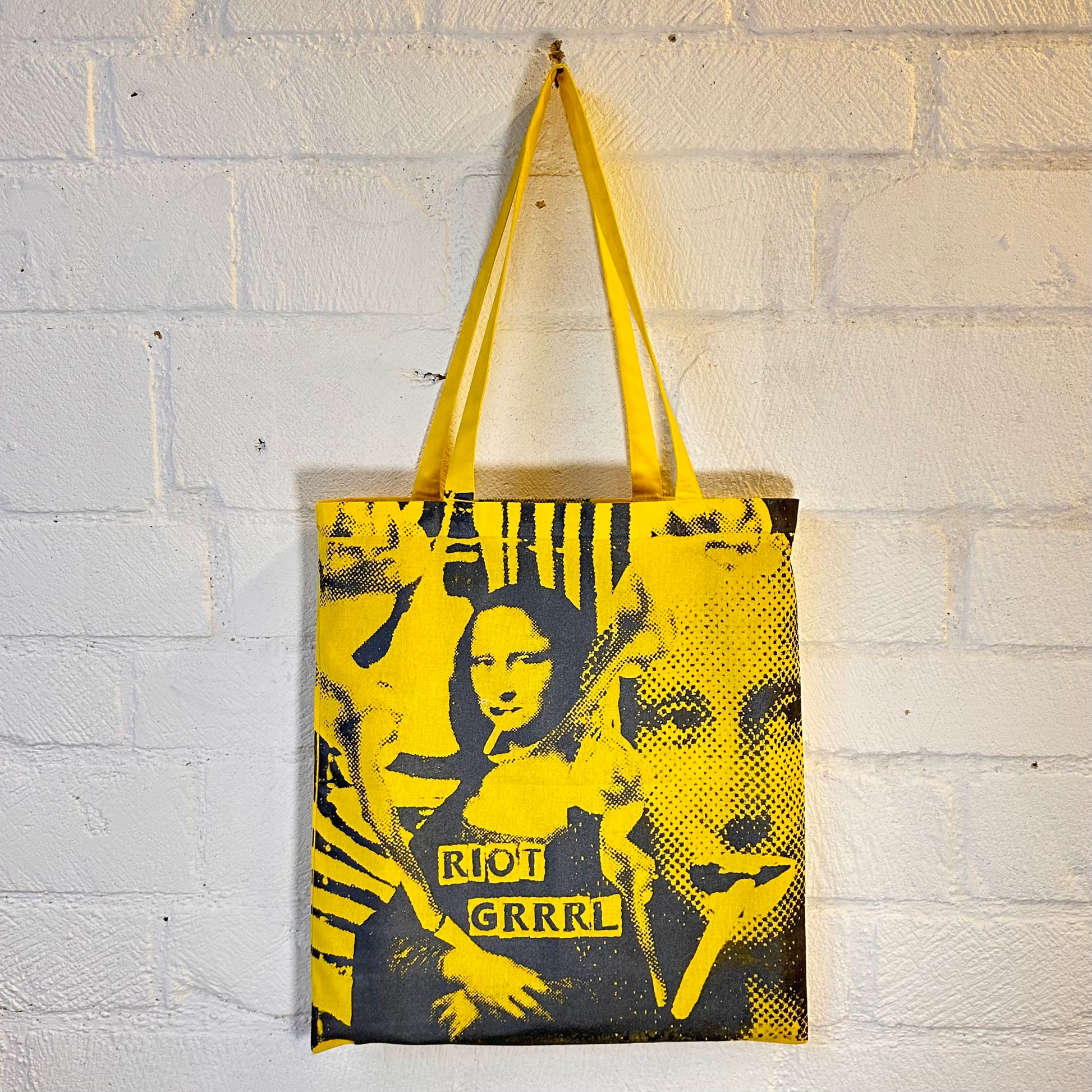 Yellow tote bag with Riot Grrrl Mona screen print in black ink.